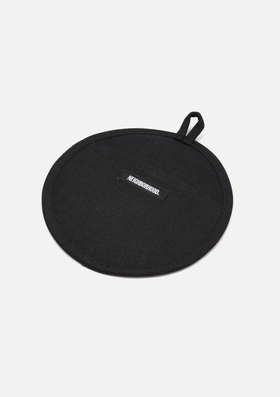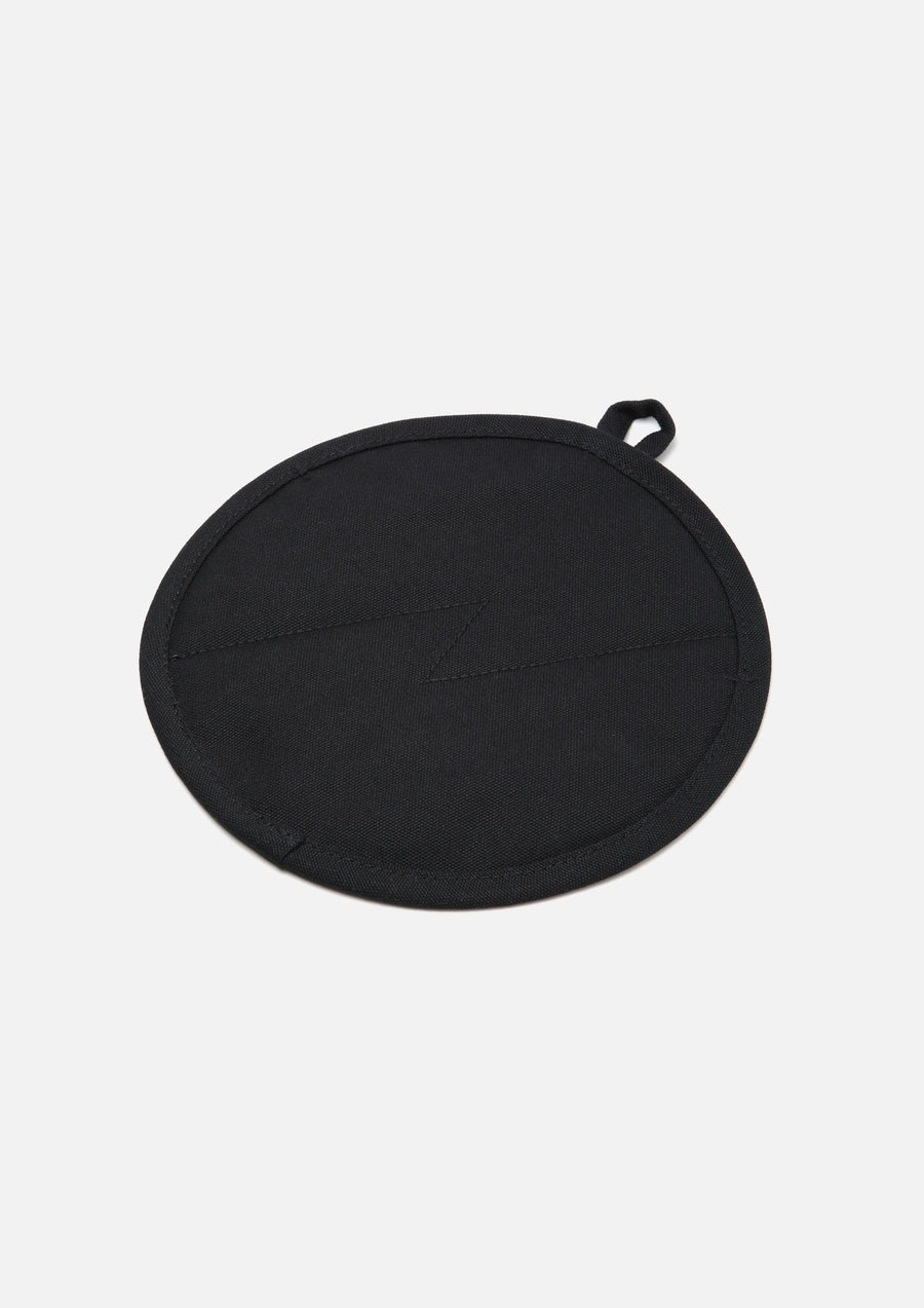 A cotton canvas oven mitt that also functions as a trivet. Features embroidered "N"-shaped stitching and an inner brand tag.