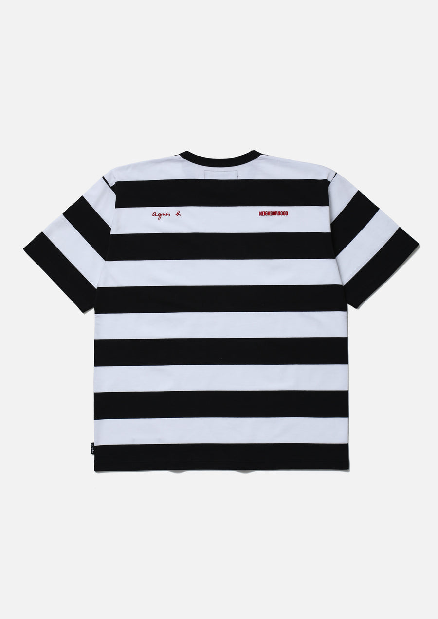 Striped tee in agnès b.’s original wide-stripe jersey. Dual-brand logo embroidery at the back. Brand tags at the left hem and side seam.