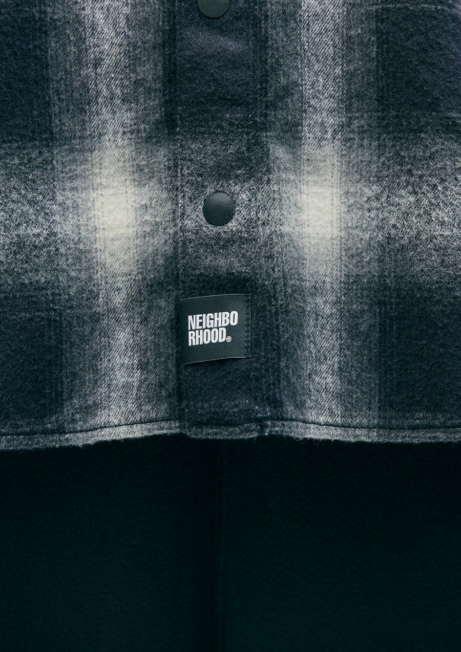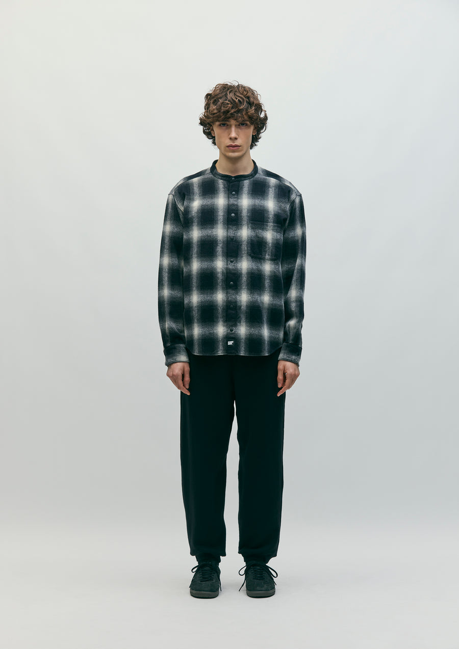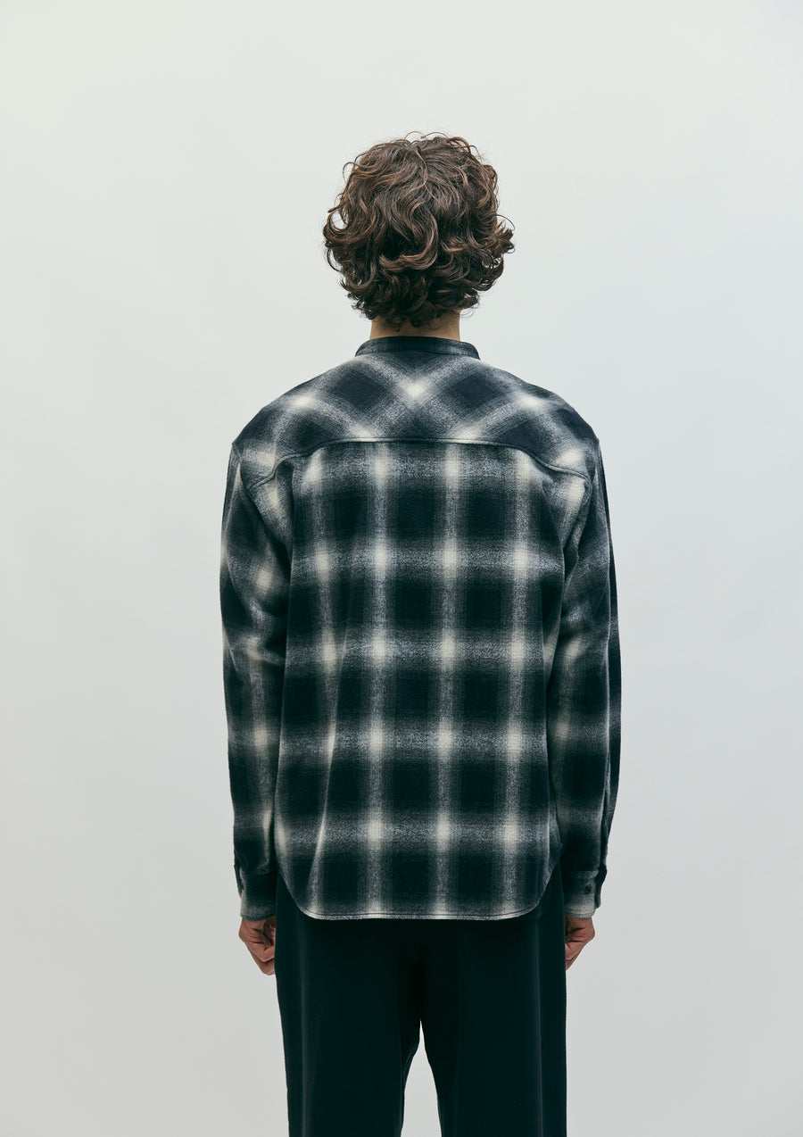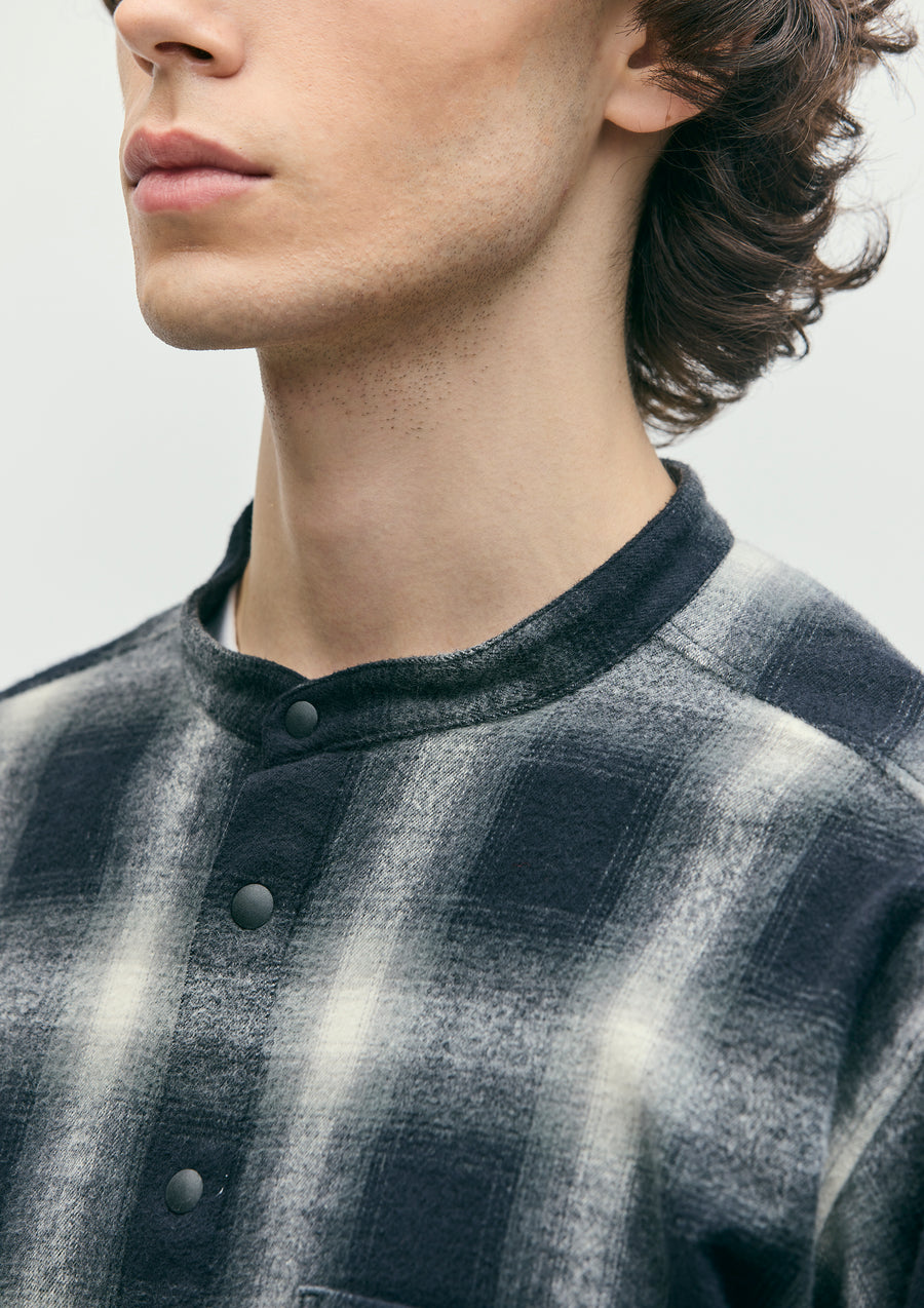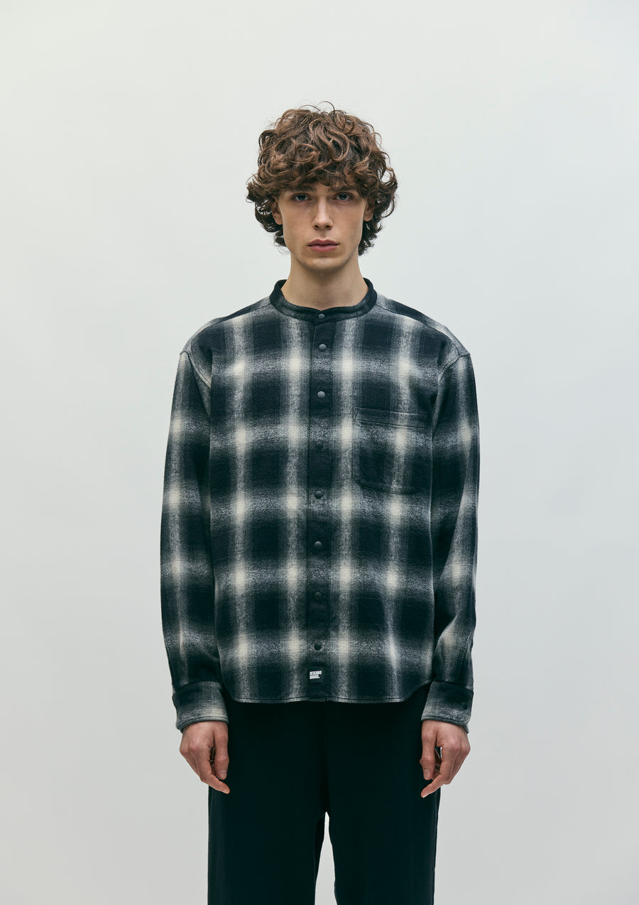 A stand-collar check shirt made from plain-weave ombré check fabric with a shaggy brushed finish. The front features plastic dot buttons. A brand tag is attached to the placket and side seam. One-wash finish.