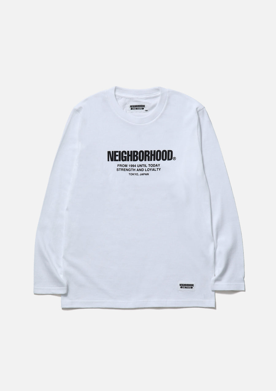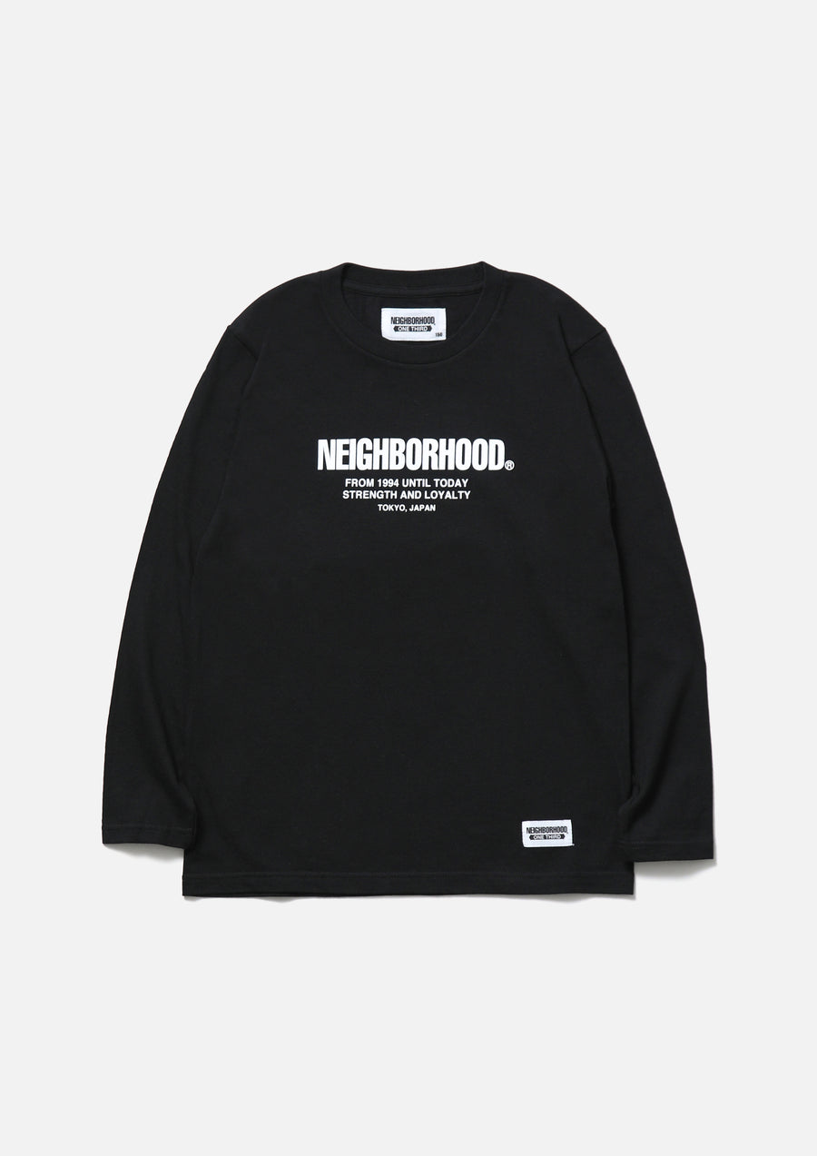 A long-sleeve T-shirt made of a 5.6oz heavyweight body. Printed logo on the front. A name tag is placed on the left hem.