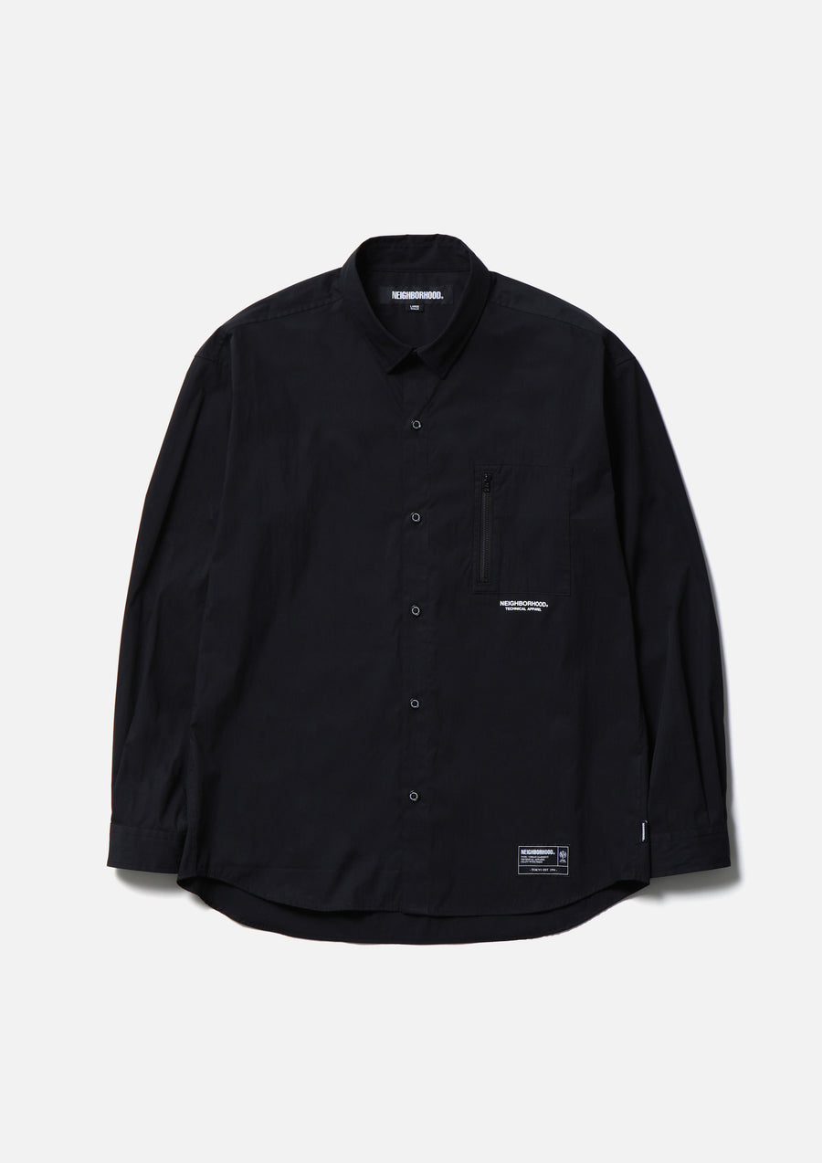 A plain shirt made from a high-density cotton/nylon-blend typewriter fabric. The surface is brushed and bio-processed for a unique texture. Features a zippered pocket on the left chest with a printed logo below. Equipped with original four-hole buttons, a brand tag on the left hem and side seam. The silhouette is shorter than a standard plain shirt. One-wash finish.