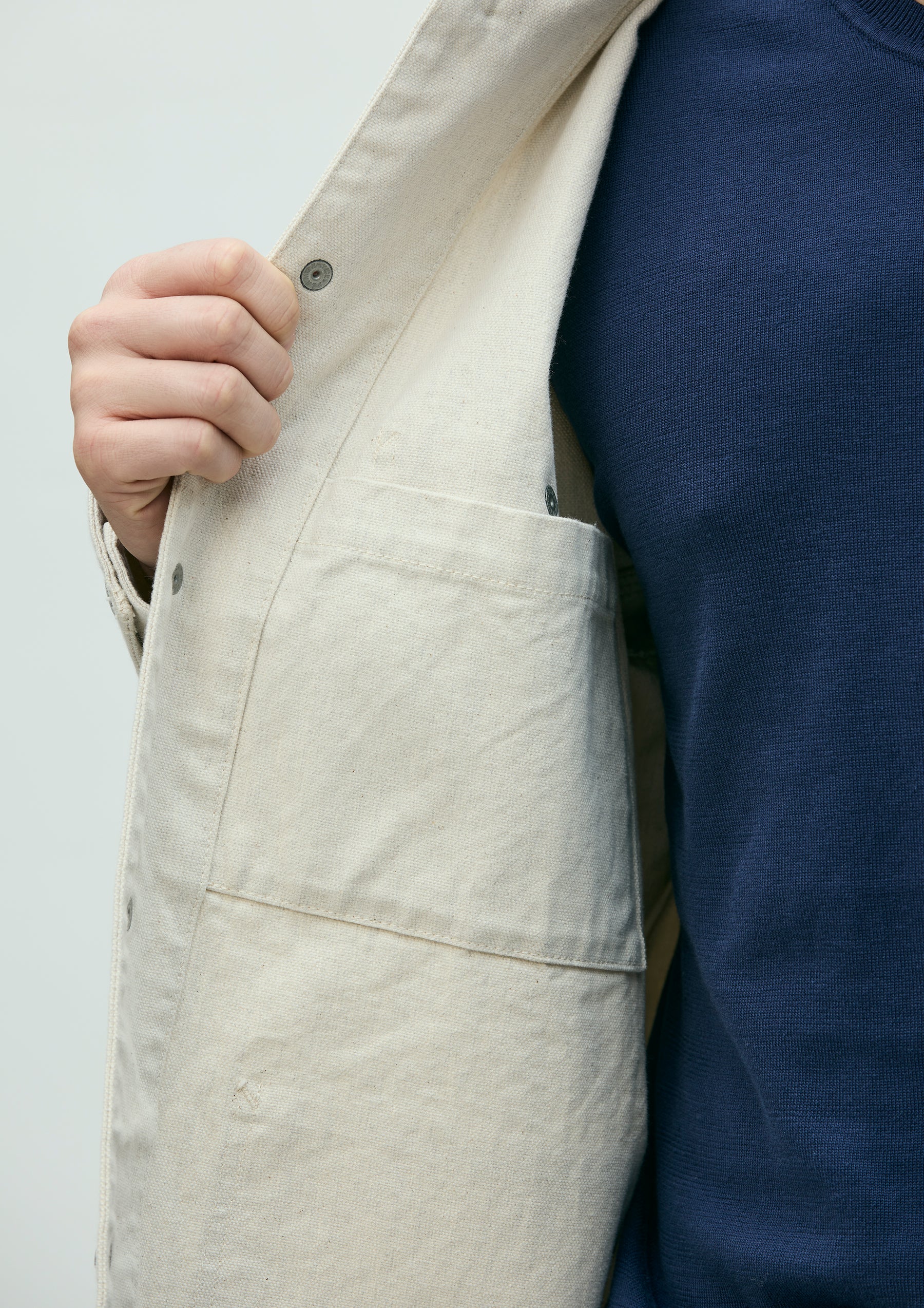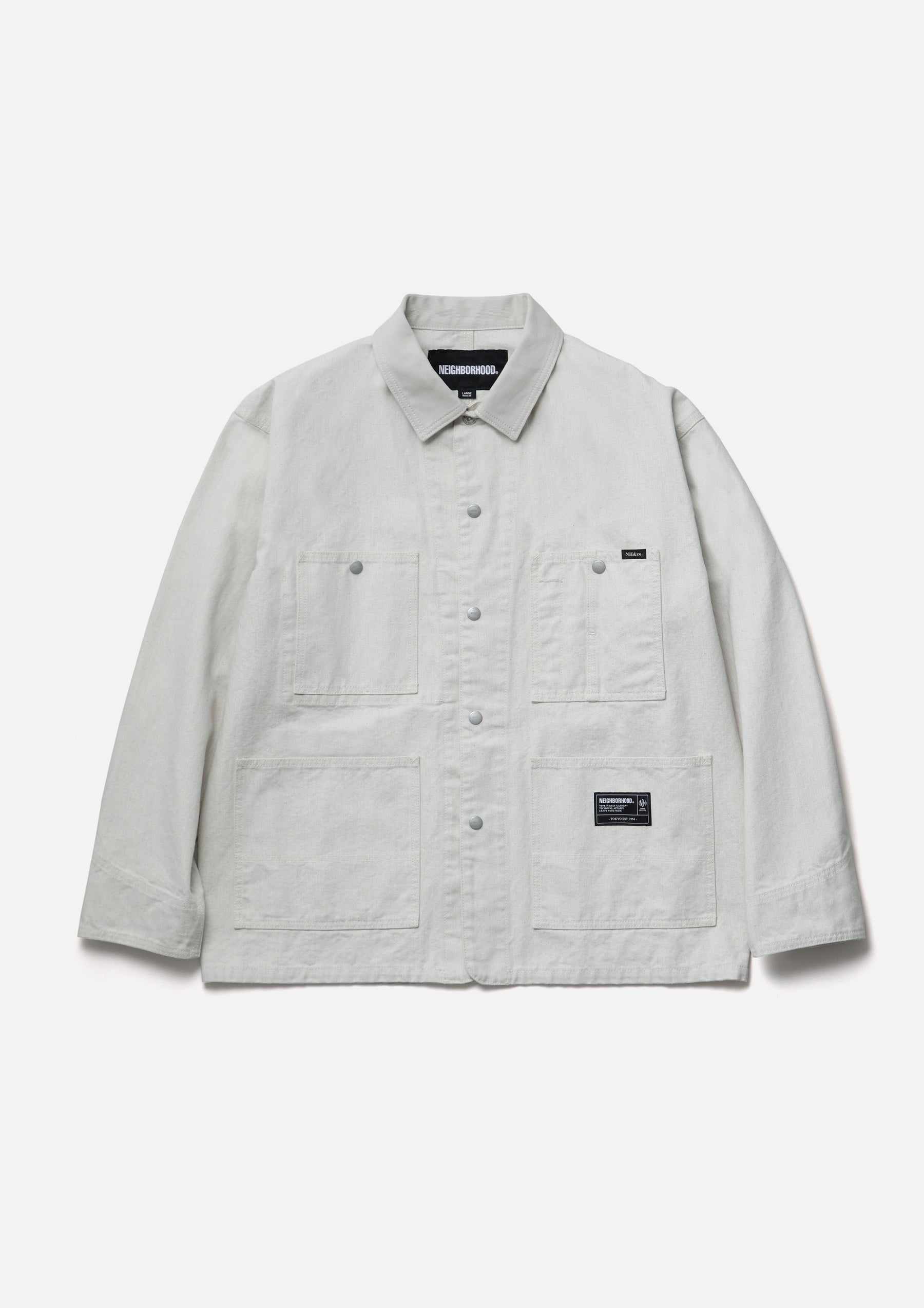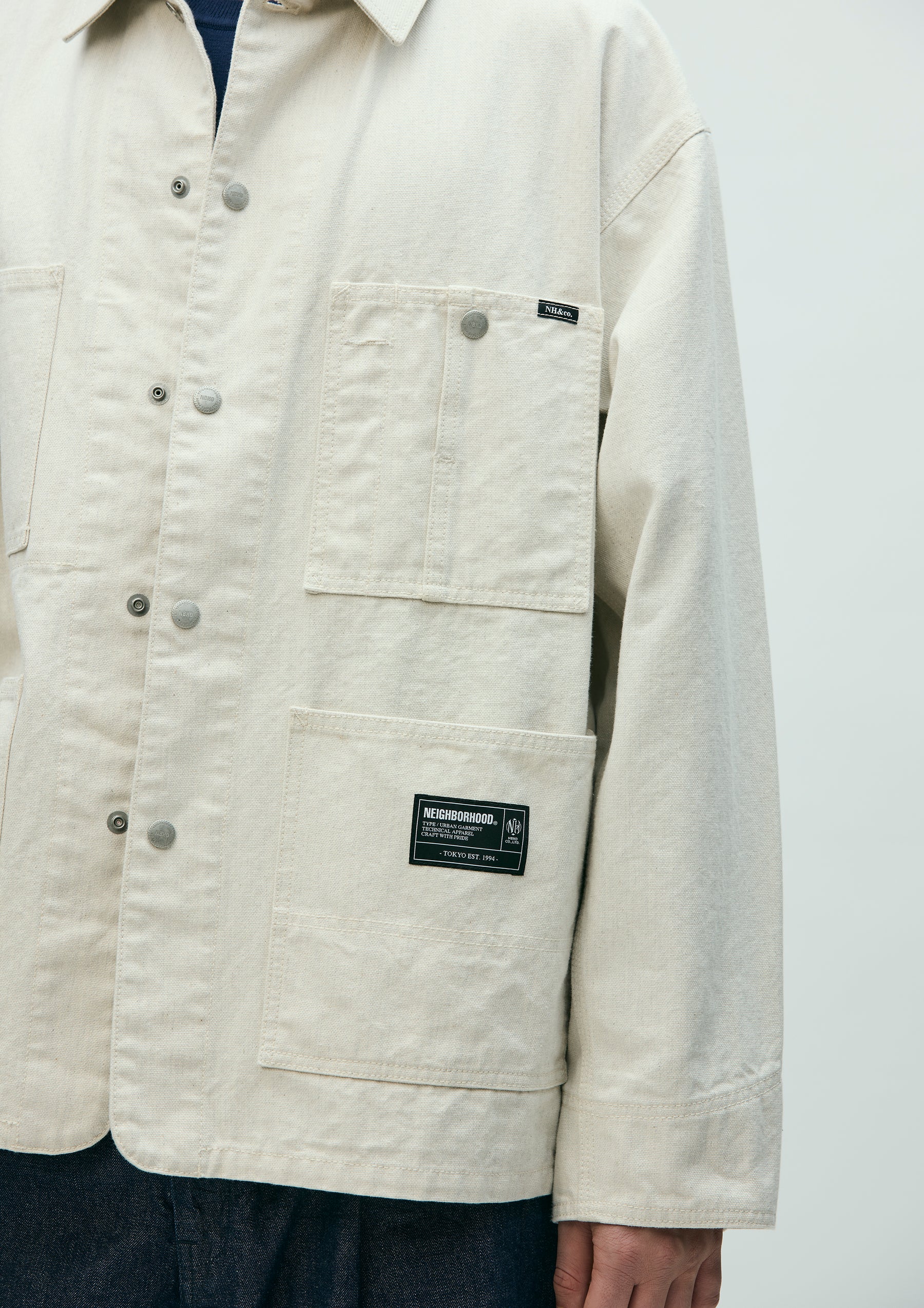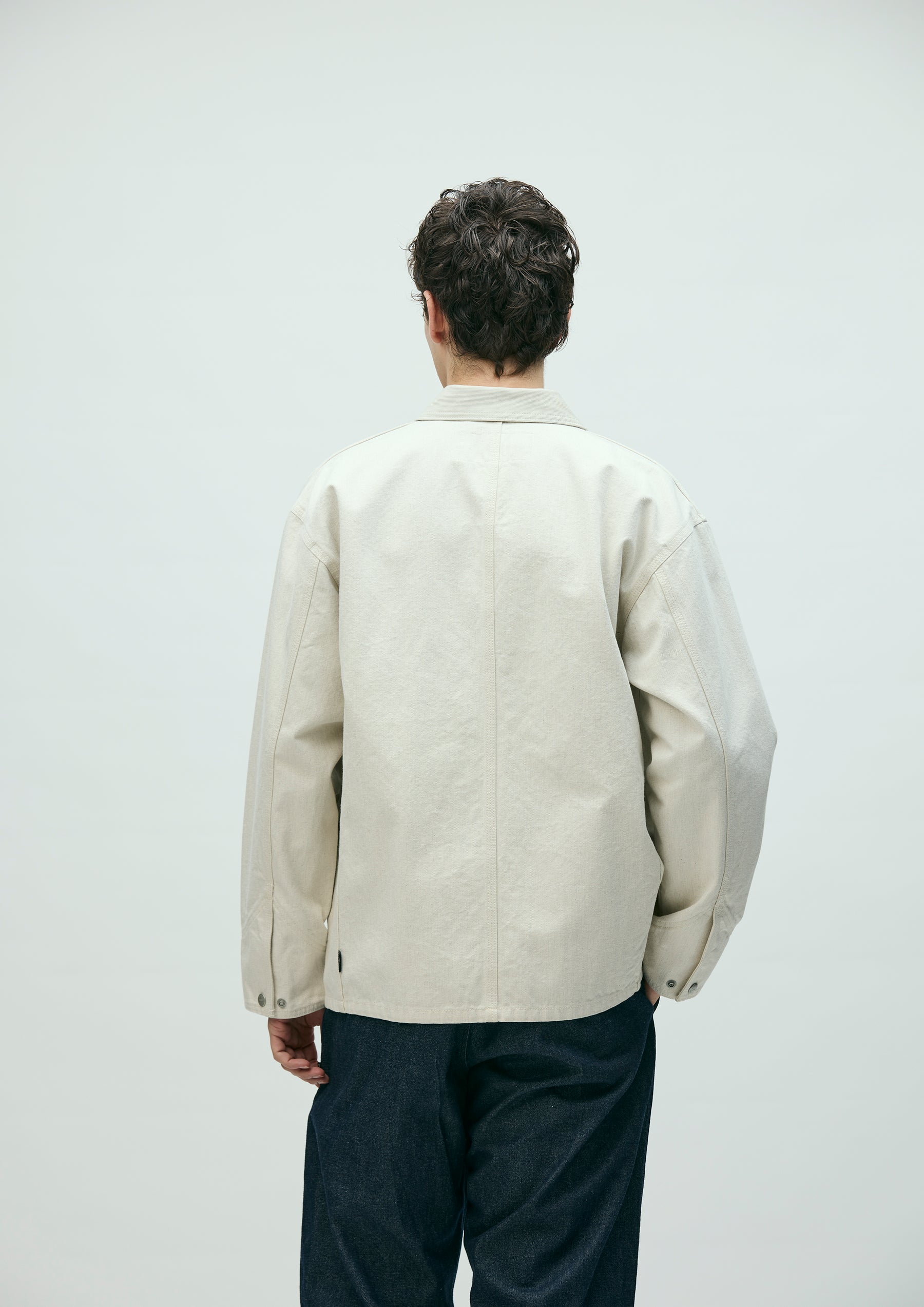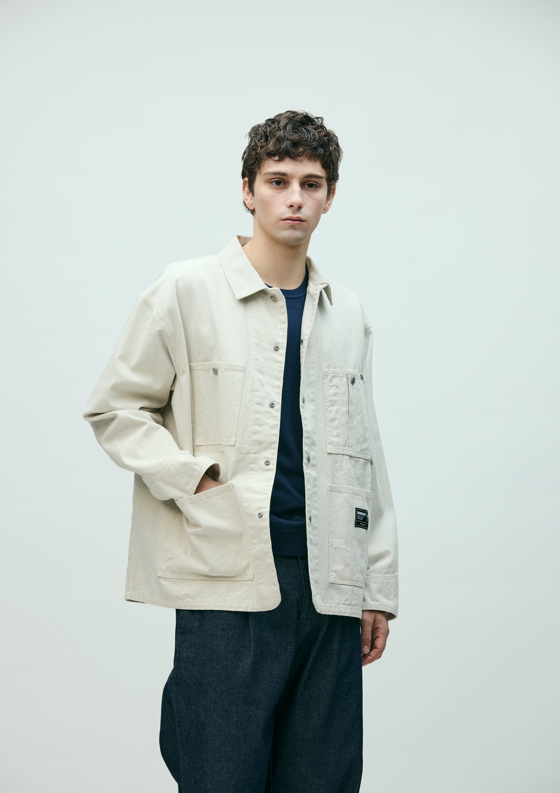 Coverall constructed from an oxford fabric body paired with a cotton piqué collar. Classic details include a pen slot and watch pocket at the chest, as well as triple-stitched flat-felled seams. Features original snap buttons, with a top metal button. A brand tag is attached to the pocket, and a woven side label is placed at the side seam. Finished with a one-wash process.