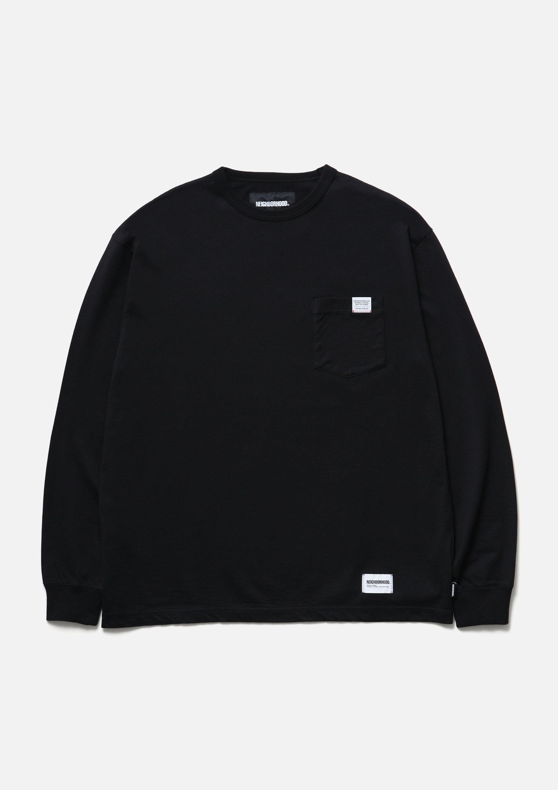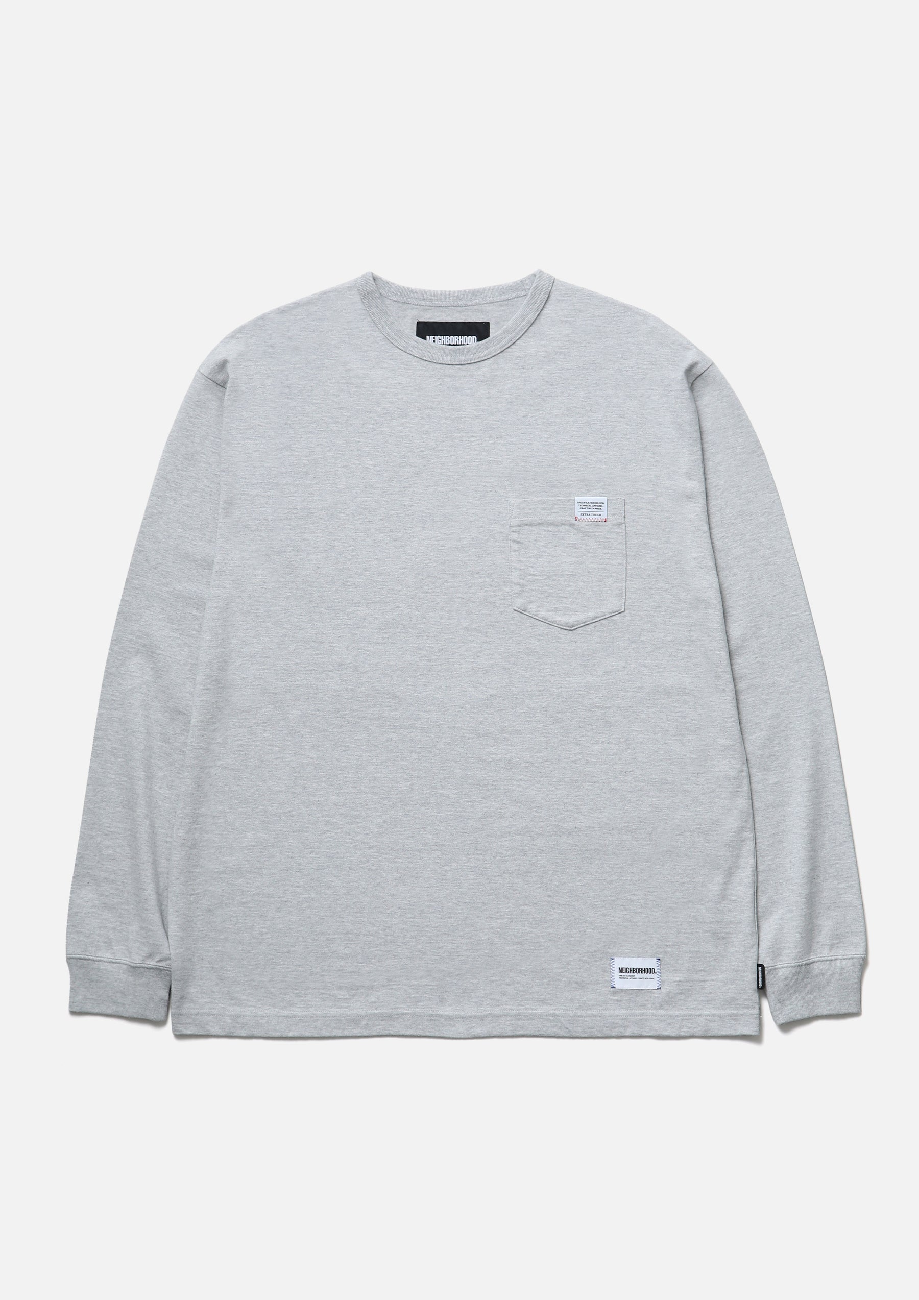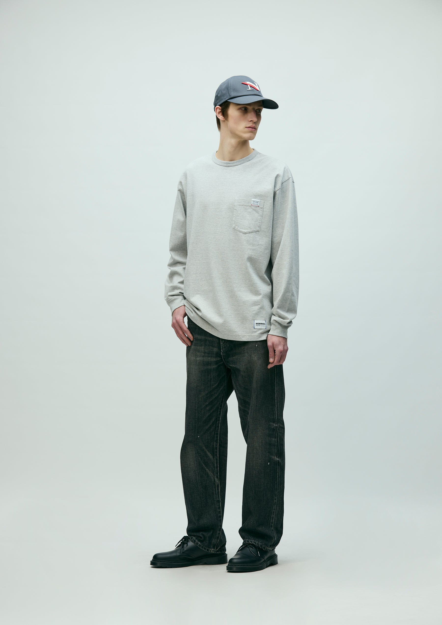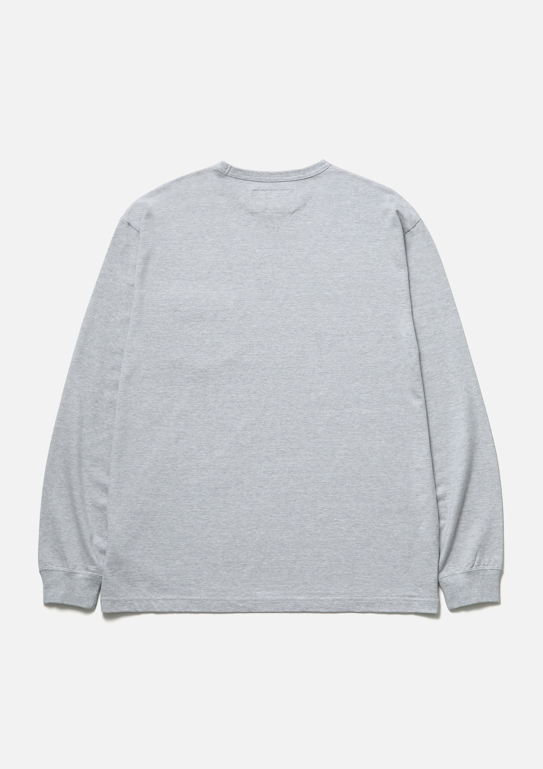 Long-sleeve crewneck cut-and-sew top made from tightly knit jersey fabric. Designed with houndstooth stitching on the patch pocket opening and the brand tag at the left hem. A woven side label is attached at the side seam. Completed with a one-wash finish.