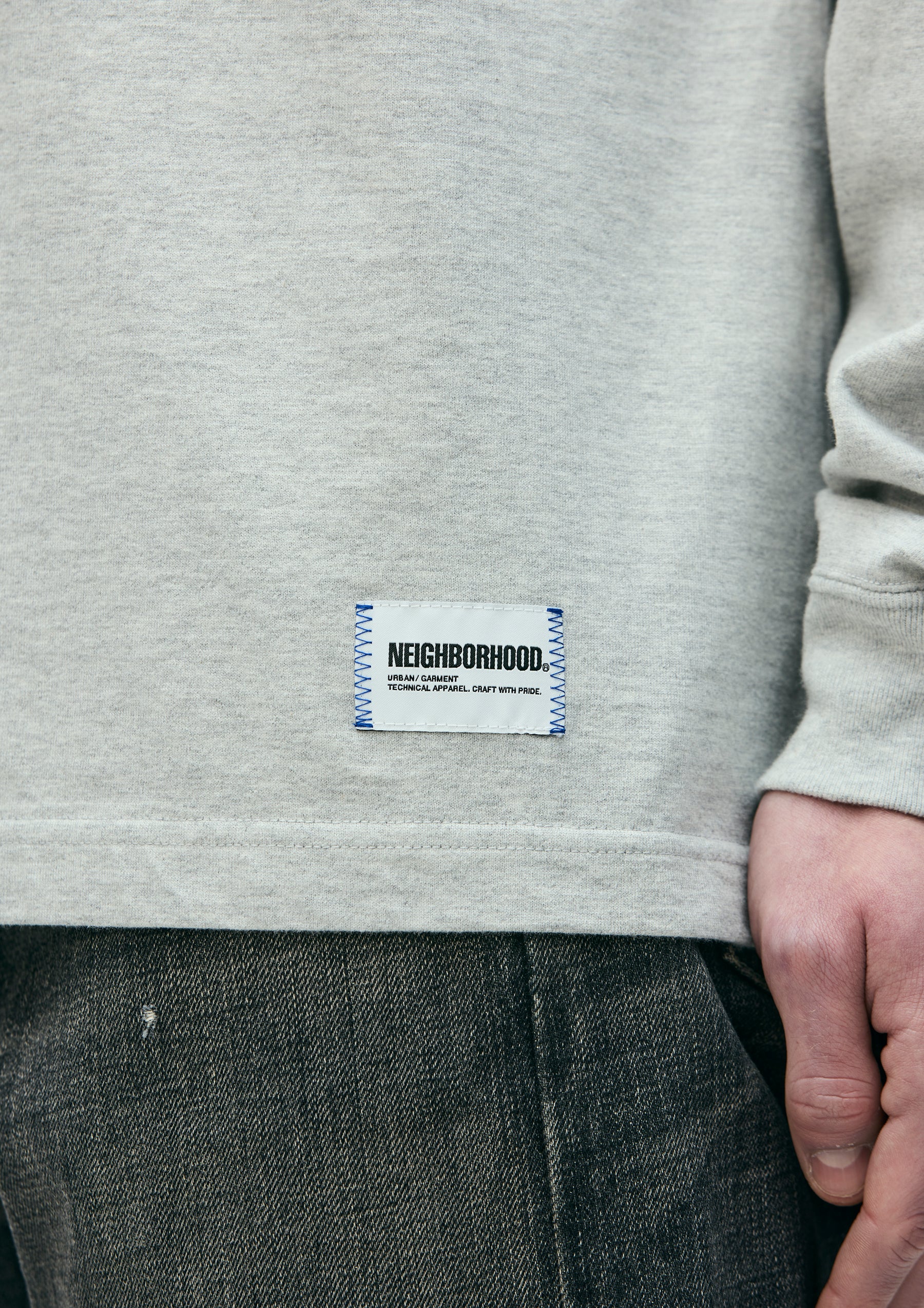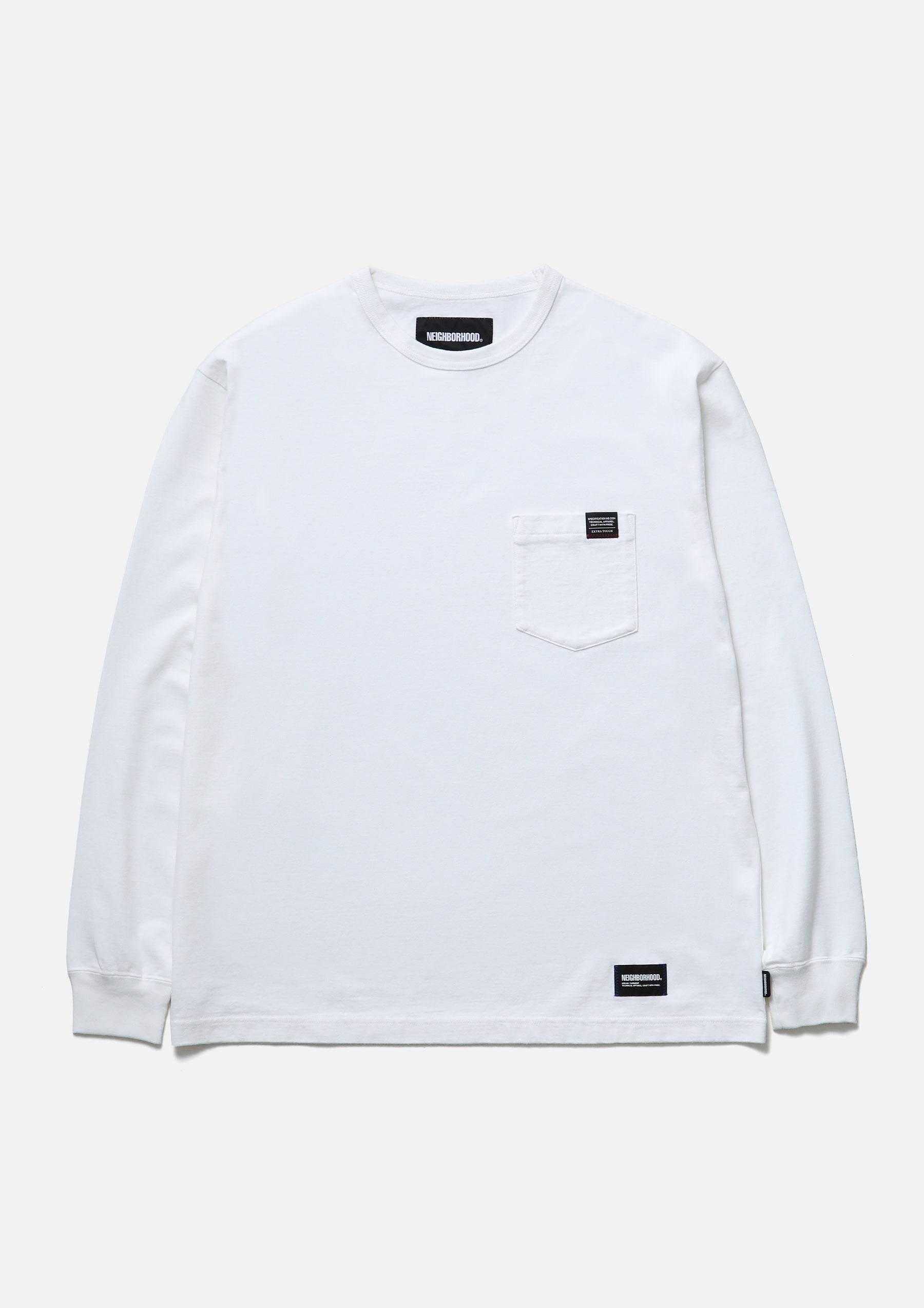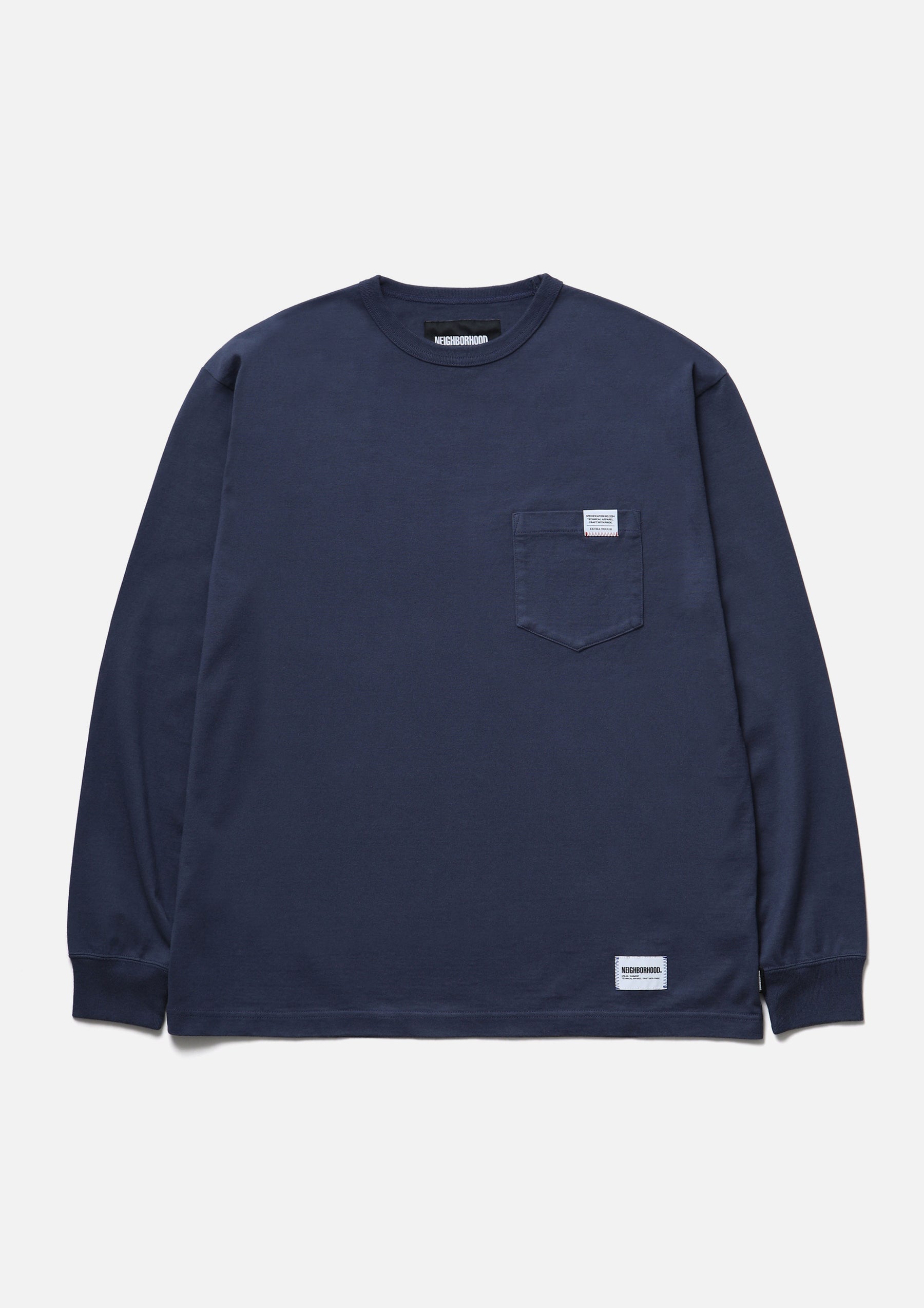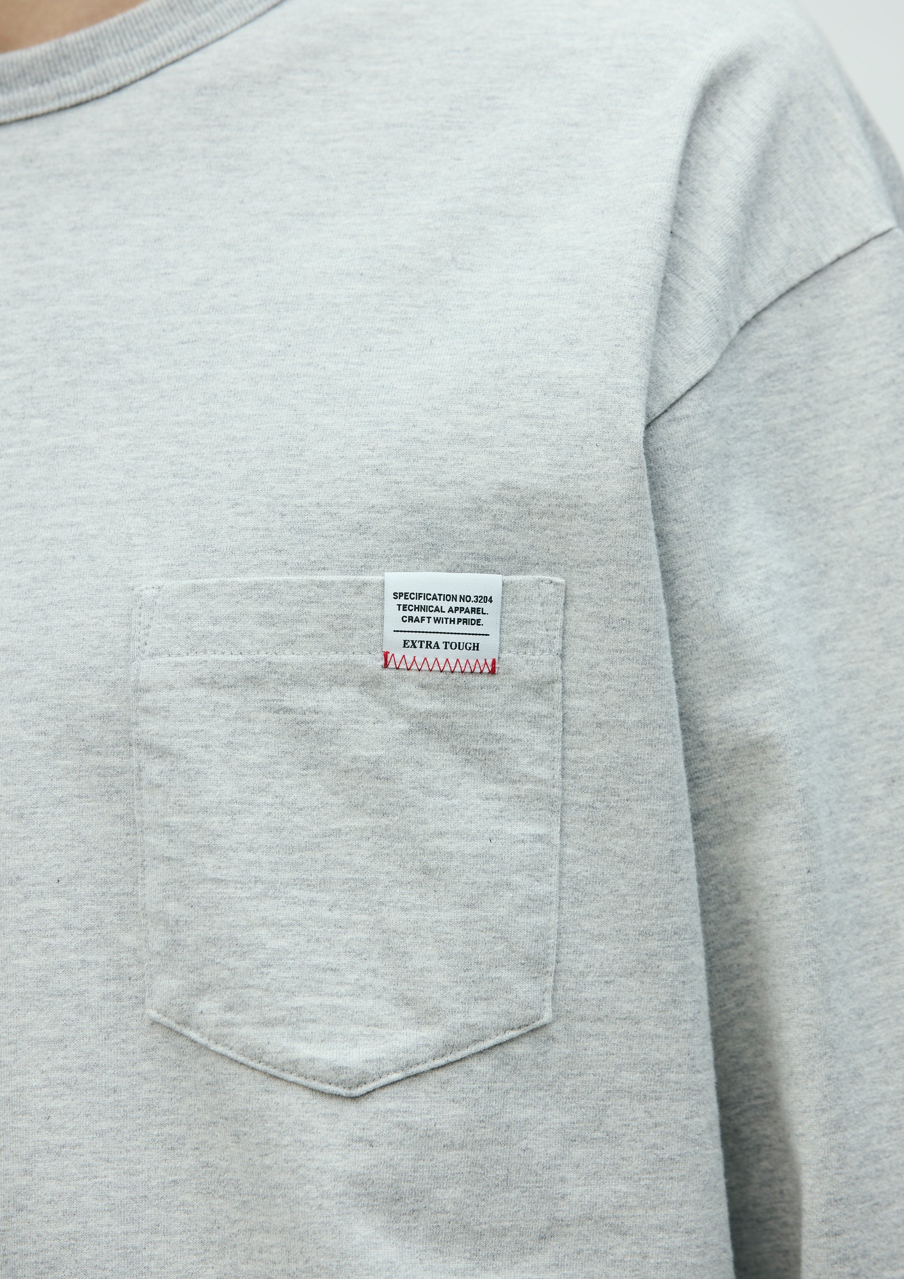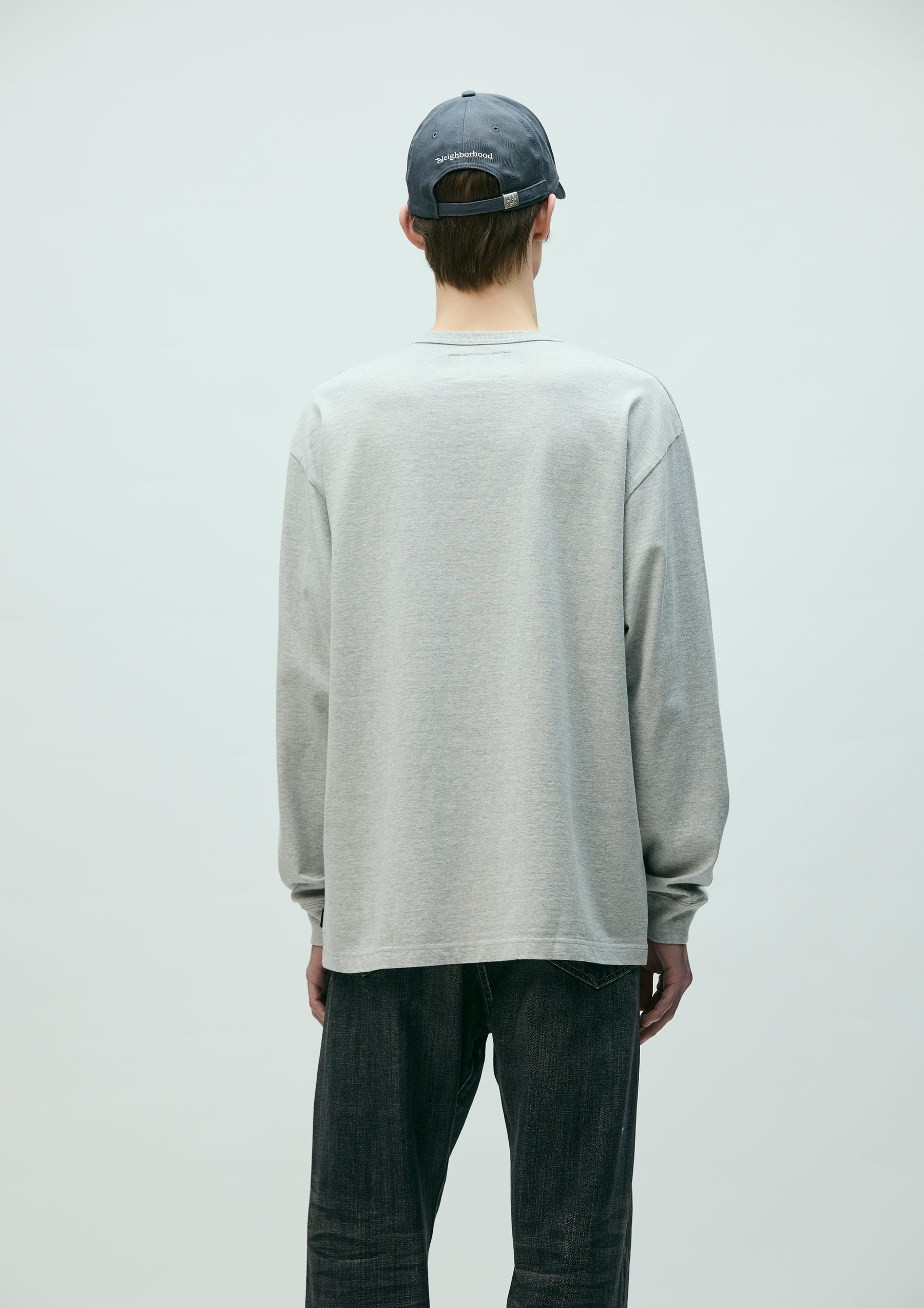 Long-sleeve crewneck cut-and-sew top made from tightly knit jersey fabric. Designed with houndstooth stitching on the patch pocket opening and the brand tag at the left hem. A woven side label is attached at the side seam. Completed with a one-wash finish.