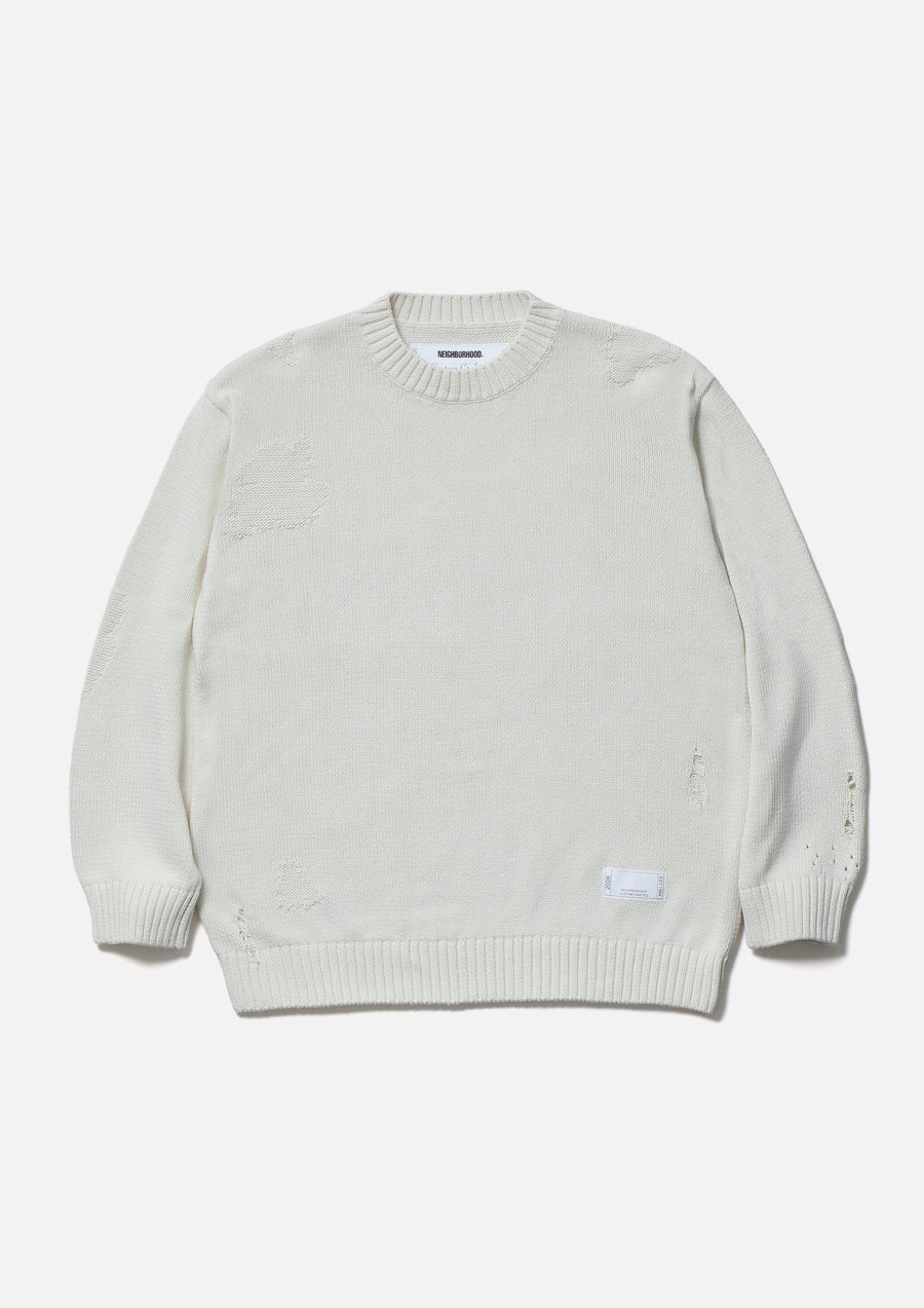 Savage crewneck knit crafted in 5-gauge jersey using cotton yarn. Designed with damage detailing expressed through drop-needle holes and reverse-side knitting. Finished with a brand tag exclusive to the Custom Crafted line at the left hem.