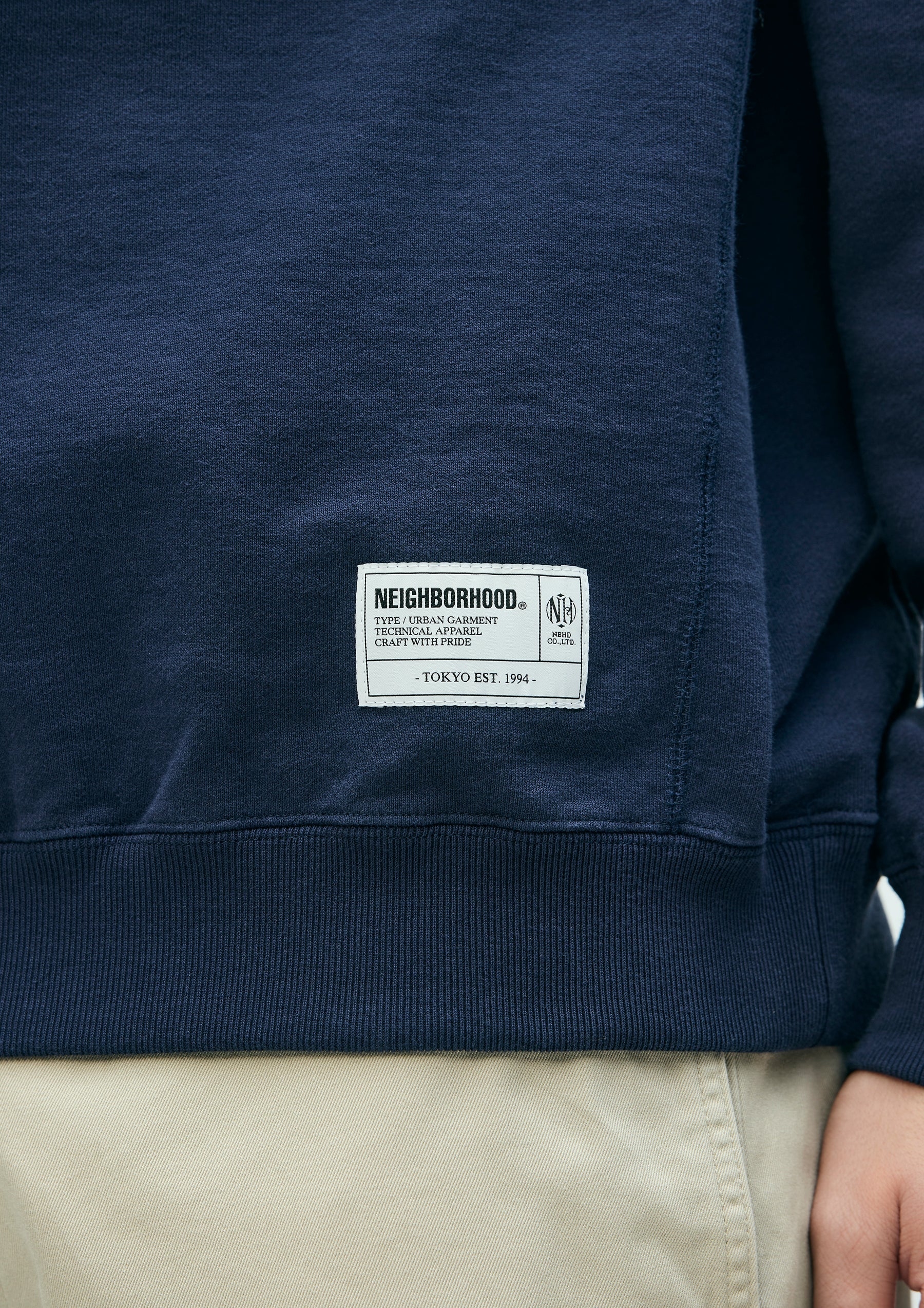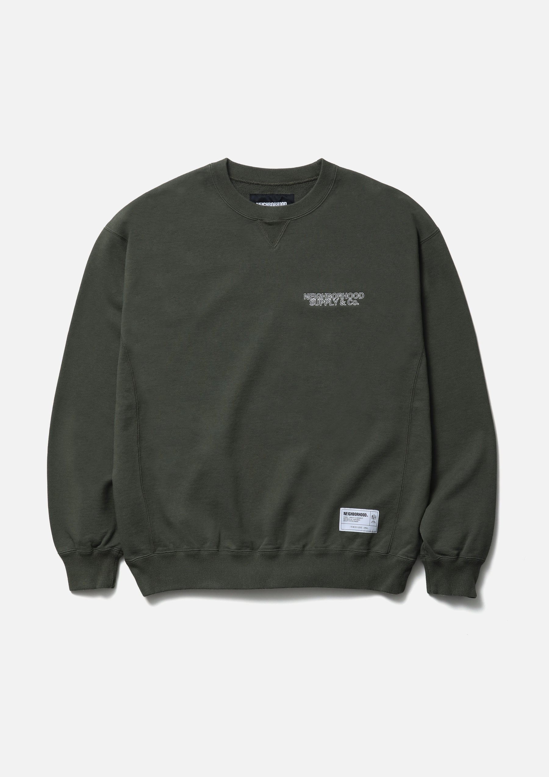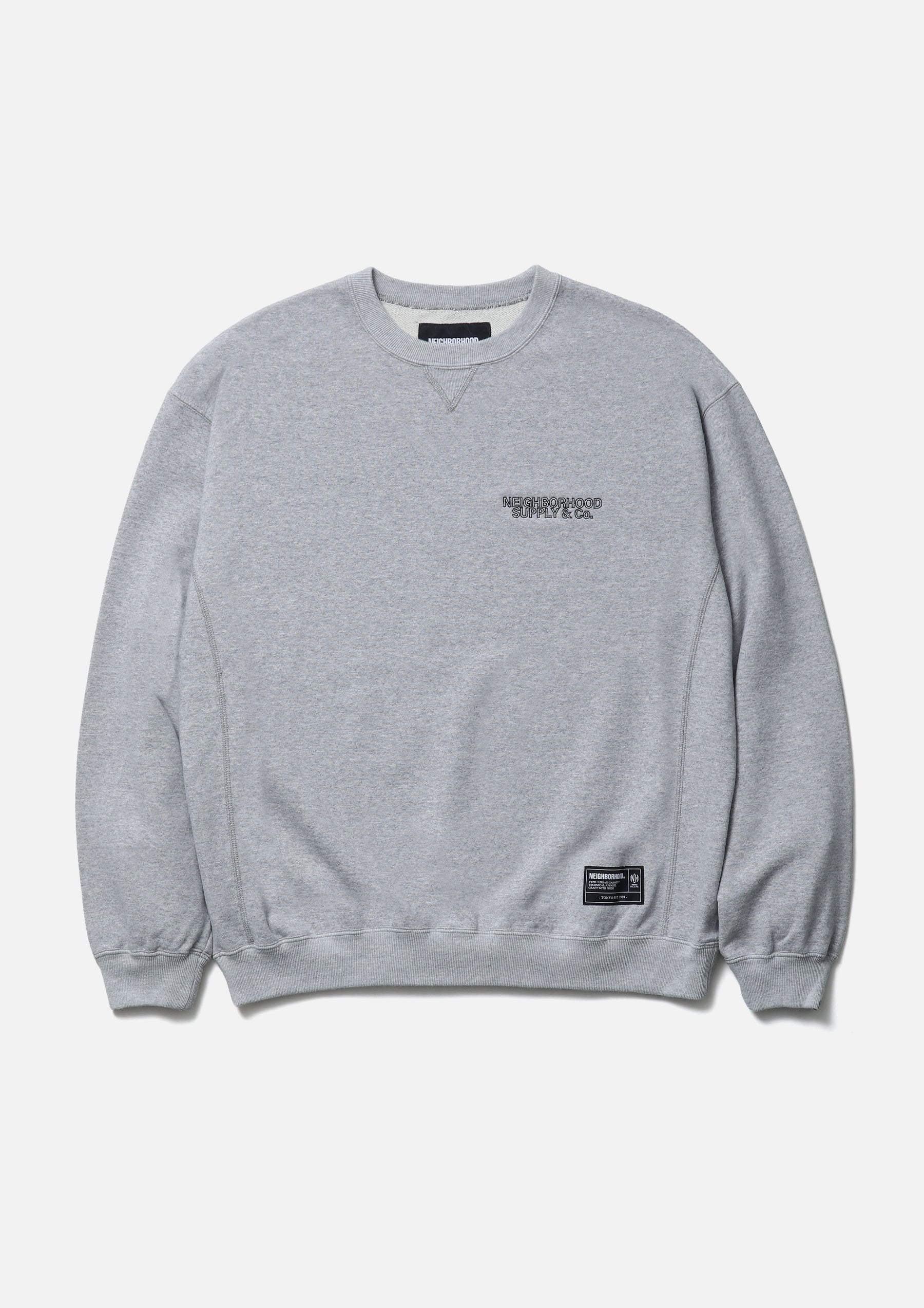 Crewneck pullover made from fleece fabric spun with organic cotton. Features an embroidered logo on the left chest. A brand tag is placed at the left hem, and a woven side label is attached at the cuff. Completed with a one-wash finish.