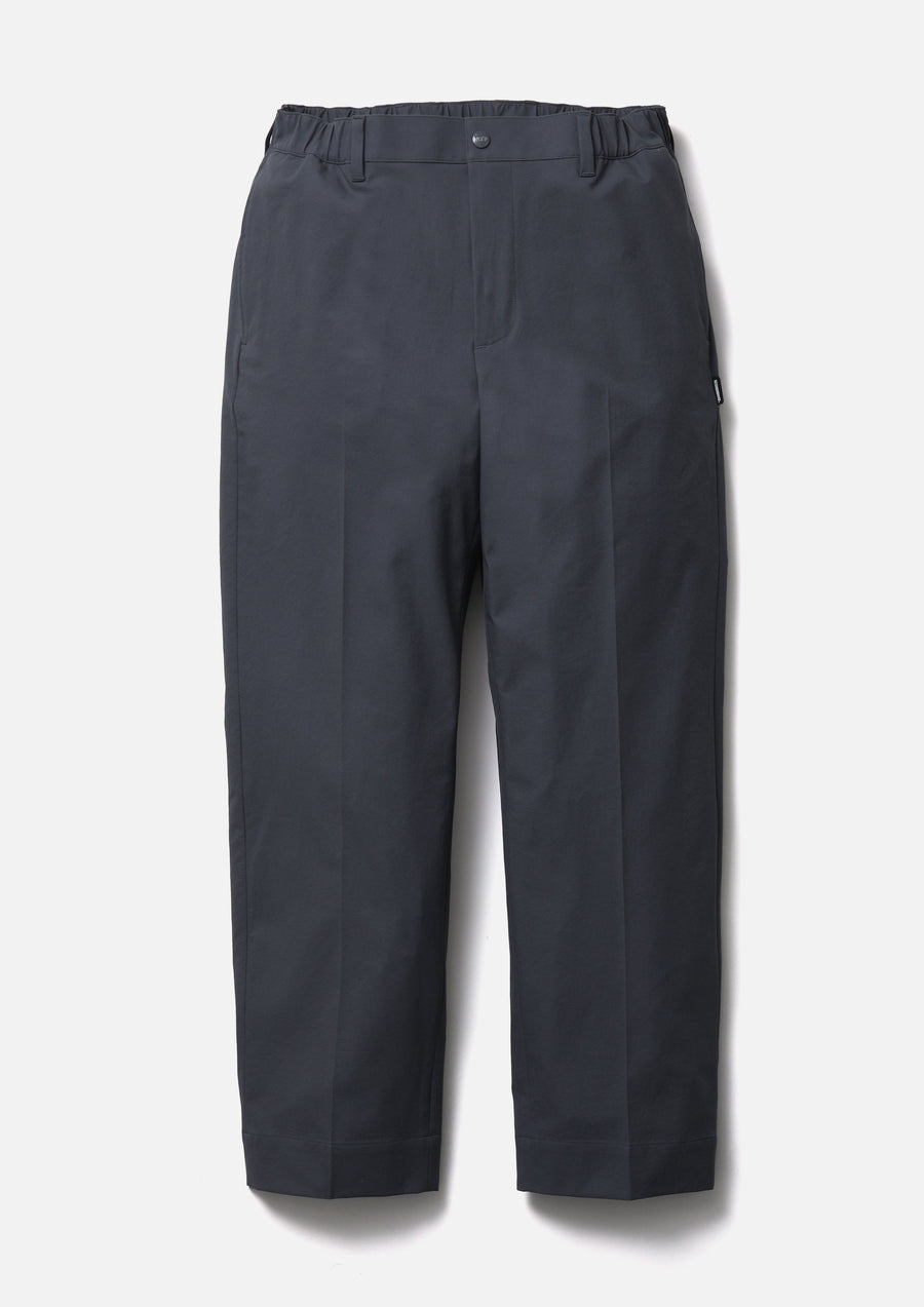 Tapered pants made from polyester chino fabric with a special molecular structure that provides four-way stretch and high durability. The twill fabric features a pronounced diagonal weave, enhanced with a wrinkle finish and water-repellent properties. Designed with an elastic waistband and belt loops. Finished with original snap buttons, zipper pulls, and signature tape. A brand tag is placed on the back flap pocket, with a woven side label at the side seam.