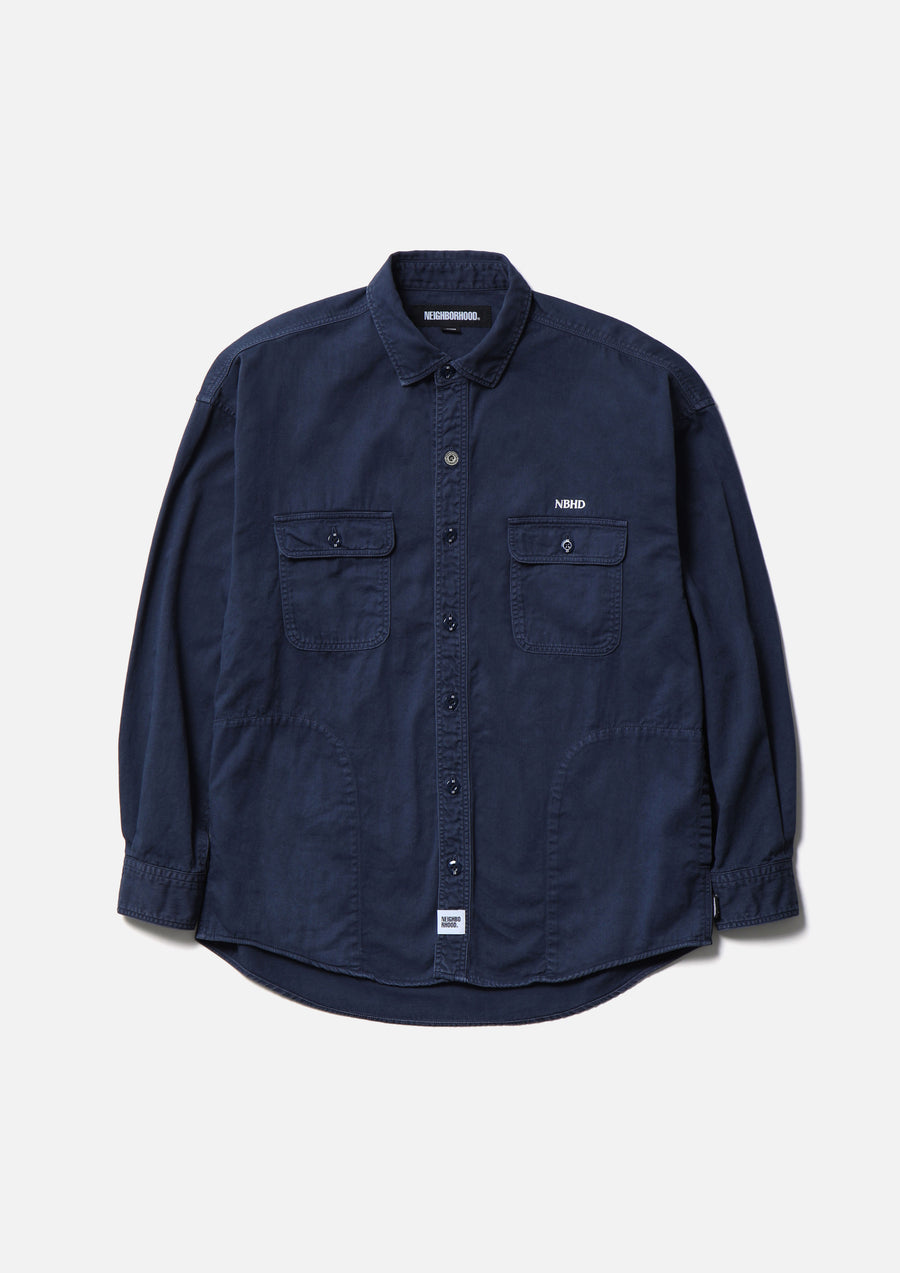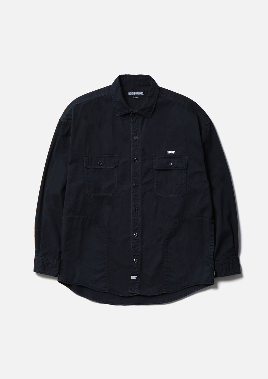 A sulfur-dyed shirt made of twill fabric with a unique texture, achieved through a combination of sulfur dyeing and bio-stone processing at the product stage. Hand pockets utilizing side details. Embroidered logo on the left chest. Features original four-hole buttons, with a original metal button for the second button. Features a brand tag on the placket and side seam.