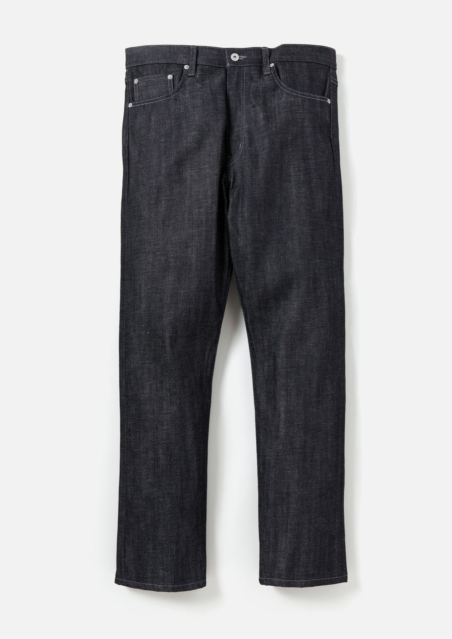 12 oz. denim pants made entirely from our original selvedge denim fabric, buttons, rivets, and other parts. Details such as signature tape on the front zipper fly, "N" stitching on the hip pockets, and leather patches. Slim tapered silhouette with room around the waist.
