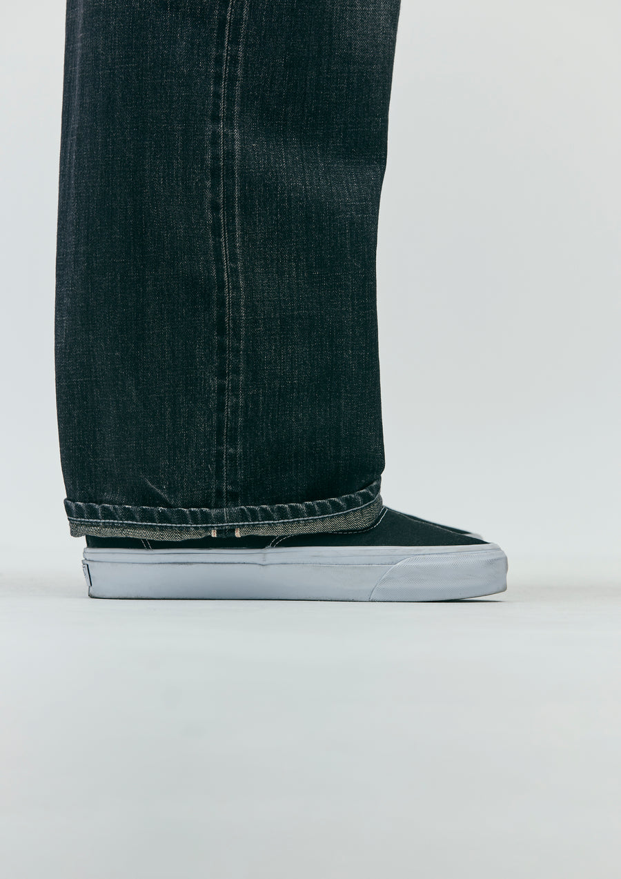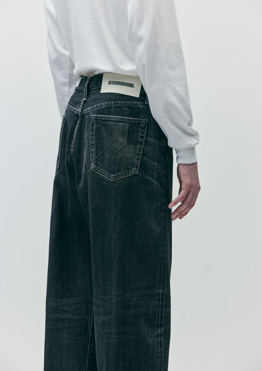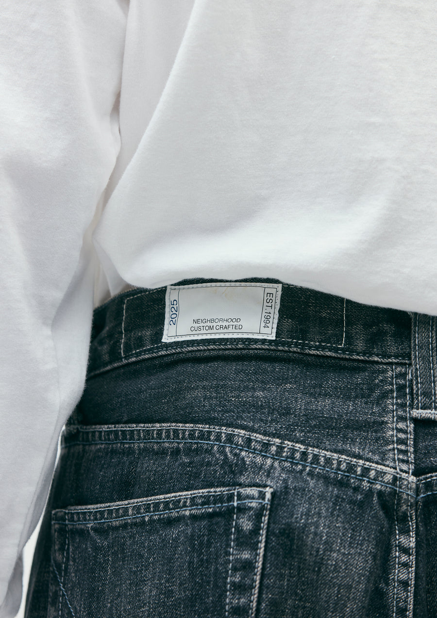 12 oz. original denim pants with a washed finish. All parts, from the selvedge denim fabric to the buttons and rivets, are all original. Details such as signature tape on the front zipper fly, "N" stitching on the hip pockets, and leather patches. Exclusive size label is attached to custom crafted item. New wide-slate silhouette with a fairly relaxed waist, hips, and hems.
