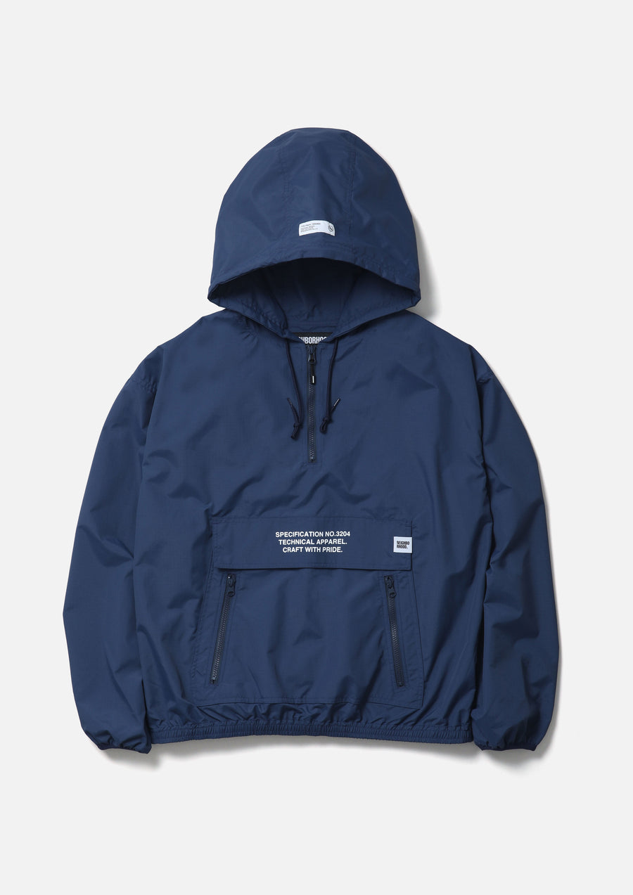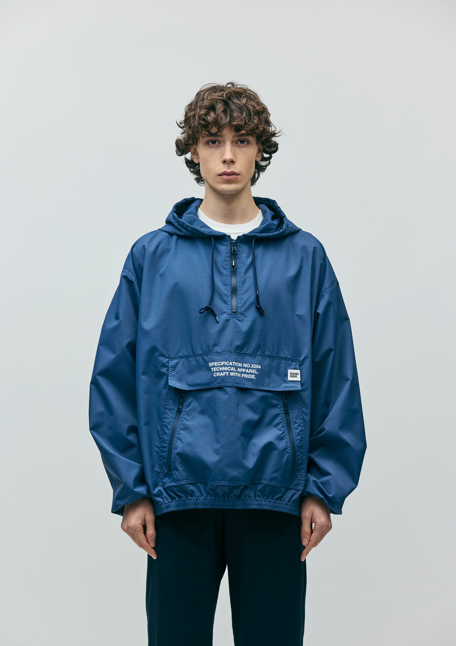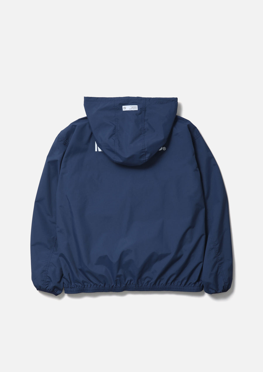 An anorak jacket made from nylon taslan ripstop fabric, featuring a cotton-like texture and moderate firmness. The front has a zippered flap pocket accessible from both vertical and horizontal directions. An adjustable elastic spindle is built into the hem. Printed logo on the pocket flap and back. Equipped with an original rubber zipper pull and brand tag on the side seam.