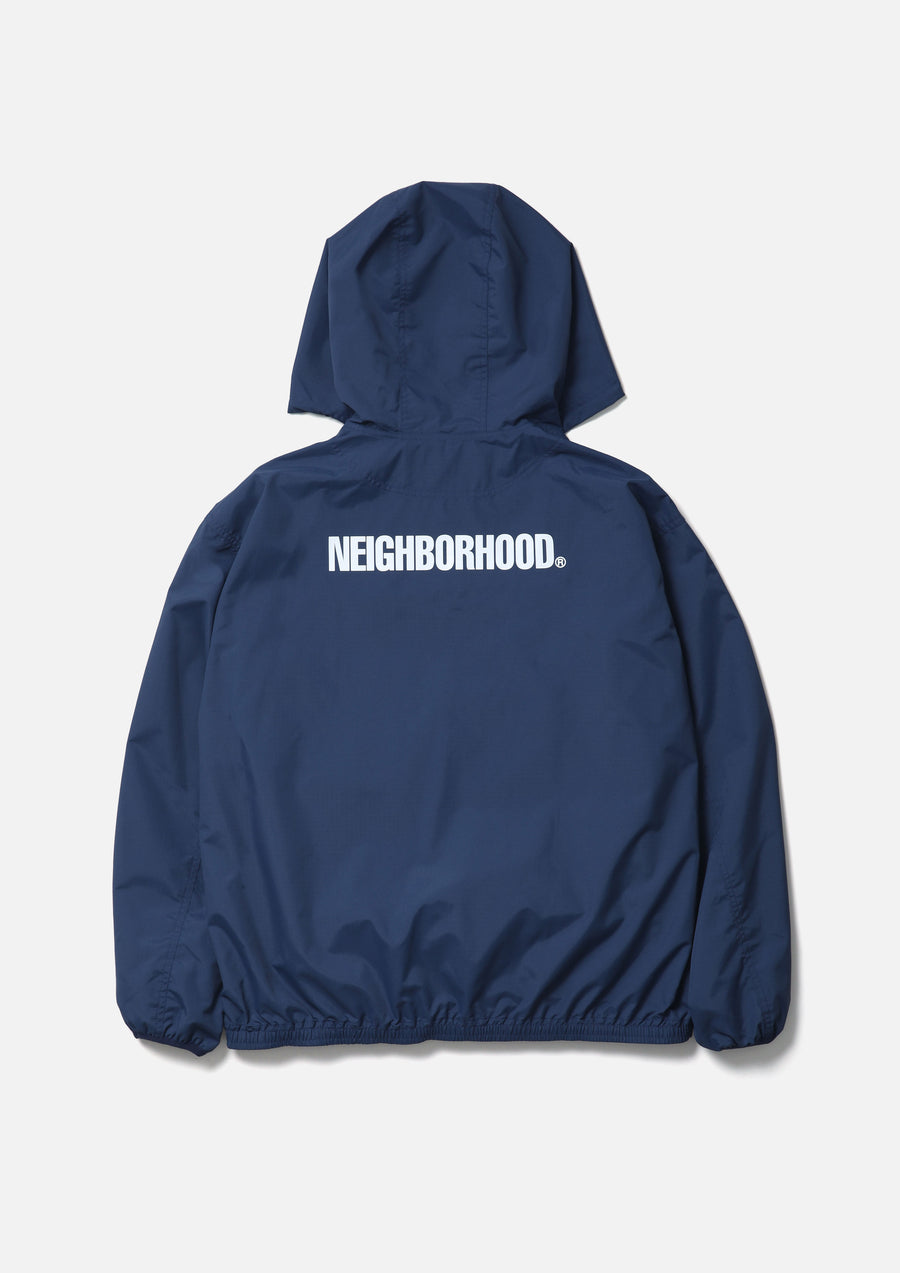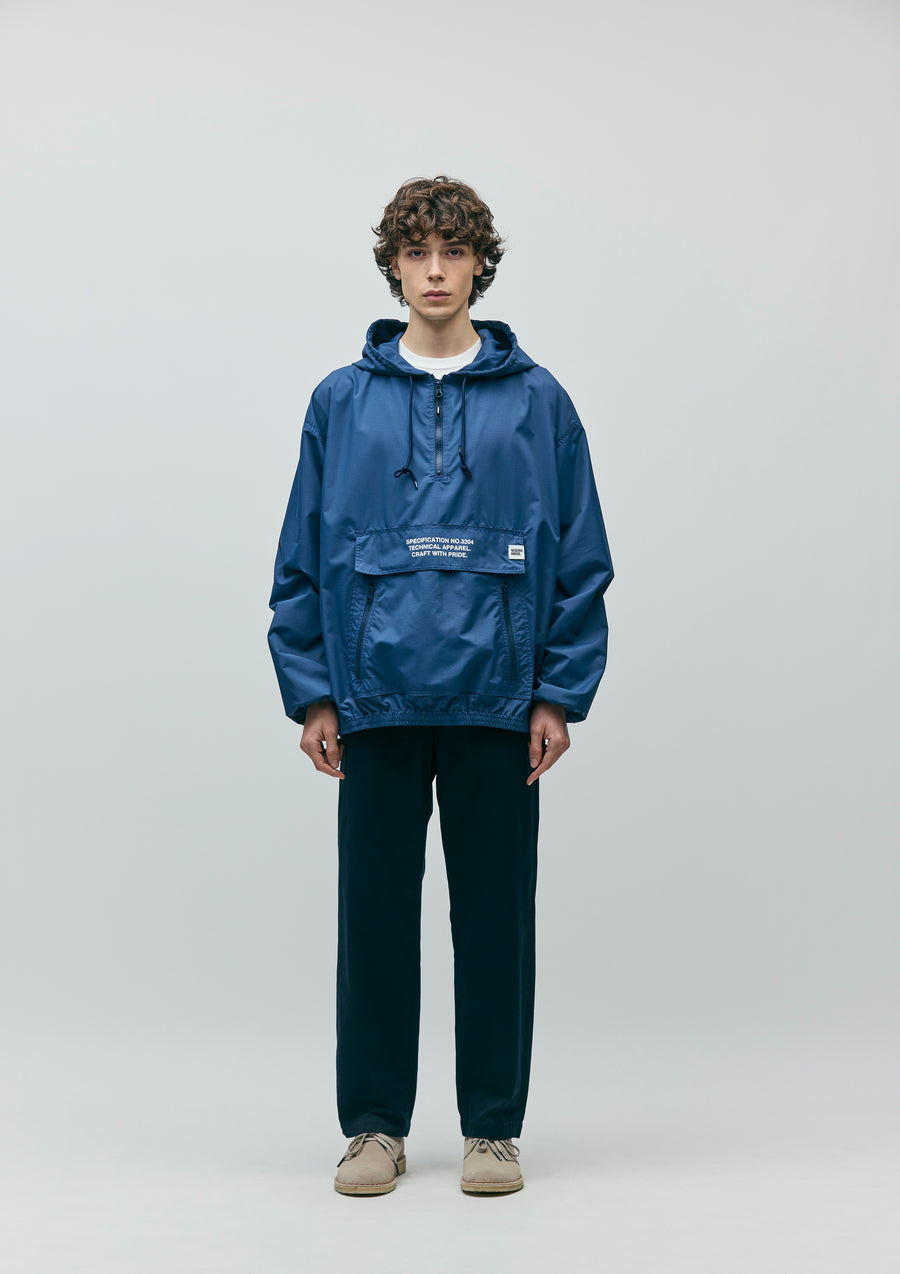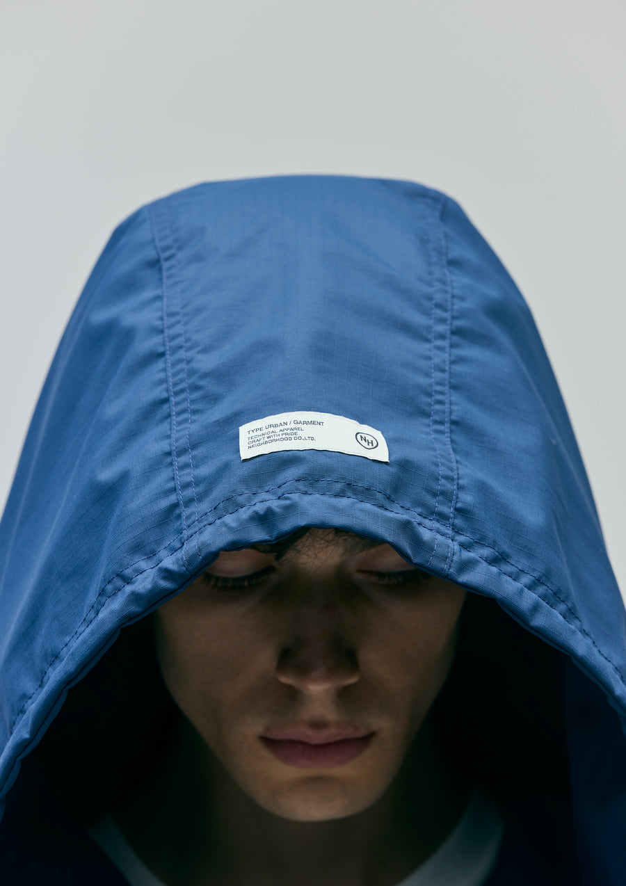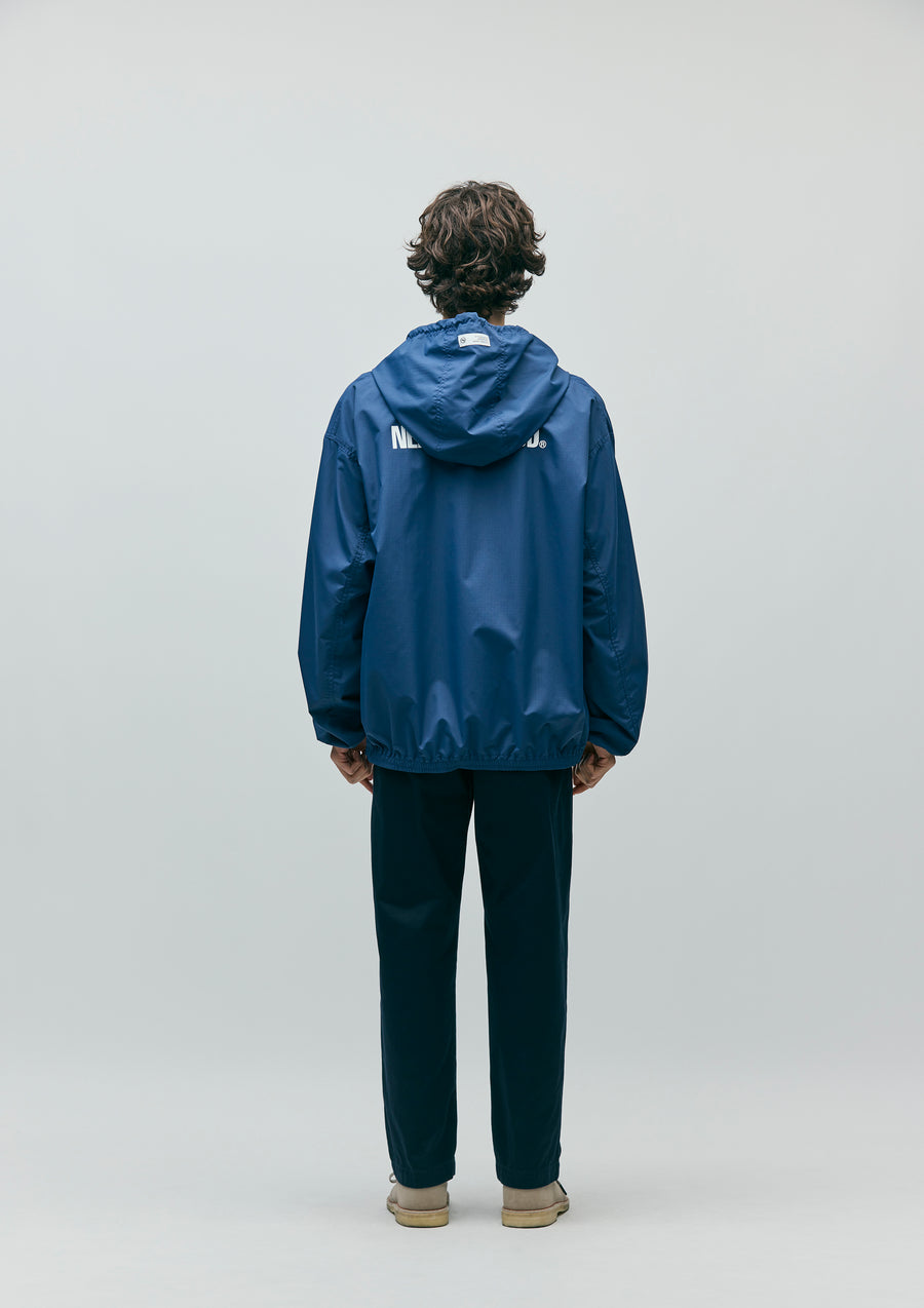 An anorak jacket made from nylon taslan ripstop fabric, featuring a cotton-like texture and moderate firmness. The front has a zippered flap pocket accessible from both vertical and horizontal directions. An adjustable elastic spindle is built into the hem. Printed logo on the pocket flap and back. Equipped with an original rubber zipper pull and brand tag on the side seam.