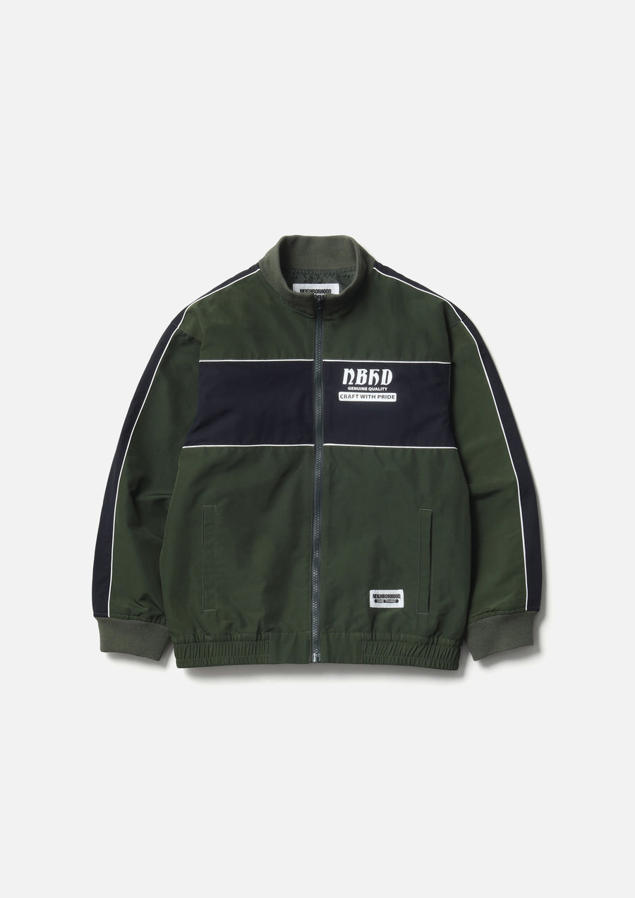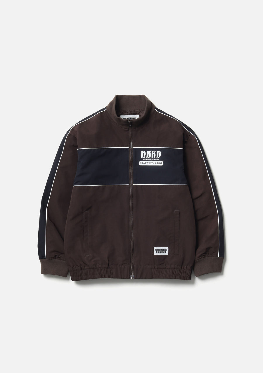 A track jacket made from cotton-nylon grosgrain fabric with moderate thickness, flexibility, and water repellency. The body and sleeves feature a color-blocked design with piping details. Printed logo on the left chest. Includes a brand tag on the left hem and on the side seam.