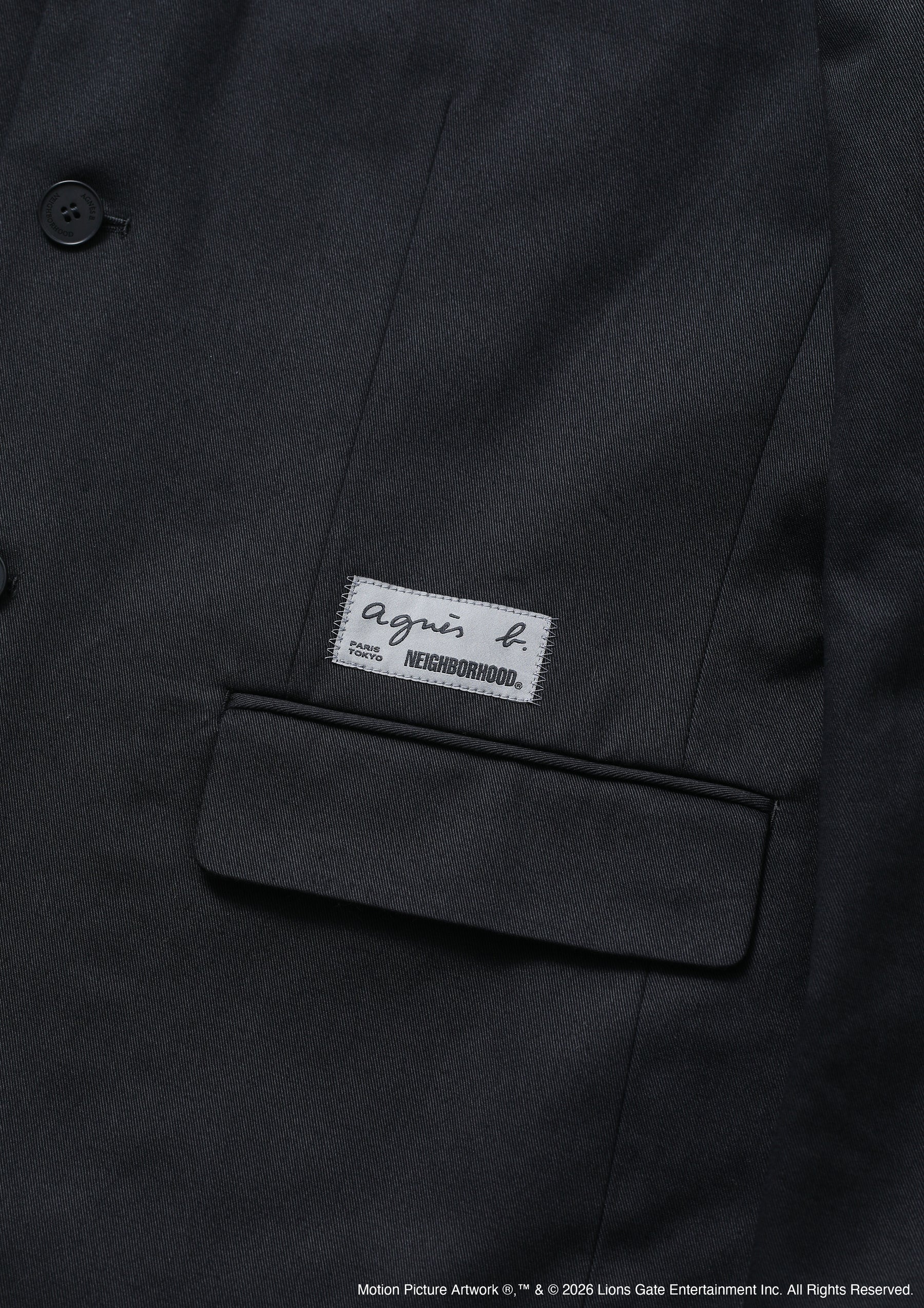 A collaboration jacket based on agnès b.’s iconic black suit—one of the brand’s signaturepieces, long favored by artists in the film and music scenes. Inspired by the suits worn by thecharacters in RESERVOIR DOGS (Lionsgate), this collection brings cinematic attitude into acontemporary wardrobe. Expertly tailored in 100% cotton, it offers versatility for everything from everyday wear to special occasions.