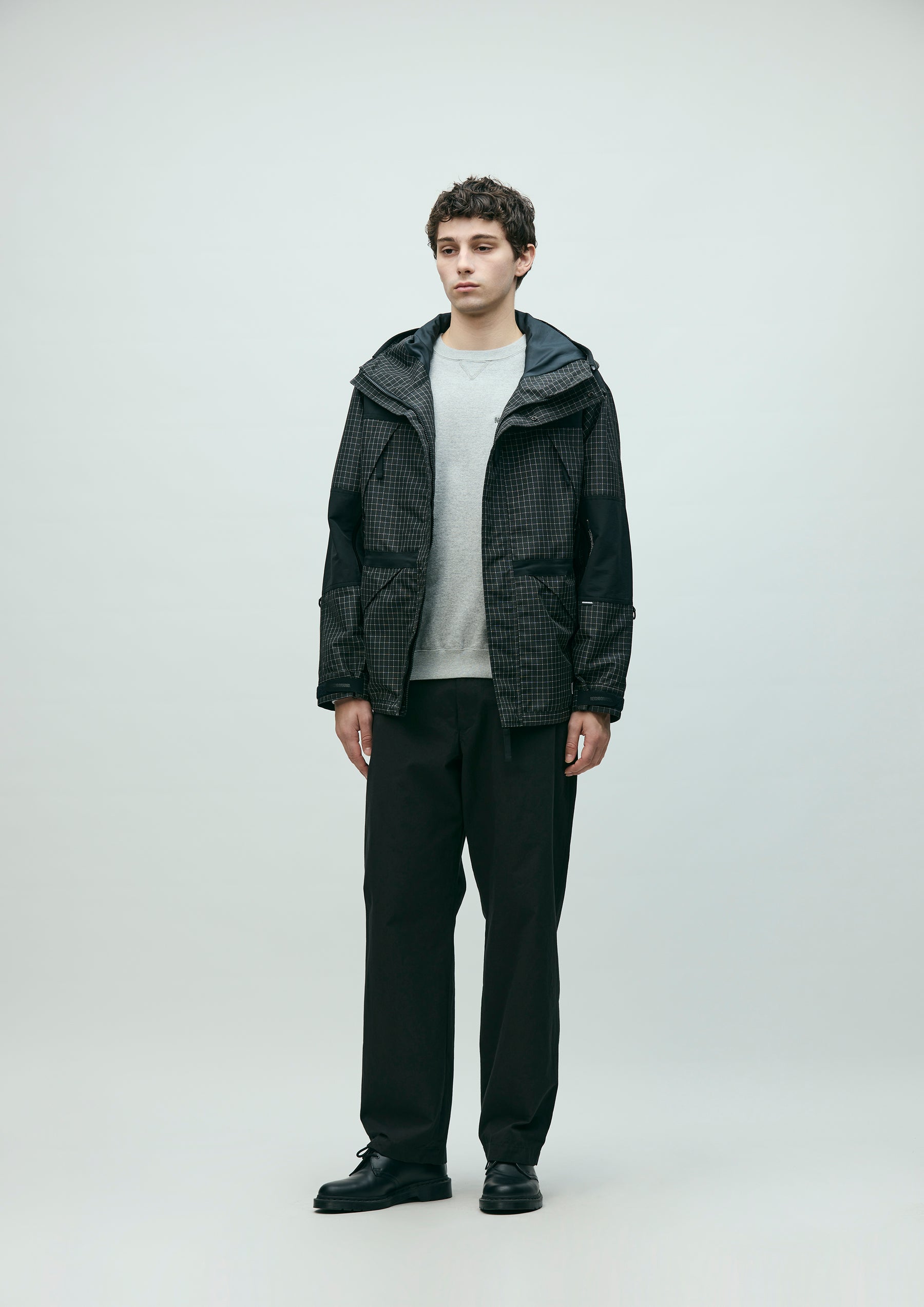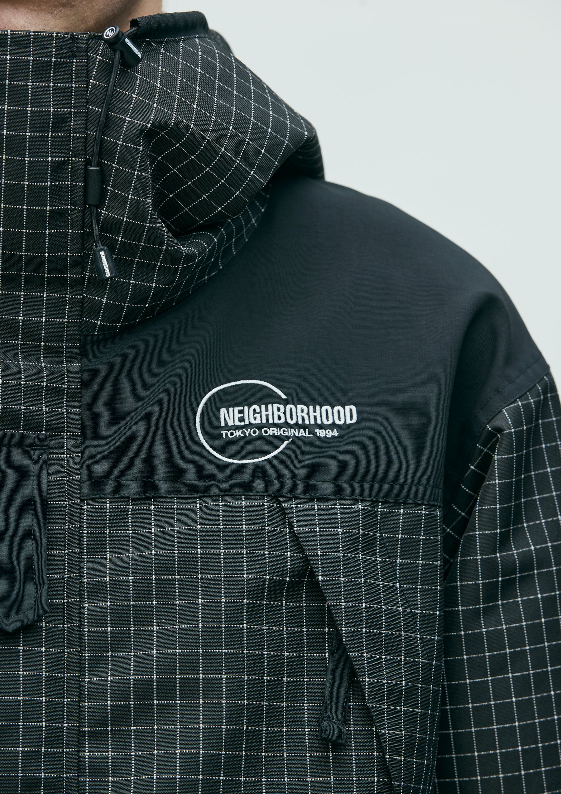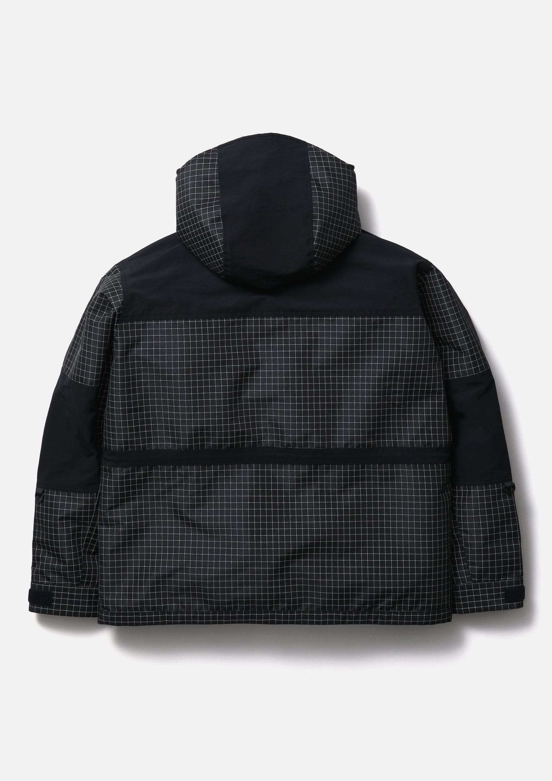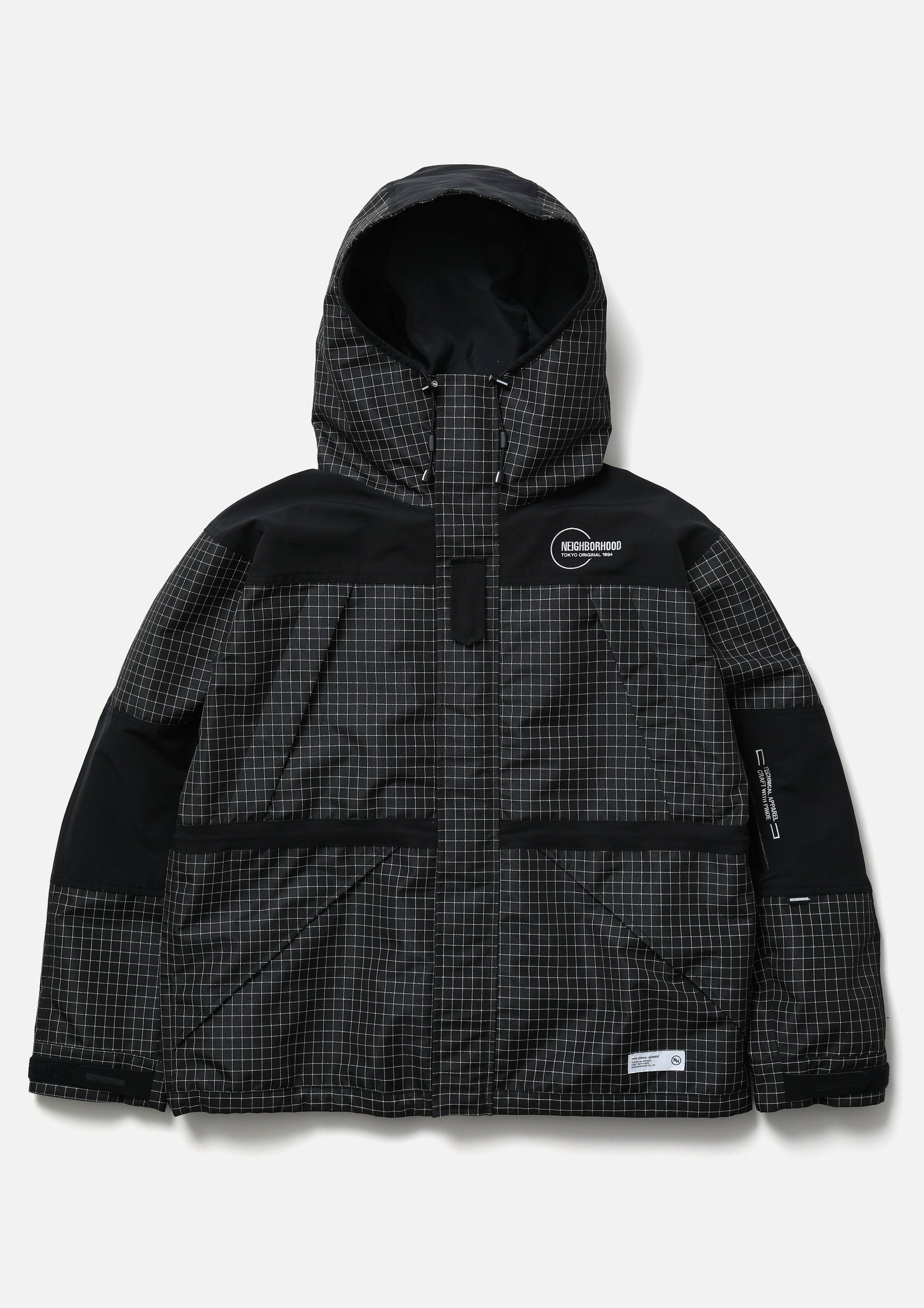 Mountain parka made from original reflective ripstop material. The textile incorporates reflector yarn for high visibility, with a water-repellent finish on the surface and an acrylic coating on the reverse side to ensure durability, water resistance, and safety. Features four waterproof zip pockets on the front body and sleeves. Finished with original Velcro tabs at the cuffs, and elastic drawcords with adjusters at the hood, waist, and hem. Logos are embroidered on the left chest and left sleeve. A brand tag is placed at the left hem, and a woven side label is attached to the left sleeve. Lined with antistatic polyester taffeta.