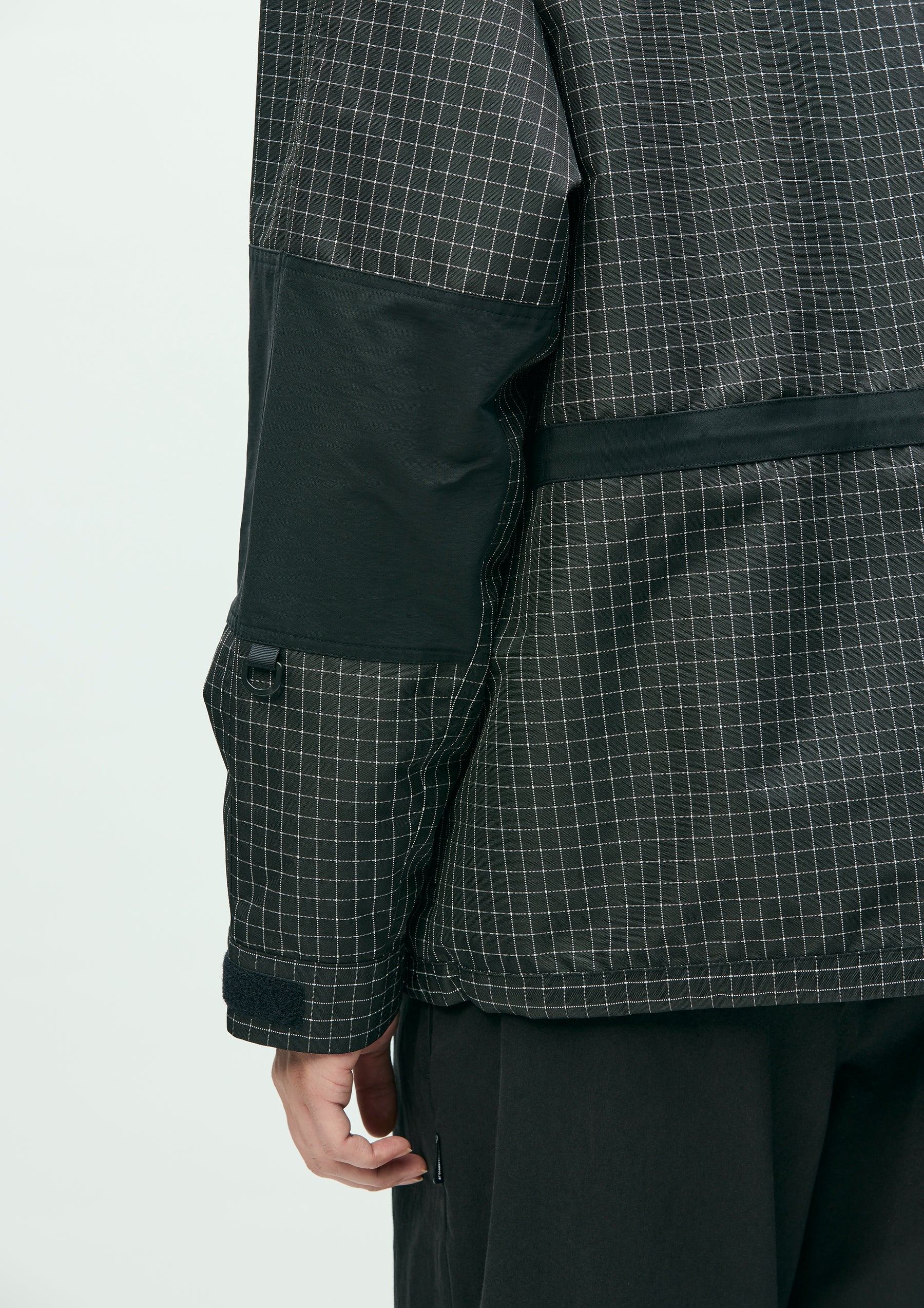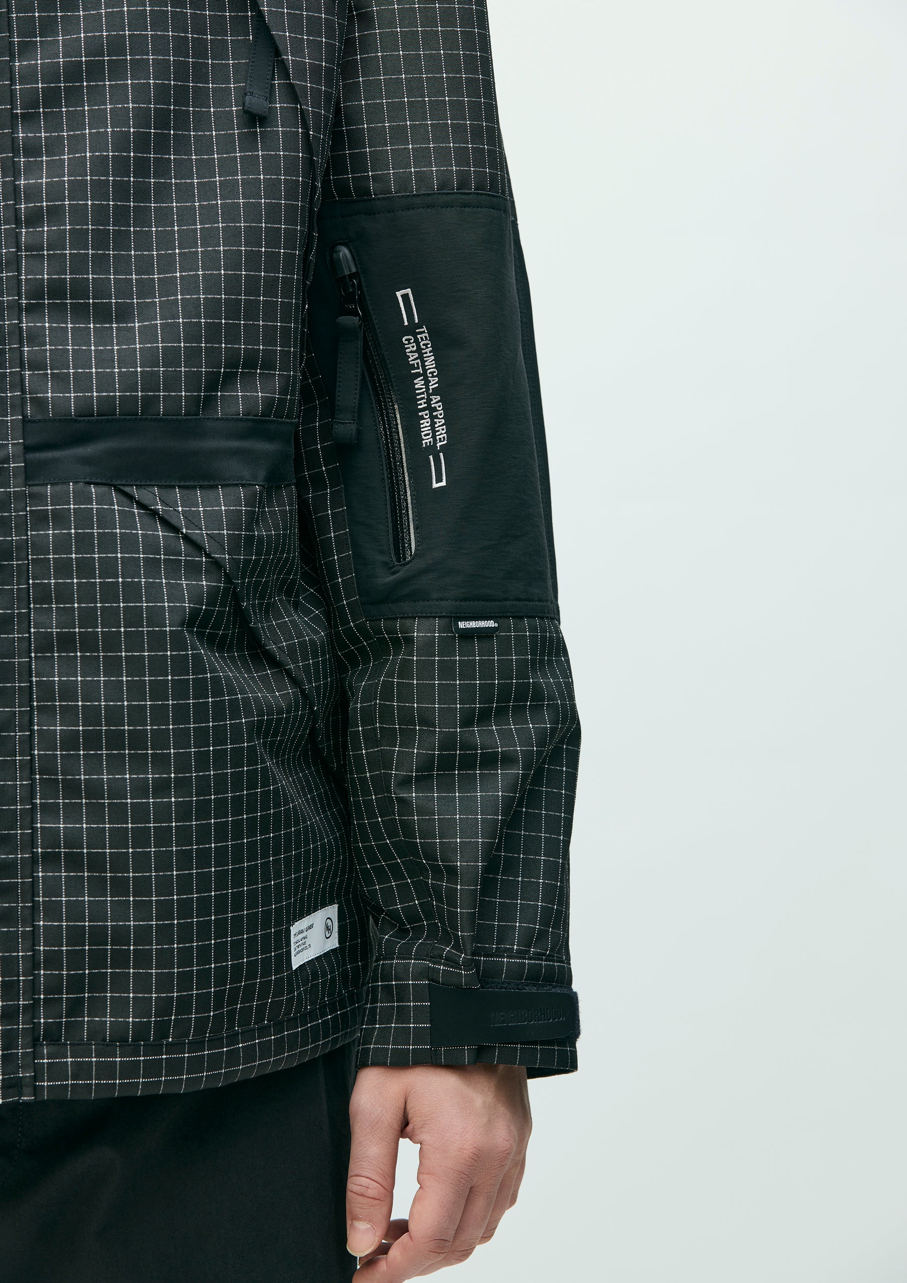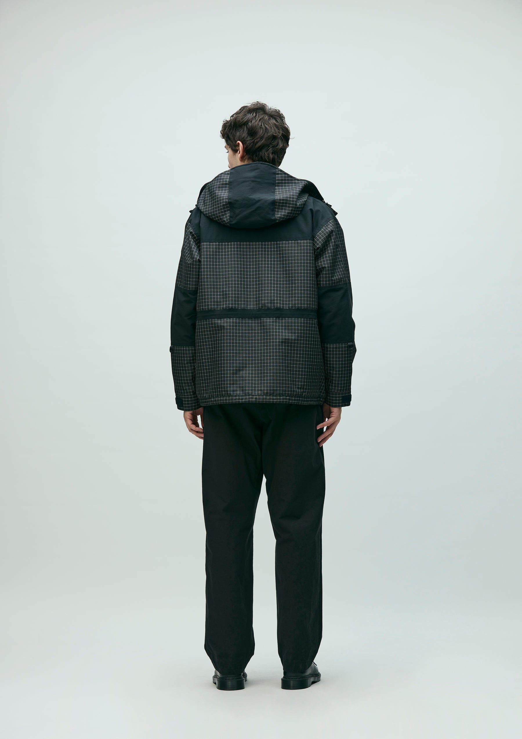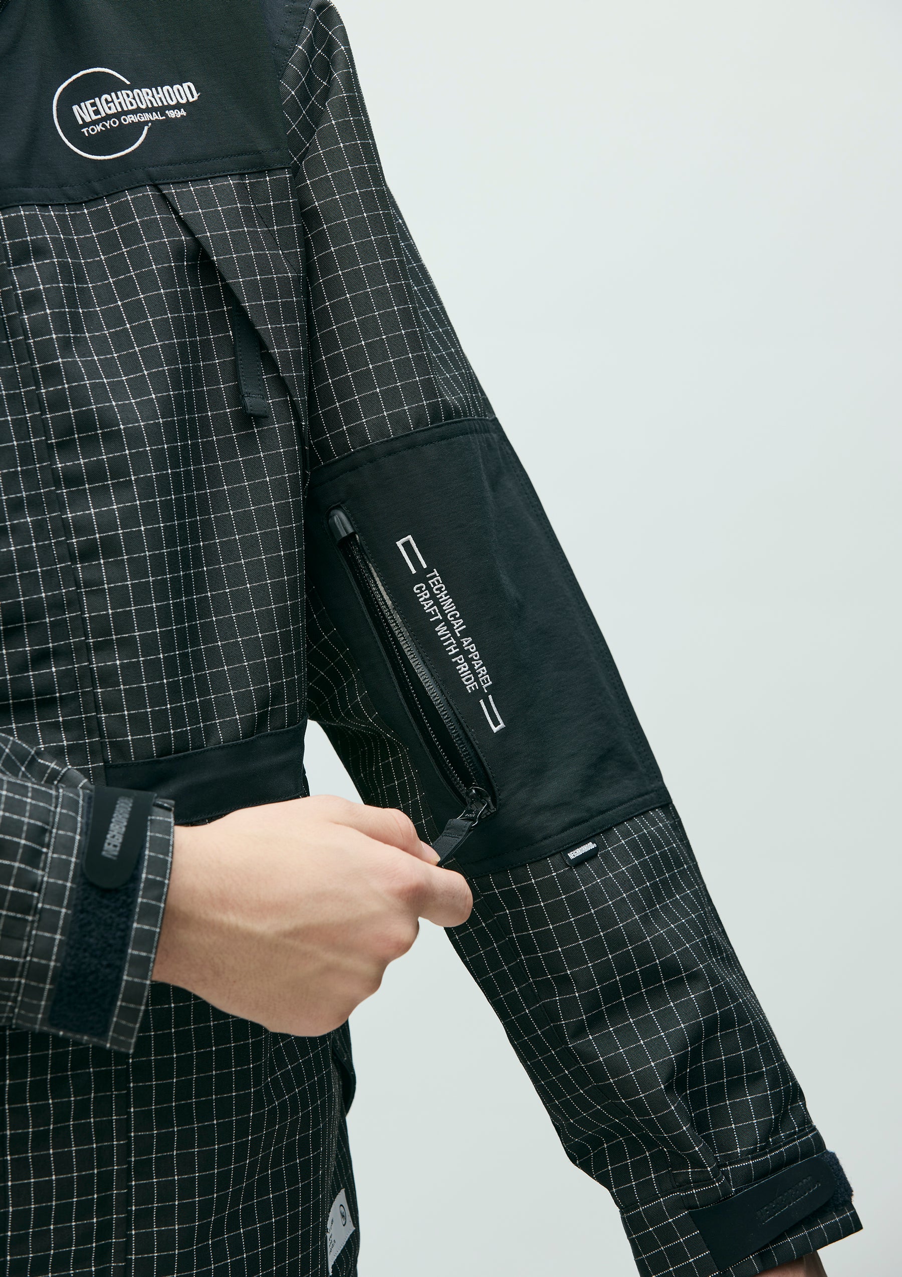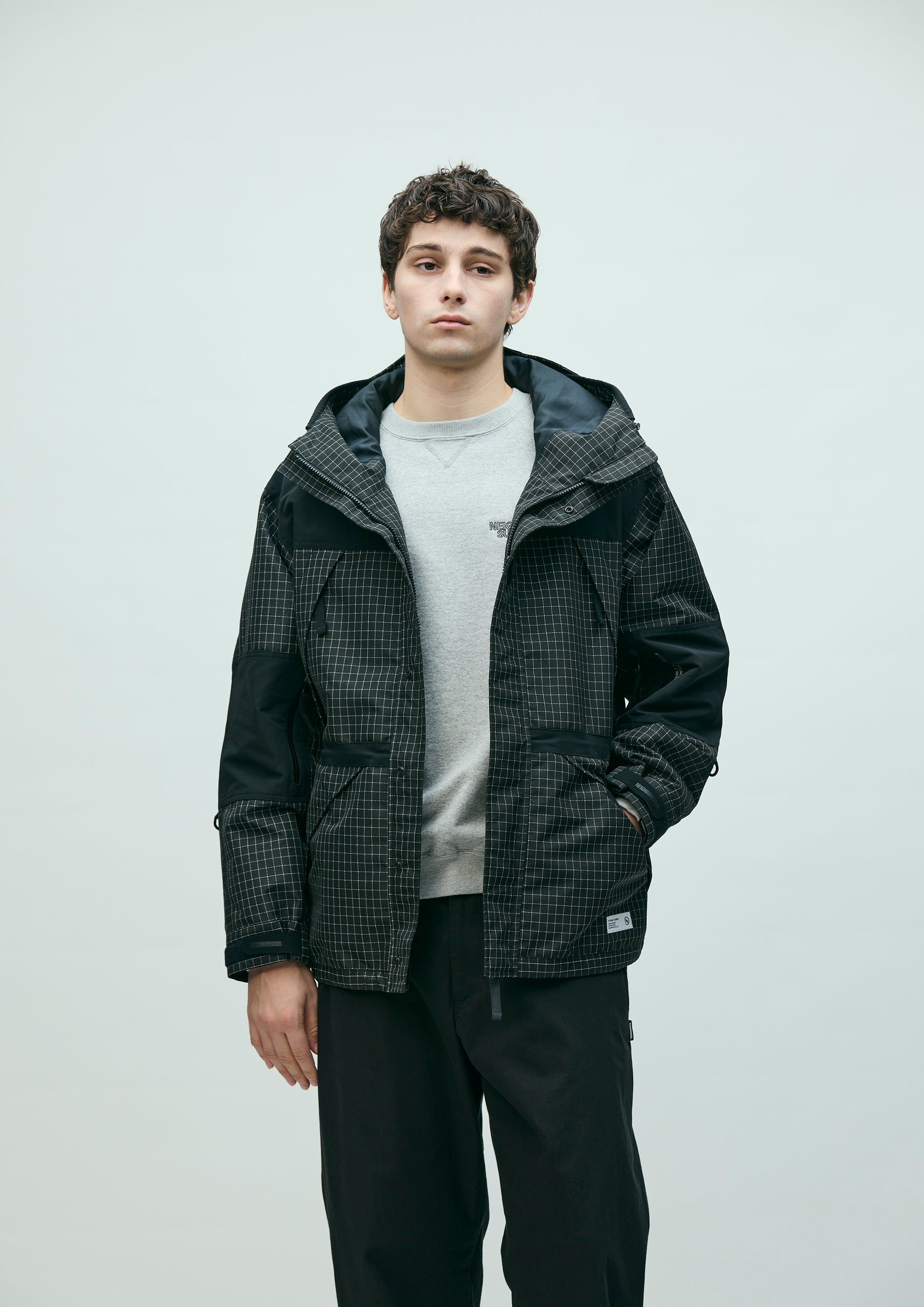 Mountain parka made from original reflective ripstop material. The textile incorporates reflector yarn for high visibility, with a water-repellent finish on the surface and an acrylic coating on the reverse side to ensure durability, water resistance, and safety. Features four waterproof zip pockets on the front body and sleeves. Finished with original Velcro tabs at the cuffs, and elastic drawcords with adjusters at the hood, waist, and hem. Logos are embroidered on the left chest and left sleeve. A brand tag is placed at the left hem, and a woven side label is attached to the left sleeve. Lined with antistatic polyester taffeta.