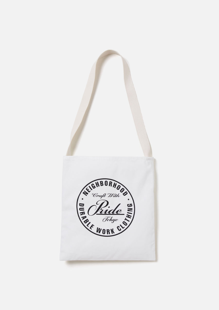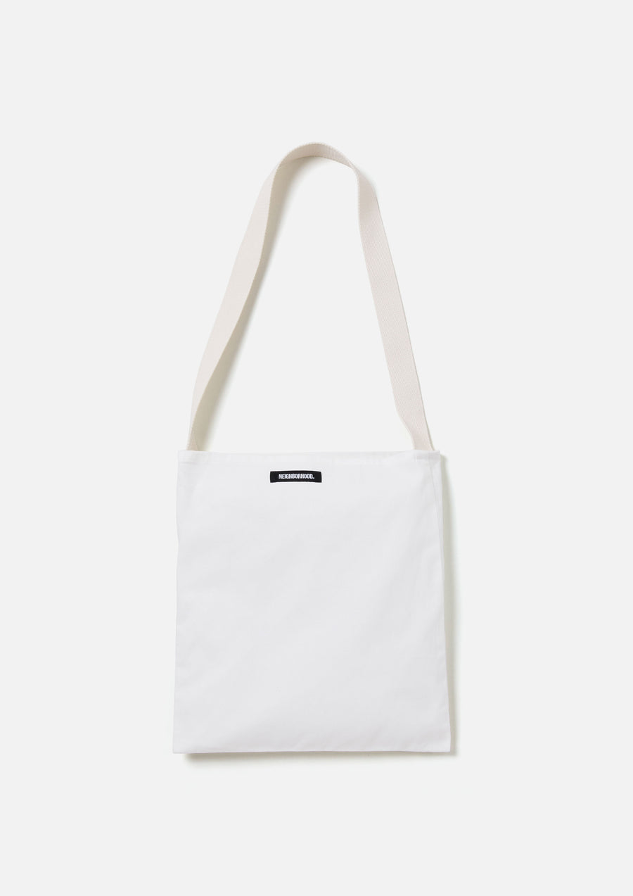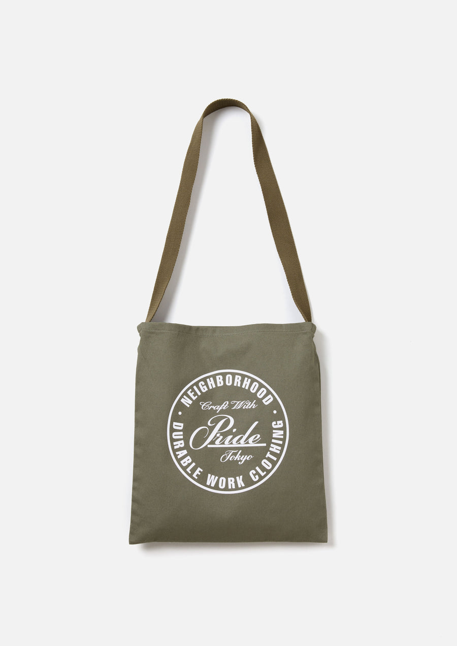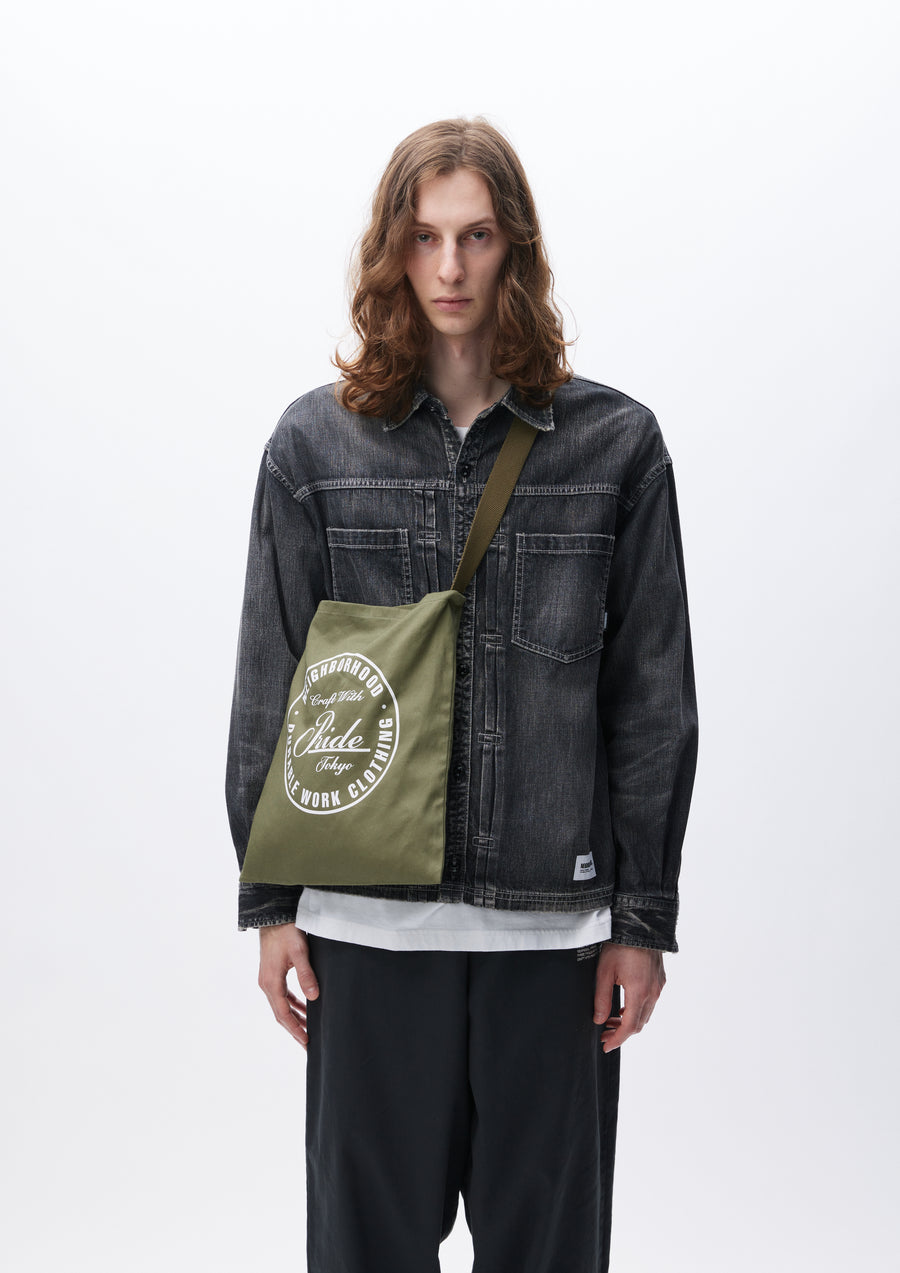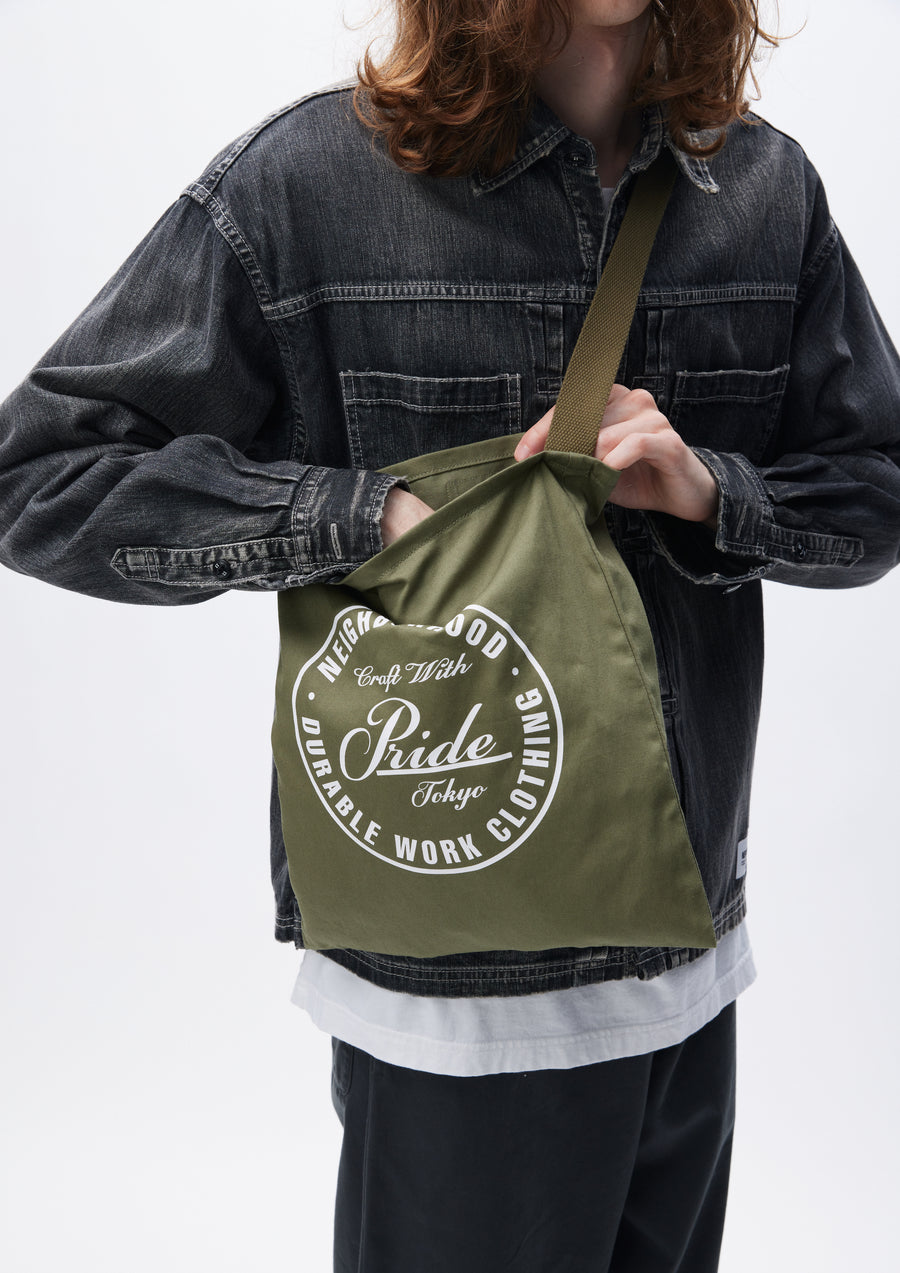 Cotton twill shoulder bag with logo print on front. The bag is made of durable, medium-weight cotton twill. The shoulder portion is made of the same color tape material, and a brand label is placed on the back.