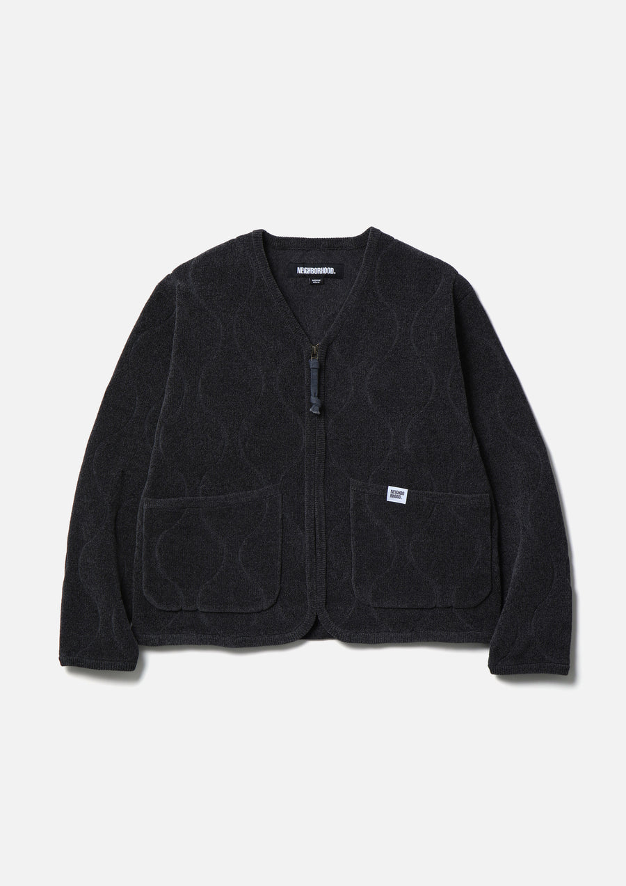 A knit cardigan made of 7-gauge jersey knit, featuring a gourd shape quilted pattern created using a drop needle stitch. Made with polyester chenille yarn. The front closure uses a metal zipper. A brand tag is placed at the pocket opening.