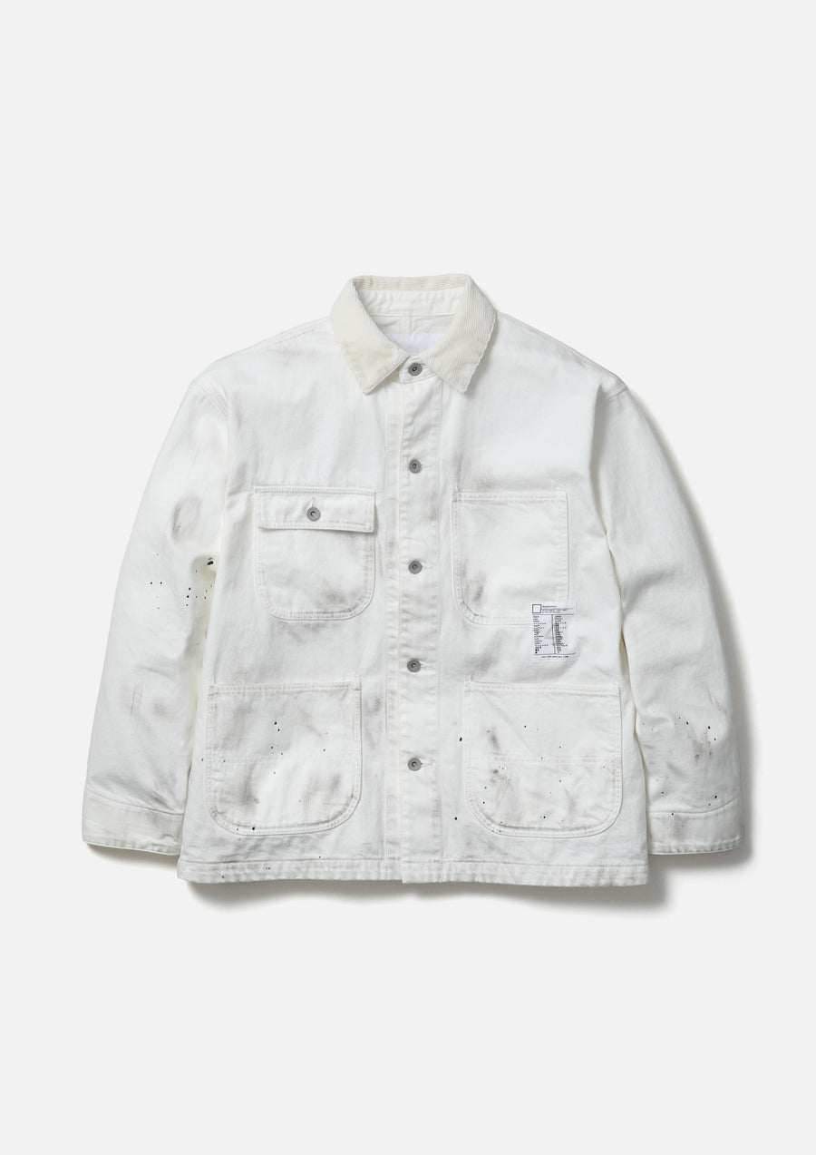 A work coverall jacket made from 12oz denim fabric with a corduroy collar. Treated with distress processing for a natural aged look. Features original tack buttons. Part of the "BLACK & WHITE" series, designed with a uniform concept, and includes a dedicated name tag. The brand tags are specially finished in the same color as the body.