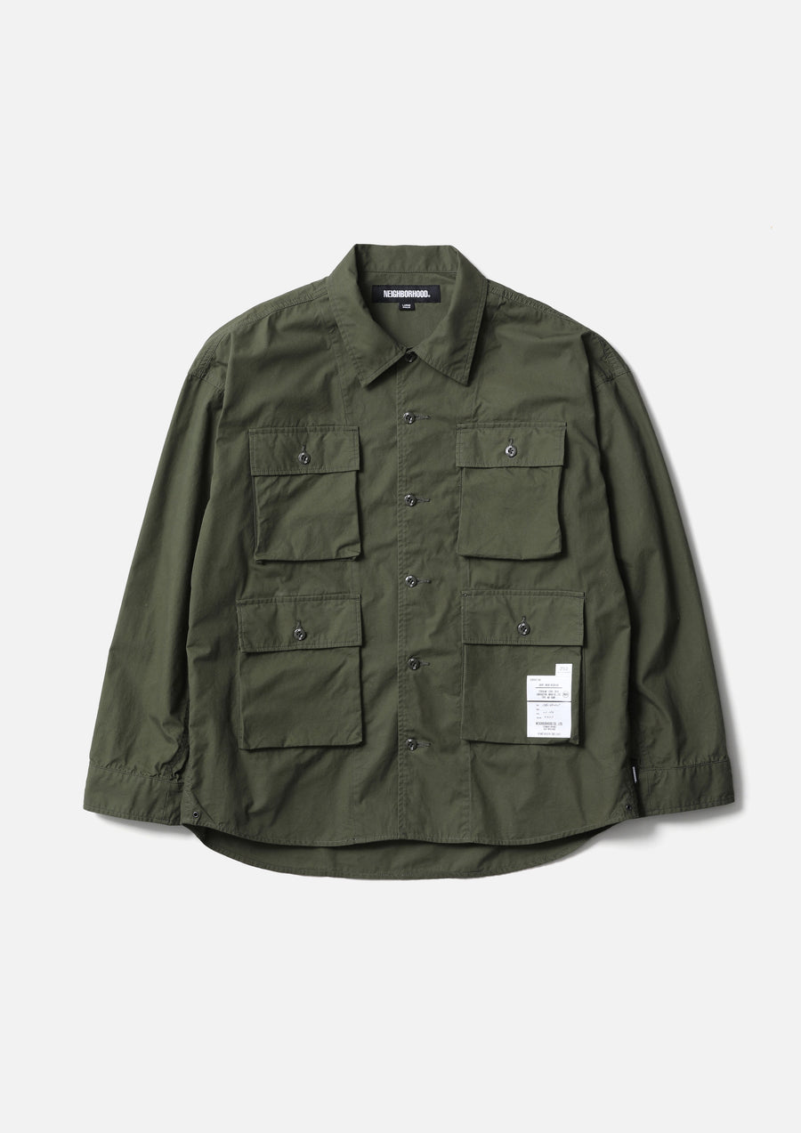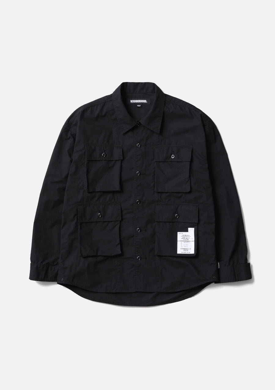 A utility shirt crafted from high-density weather-resistant fabric with a firm texture. Features four gusseted flap pockets on the front. The tubular sleeves have an adjustable design. Equipped with original four-hole buttons, a dedicated name tag on the pocket, and a brand tag on the side seam. One-wash finish.