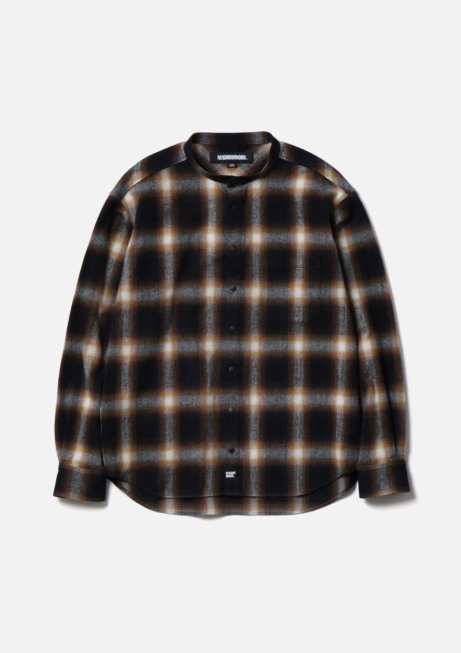 A stand-collar check shirt made from plain-weave ombré check fabric with a shaggy brushed finish. The front features plastic dot buttons. A brand tag is attached to the placket and side seam. One-wash finish.