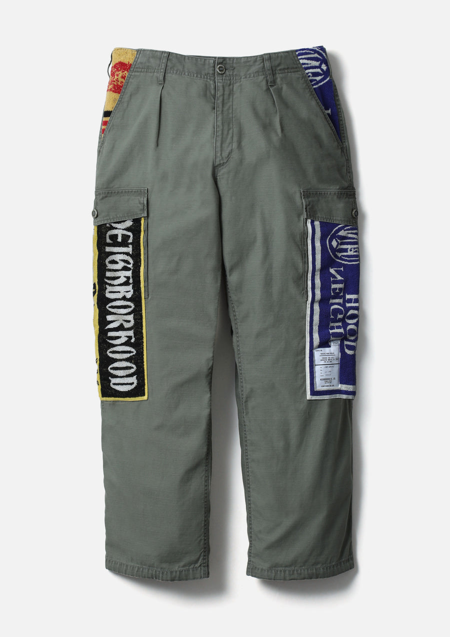 Cargo pants featuring original pub towel detailing on both side pockets and the back. Made from slub-yarn back satin fabric, dyed using both reactive and pigment dyeing techniques. Designed with an original front zipper, signature tape, and parachute buttons. Finished with a brand tag on the pocket. Relaxed silhouette.