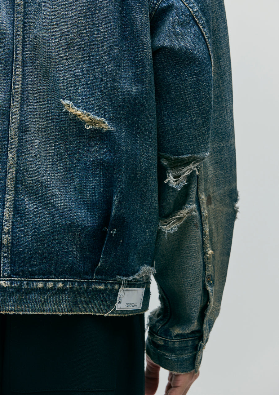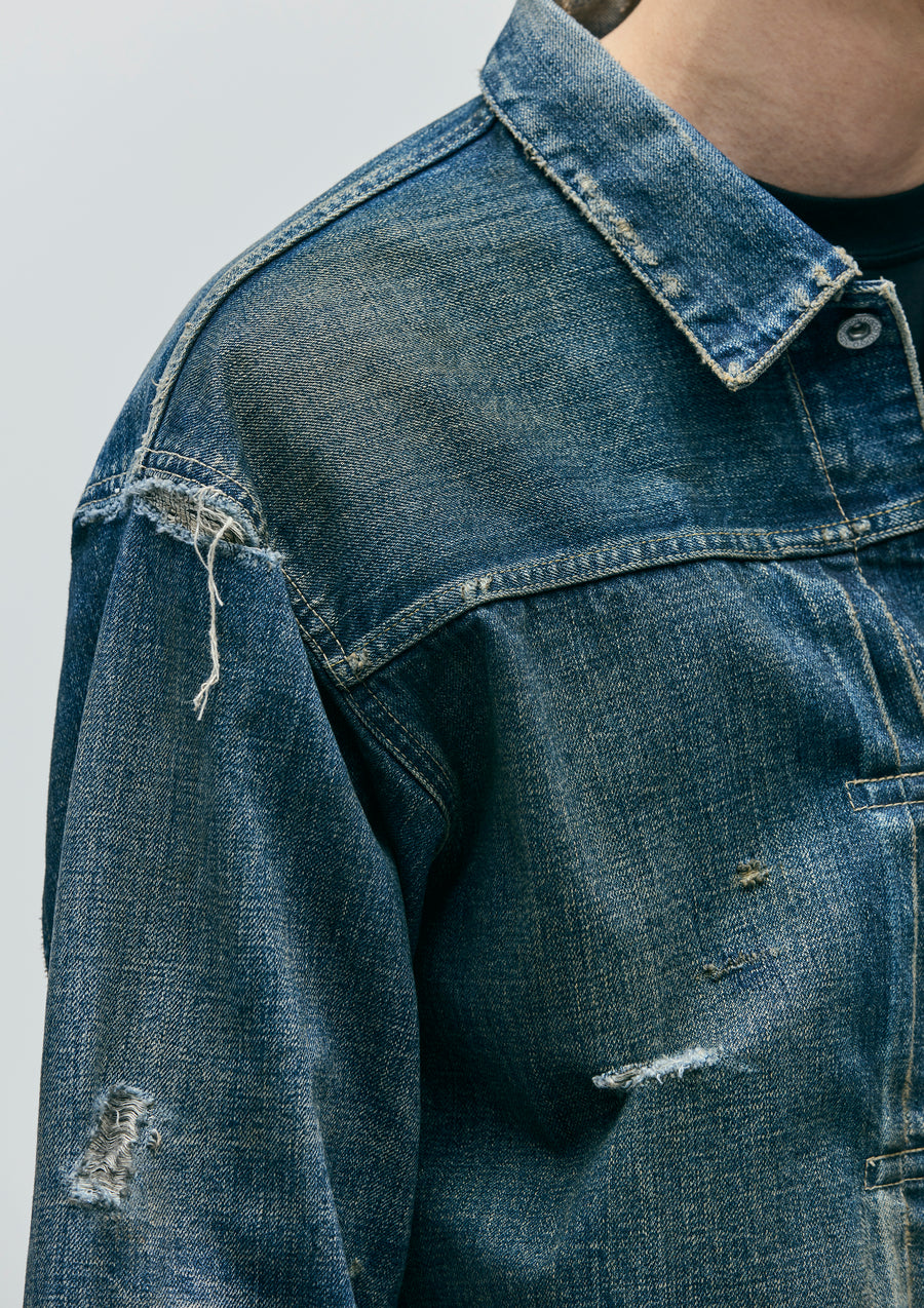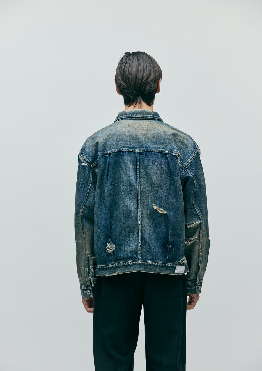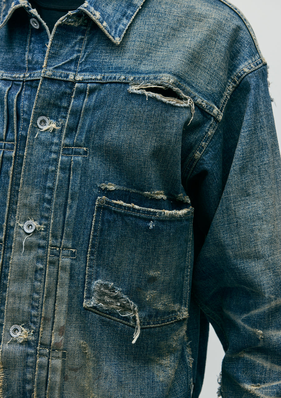 A 1st-type denim jacket made from original 12oz denim fabric, featuring extreme savage processing. It showcases an aging effect that goes beyond standard savage processing, with heavy distressing, remake details, and significant fading to express fabric deterioration. The jacket is accented with contrast stitching and features original tack buttons and rivets. It also includes a brand tag on the side seam and a custom-crafted size label.