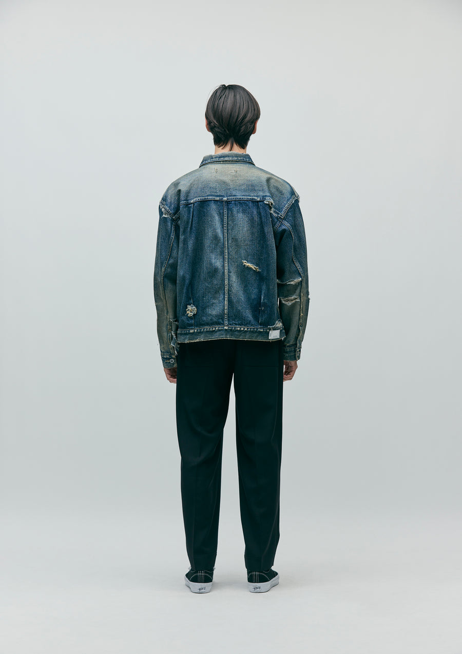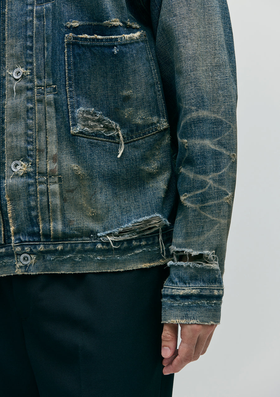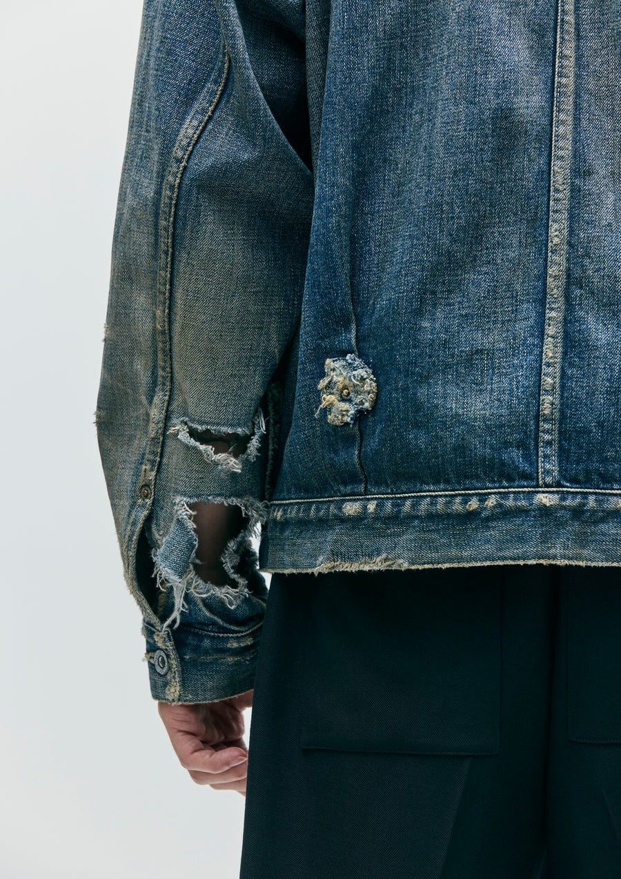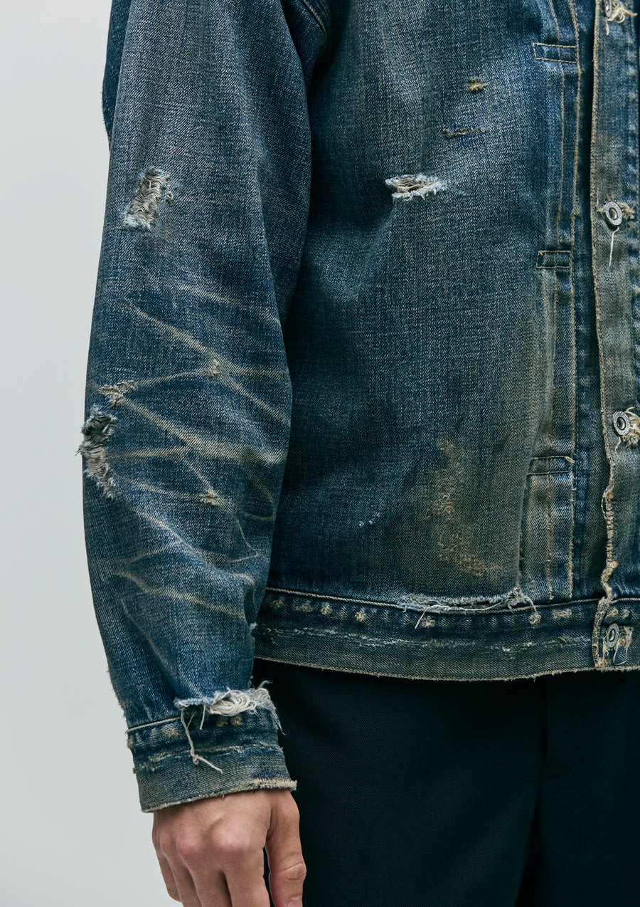 A 1st-type denim jacket made from original 12oz denim fabric, featuring extreme savage processing. It showcases an aging effect that goes beyond standard savage processing, with heavy distressing, remake details, and significant fading to express fabric deterioration. The jacket is accented with contrast stitching and features original tack buttons and rivets. It also includes a brand tag on the side seam and a custom-crafted size label.
