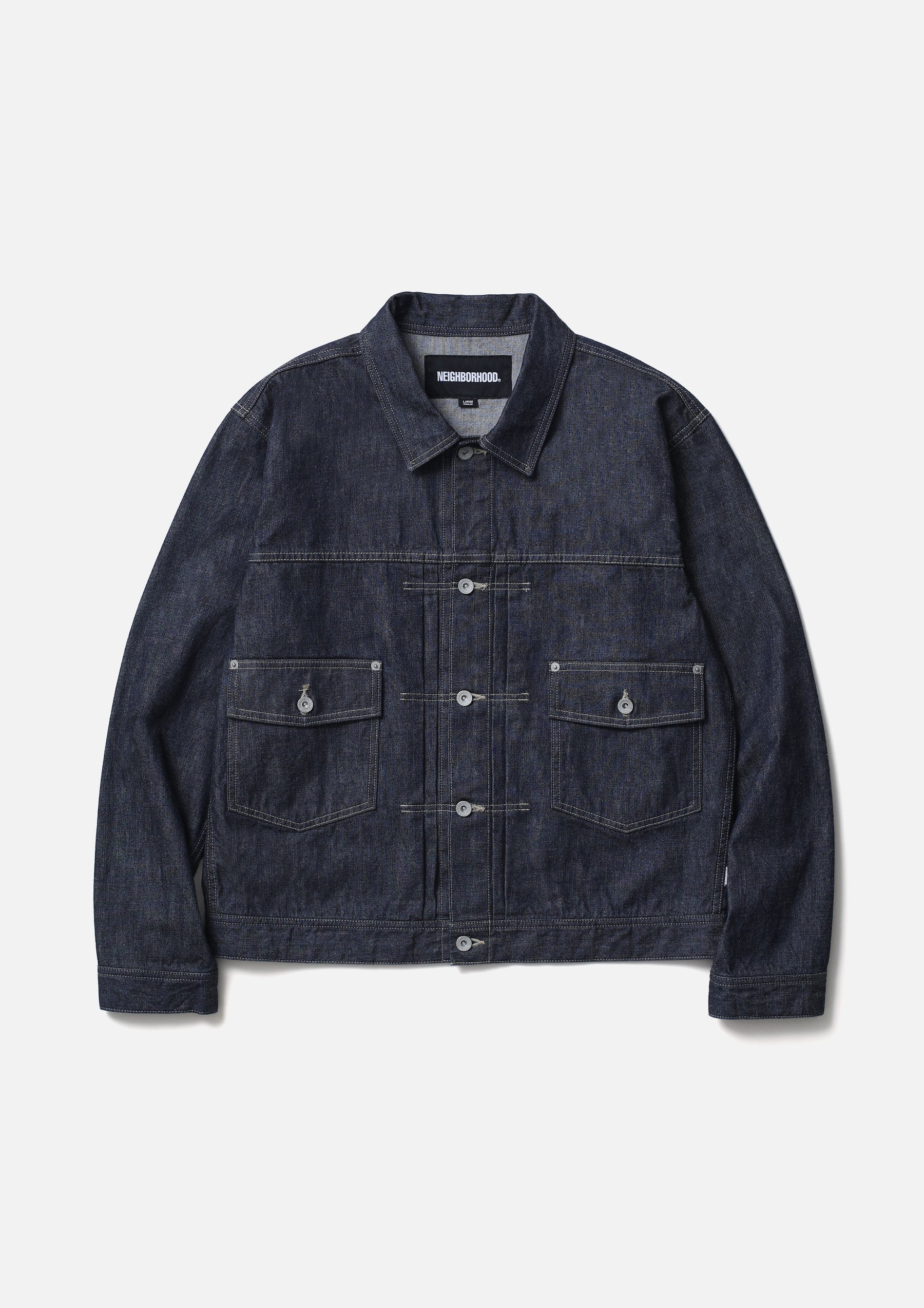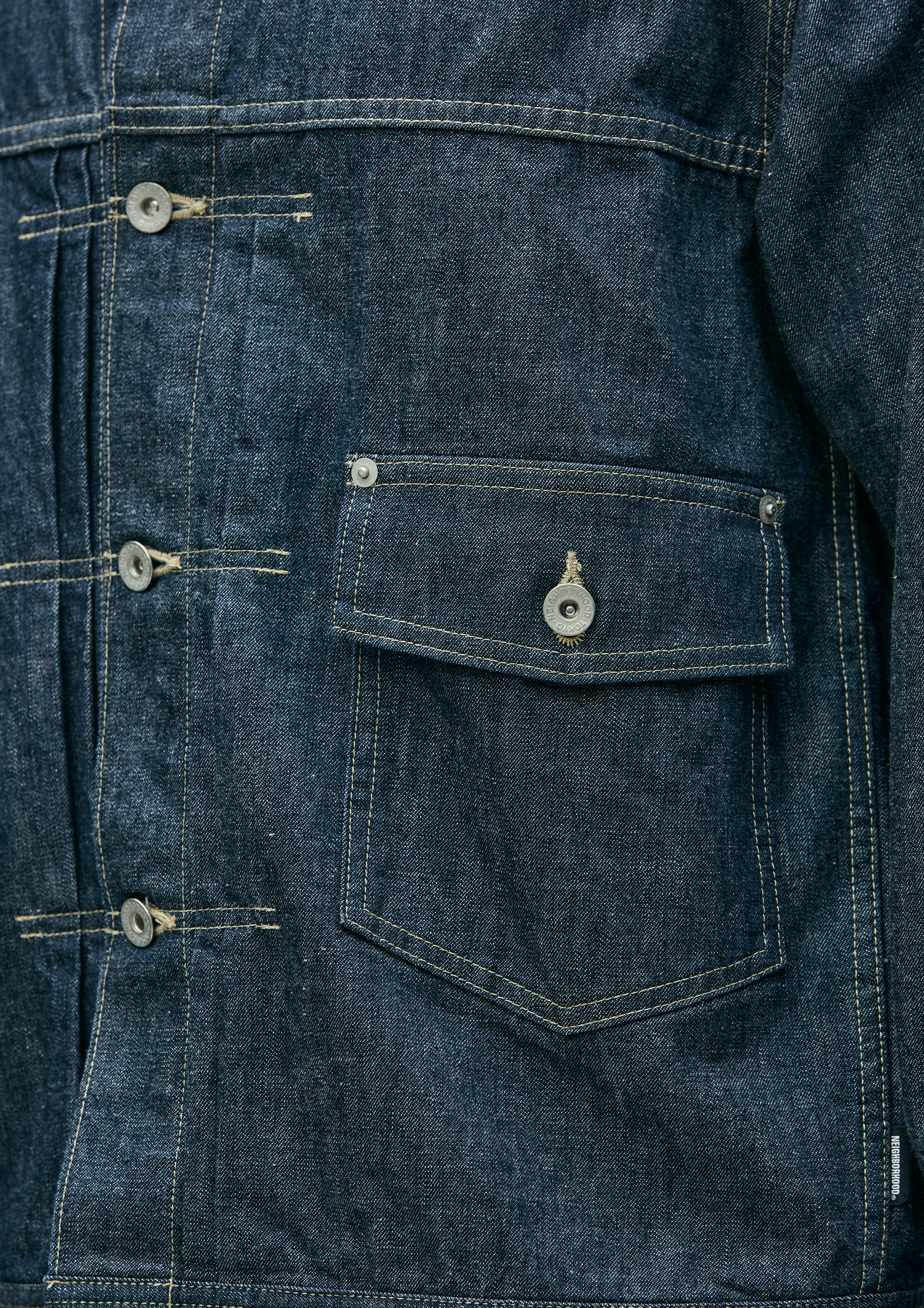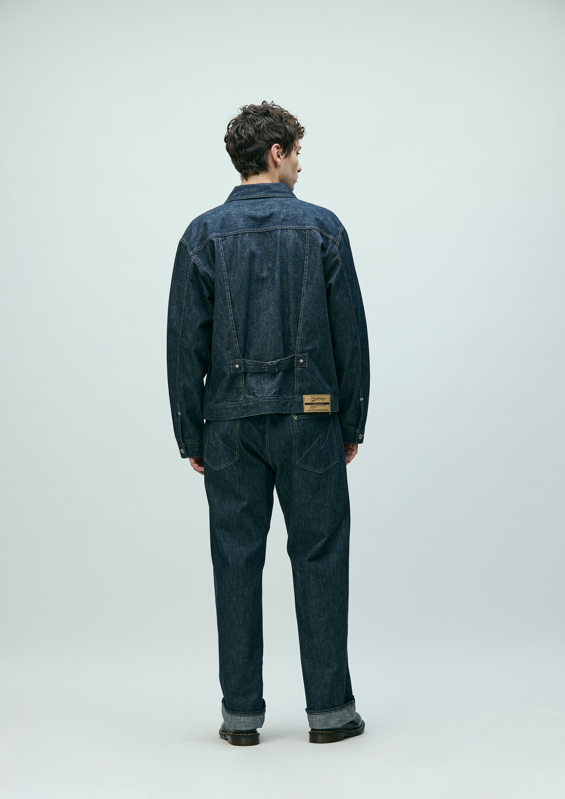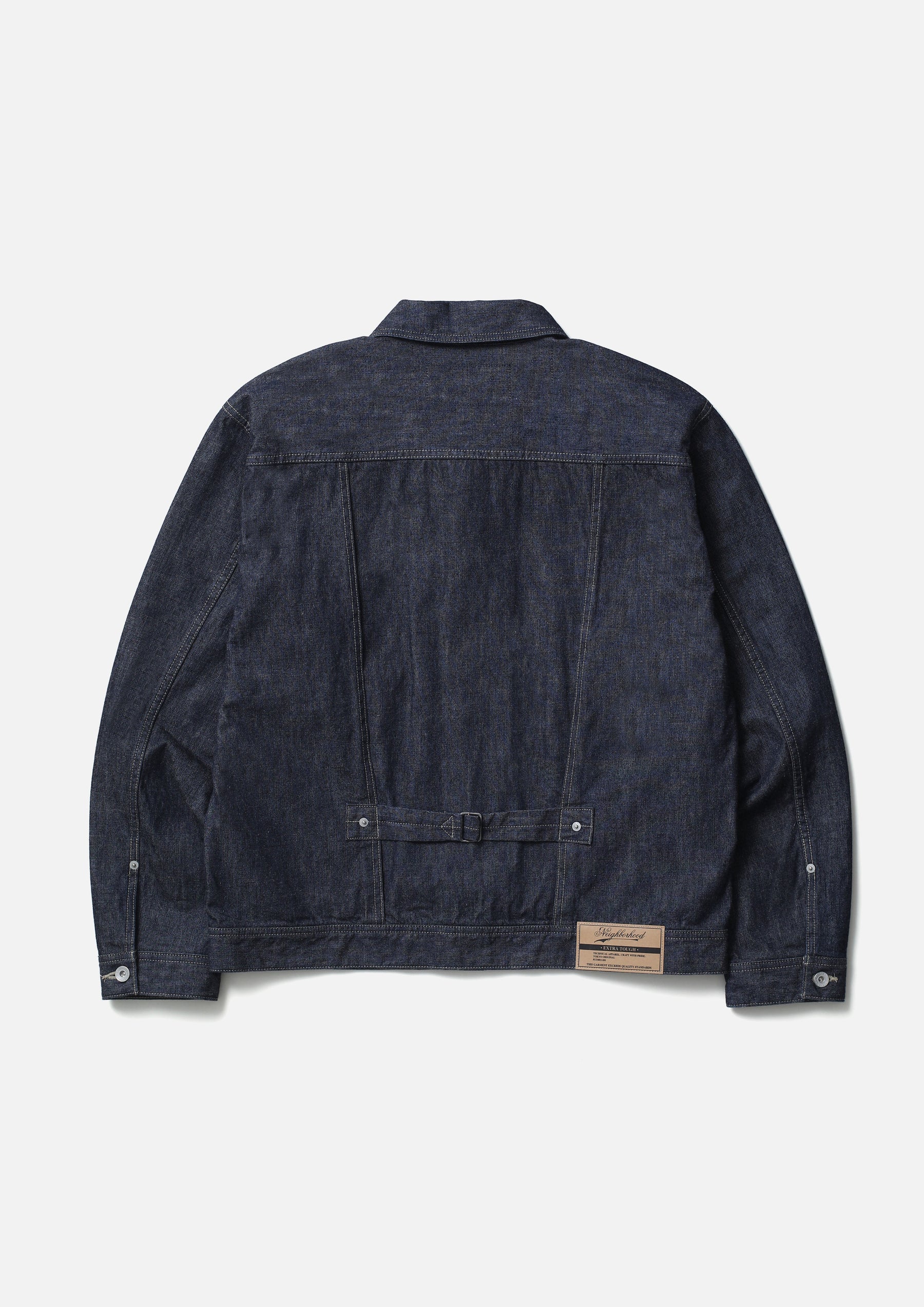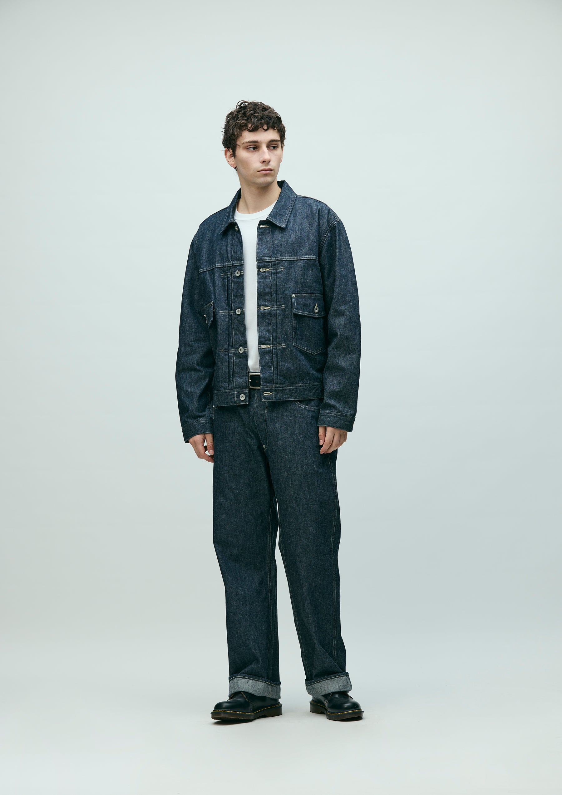 Lightweight denim jacket made from original 11oz denim fabric. Features classic construction details such as chain-stitched cuffs and waistband lining, floating back pleats, and single skipped stitches at the collar tips. Finished with original tack buttons and rivets. A woven side label is attached at the side seam. Completed with a one-wash finish.