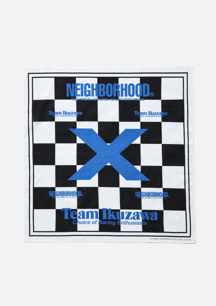 Bandana made from cotton compas fabric. Graphics are applied using hand-printing. Edges are finished with rolled-hem stitching. Completed with a one-wash finish. Collaborative model with Team Ikuzawa.