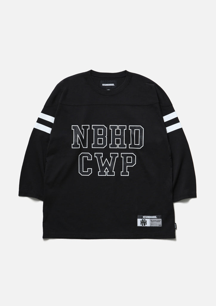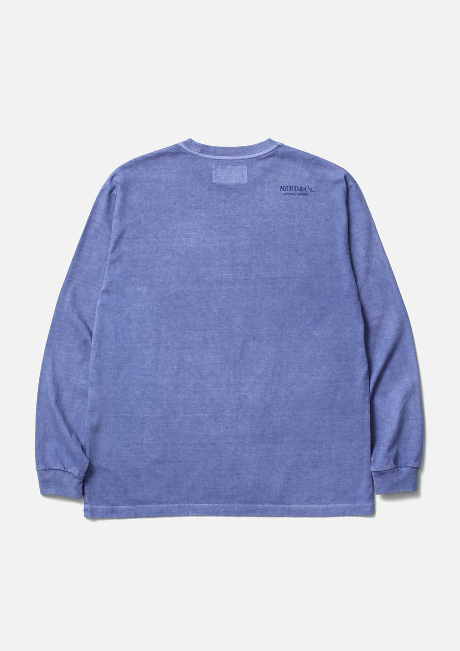 Long-sleeve crewneck cut-and-sew top made from jersey fabric, garment-dyed with a pigment finish. Features an embroidered logo on the right back shoulder. A brand tag is placed at the left hem, and a woven side label is attached at the side seam.