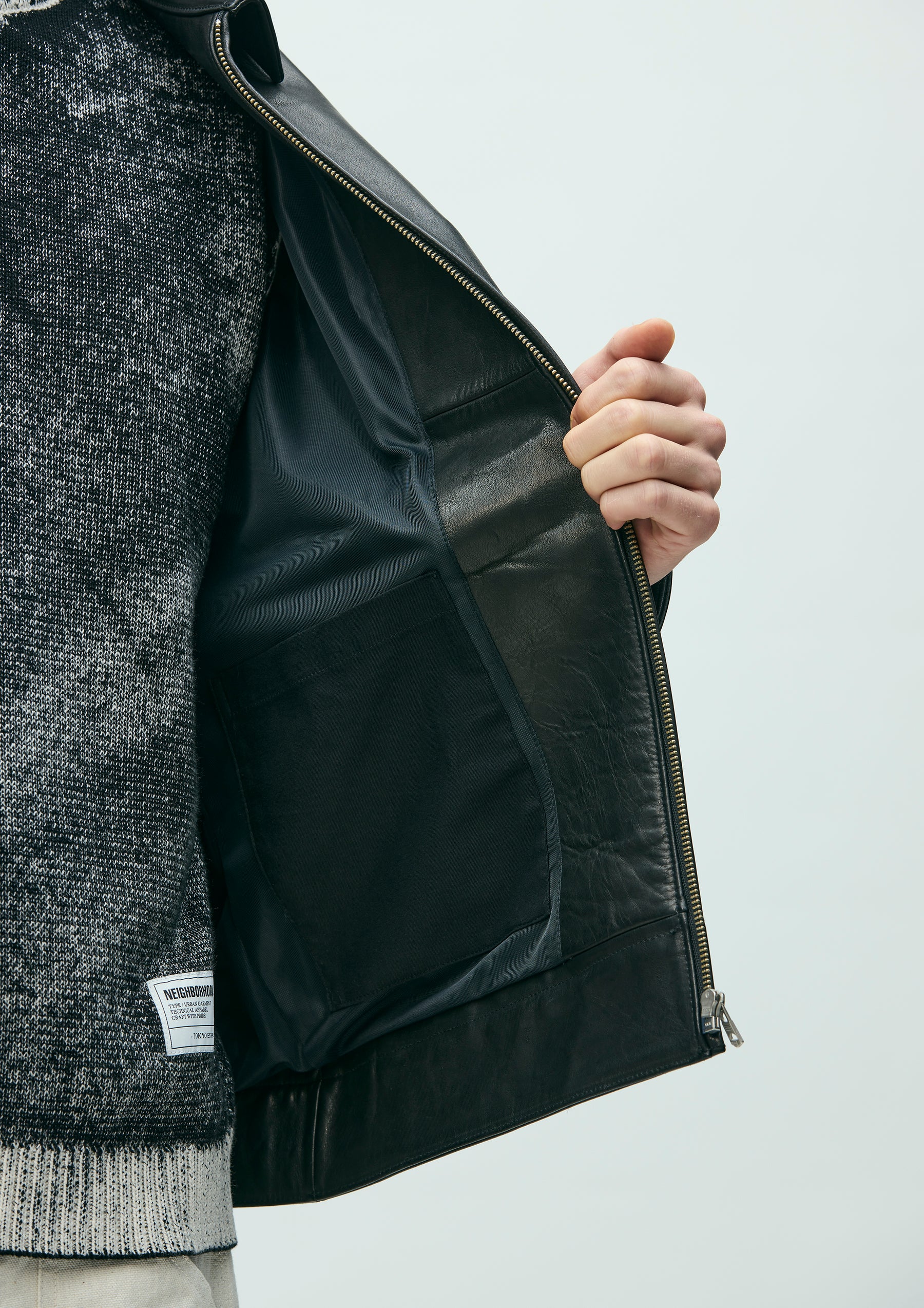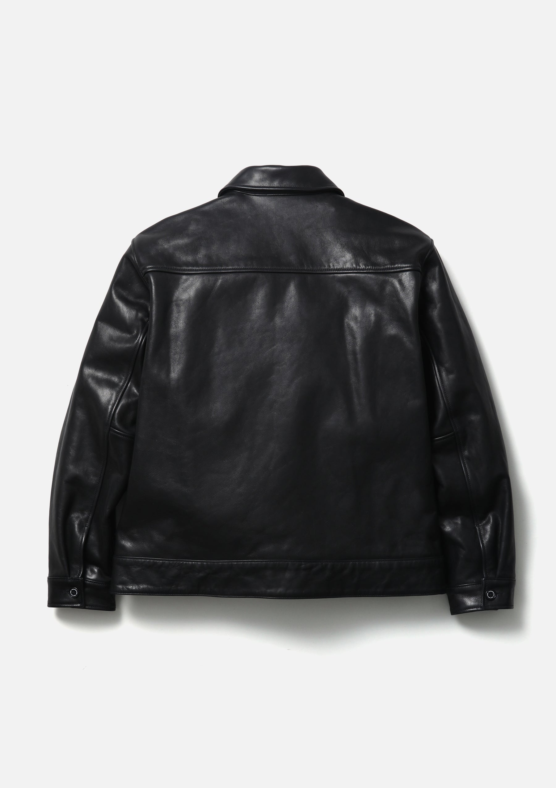 Leather sports jacket made from cowhide. Equipped with a zip pocket featuring a chain puller, waist pockets, and an inner pocket lined with cotton fabric. Finished with original buttons and zipper pulls. A woven side label is placed at the side seam. Features a breathable mesh lining.