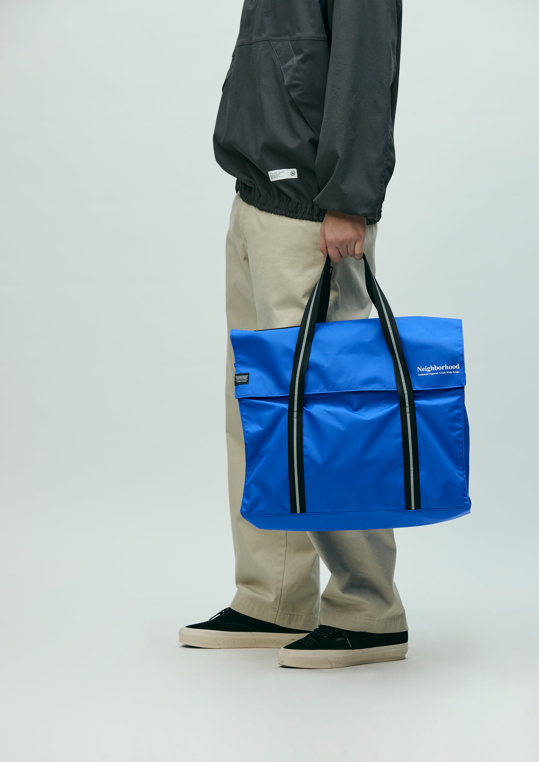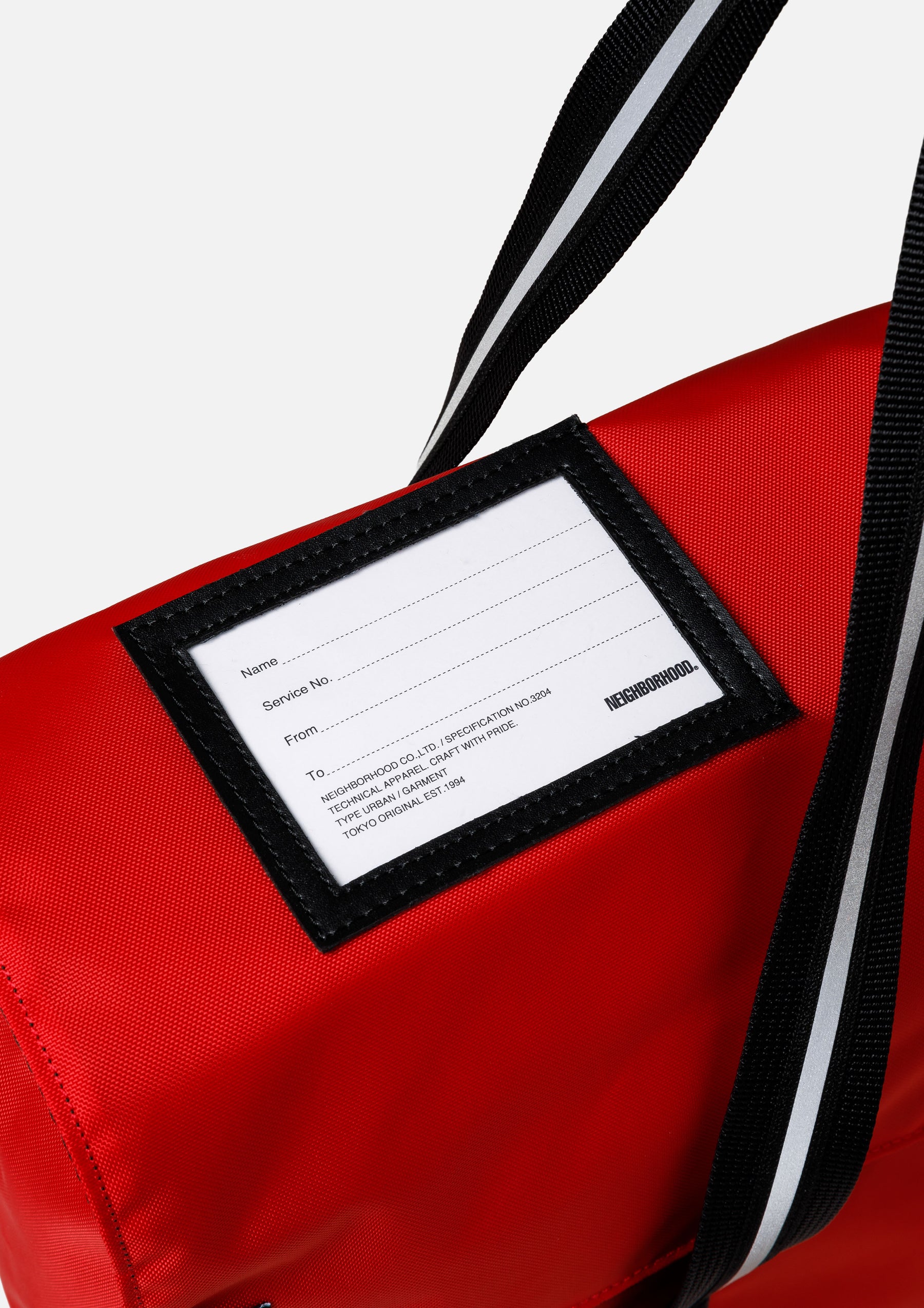 Tote bag made from nylon oxford fabric treated with Teflon for excellent durability and water repellency. Designed with a simple flap-opening structure inspired by actual postal delivery bags, allowing easy access to belongings. Features an ID card holder on the flap and an interior zip pocket for convenient storage of small items. The front is detailed with a logo print and brand tag.