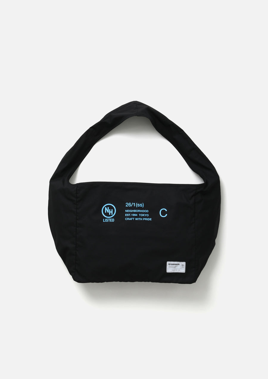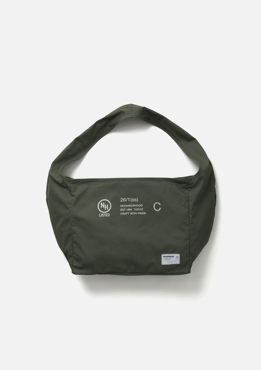 Newspaper bag made from medium-weight weather fabric with a balanced structure, offering both firmness and a soft texture while remaining lightweight. Features an interior zip pocket for convenient small-item storage. Designed with a wide gusseted silhouette, making it practical for everyday use as well as travel. Finished with a brand tag on the front.