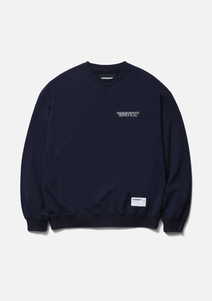 Crewneck pullover made from fleece fabric spun with organic cotton. Features an embroidered logo on the left chest. A brand tag is placed at the left hem, and a woven side label is attached at the cuff. Completed with a one-wash finish.