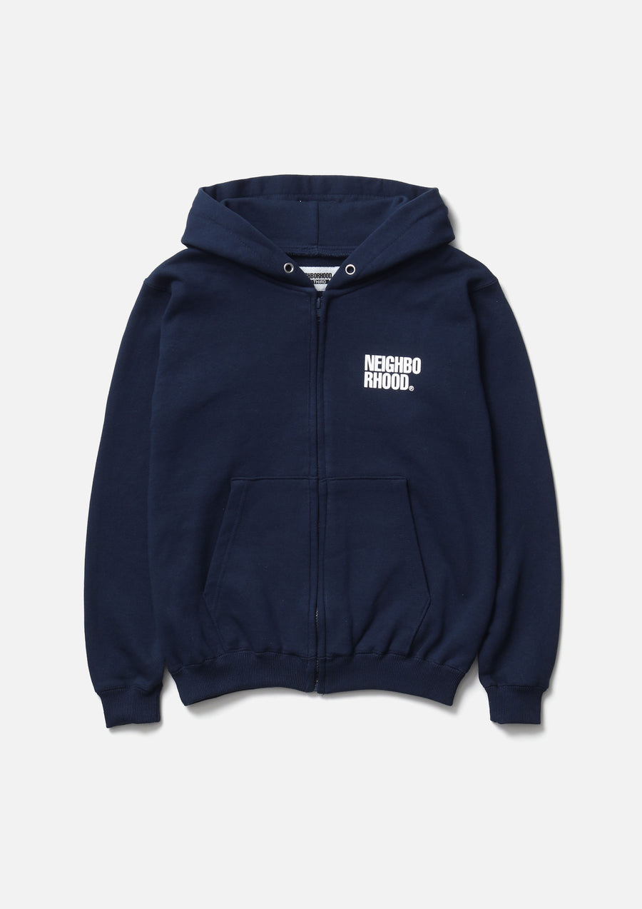 A zip-up hoodie made of mid-weight cotton fleece fabric. Printed logo on the left chest and back. A name tag is placed on the hood.