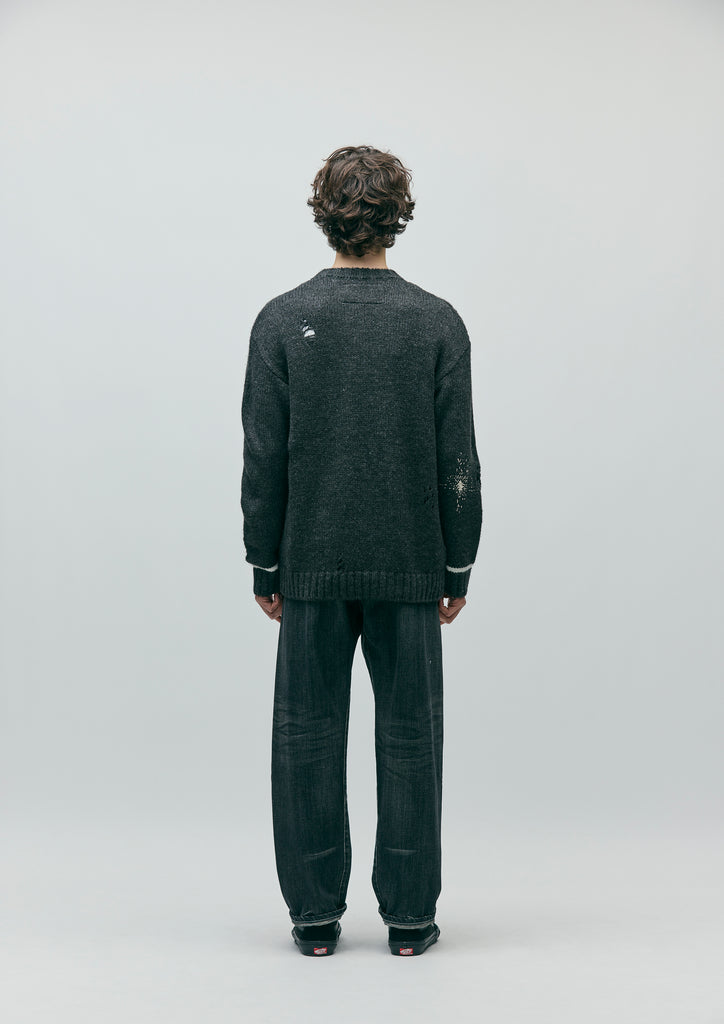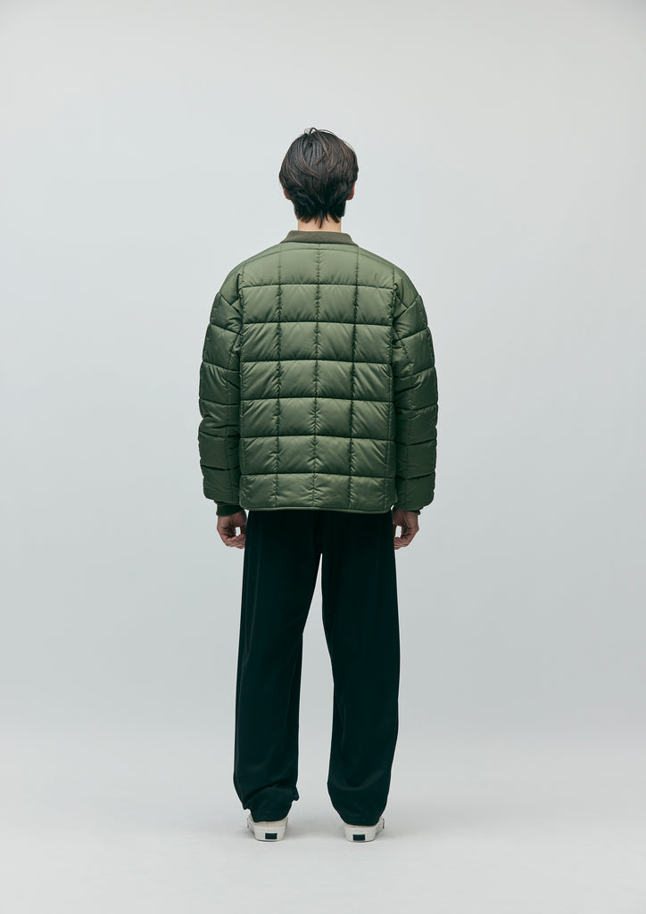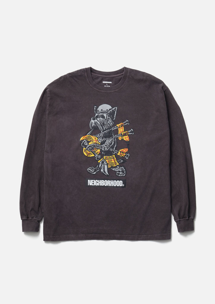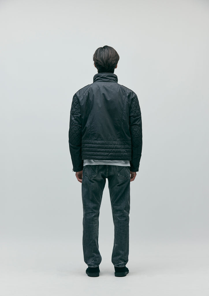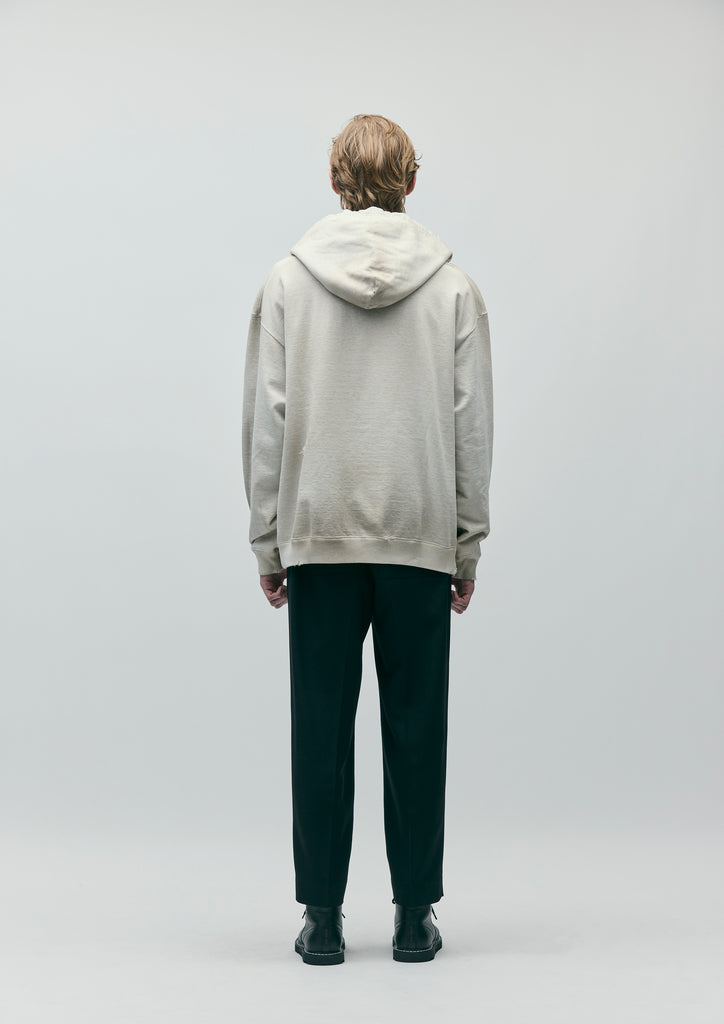 A no-collar shirt made from back satin fabric, woven with a blend of slub and straight yarns in a 1:2 ratio and finished with a mercerization treatment. The fabric undergoes bio-stone processing at the product stage for a soft texture. The hem is designed with a belt detail. A printed logo on the left chest. Equipped with original cat-eye buttons, a dedicated name tag on the left hem, and a brand tag on the side seam.