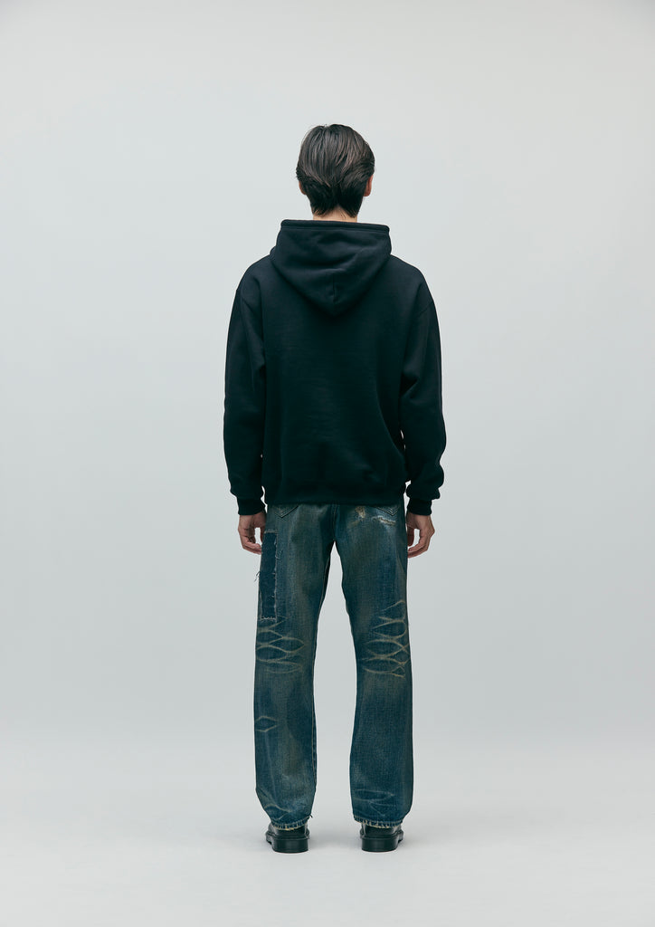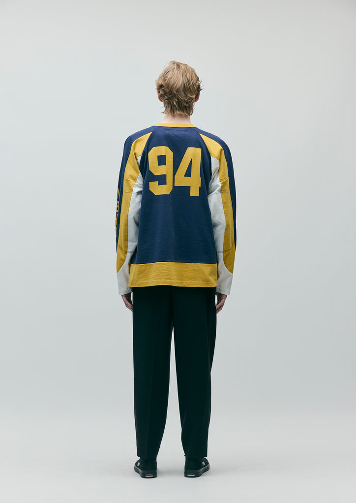A striped shirt made from premium extra-long staple cotton with a silky sheen and smooth texture. Features two types of stripe patterns in a patchwork, utilizing the pattern switch for patch pockets. Embroidered logo on the right body. Equipped with original shell-like buttons, a brand tag on the left hem and side seam. One-wash finish.
