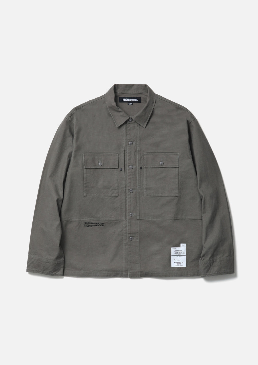 A BDU shirt made from a richly textured serge weave fabric dyed with sulfur-based dye. The sulfur dye gives it a unique appearance. Features flap chest pockets and side pockets integrated into the body. Adjustable tube sleeves. Embroidered logo on the right body. Equipped with original four-hole buttons, a brand tag on the left hem and side seam. One-wash finish.