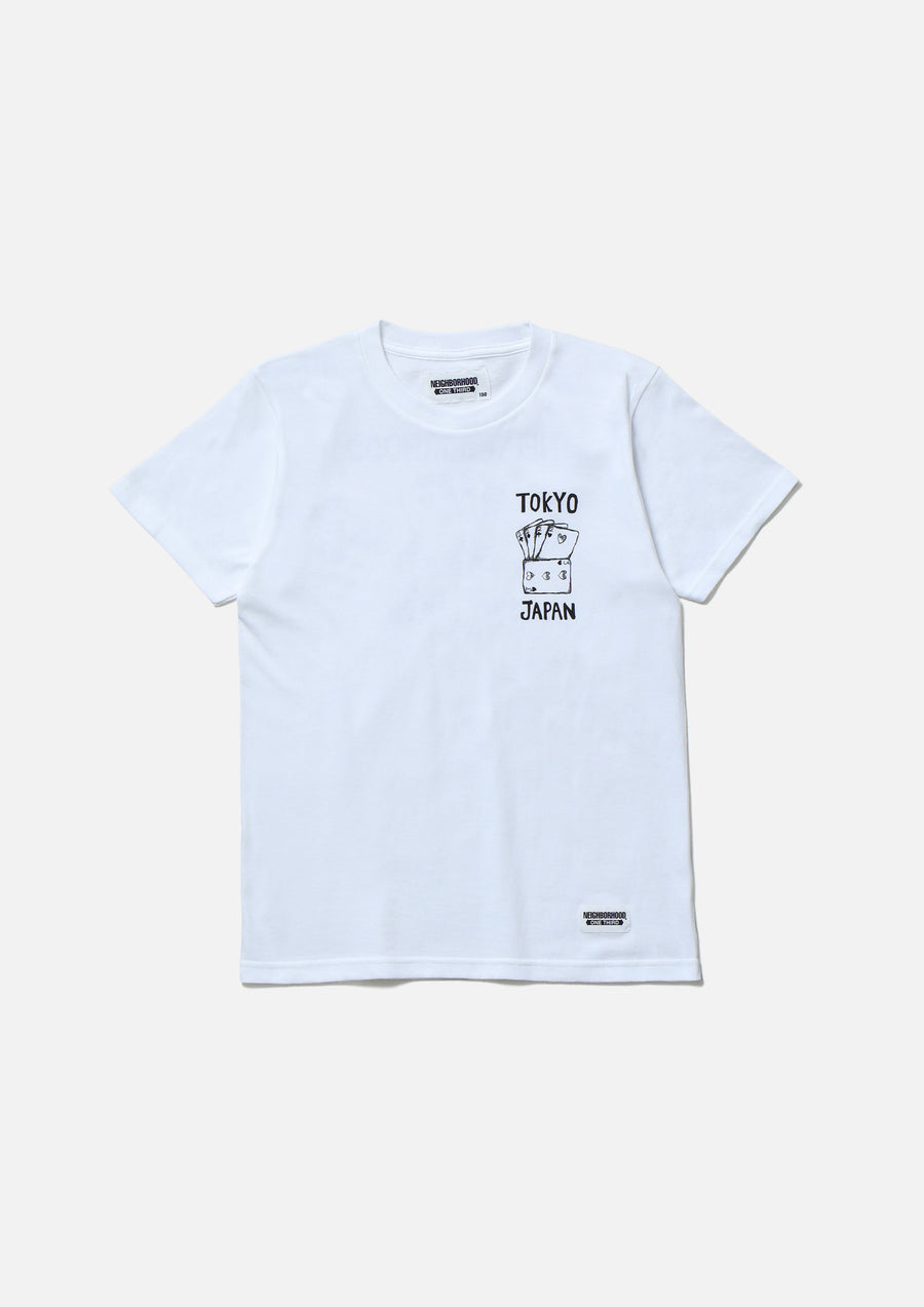 A short-sleeve T-shirt made of a 5.6oz heavyweight body. Graphic prints on the left chest and back. A name tag is placed on the left hem.