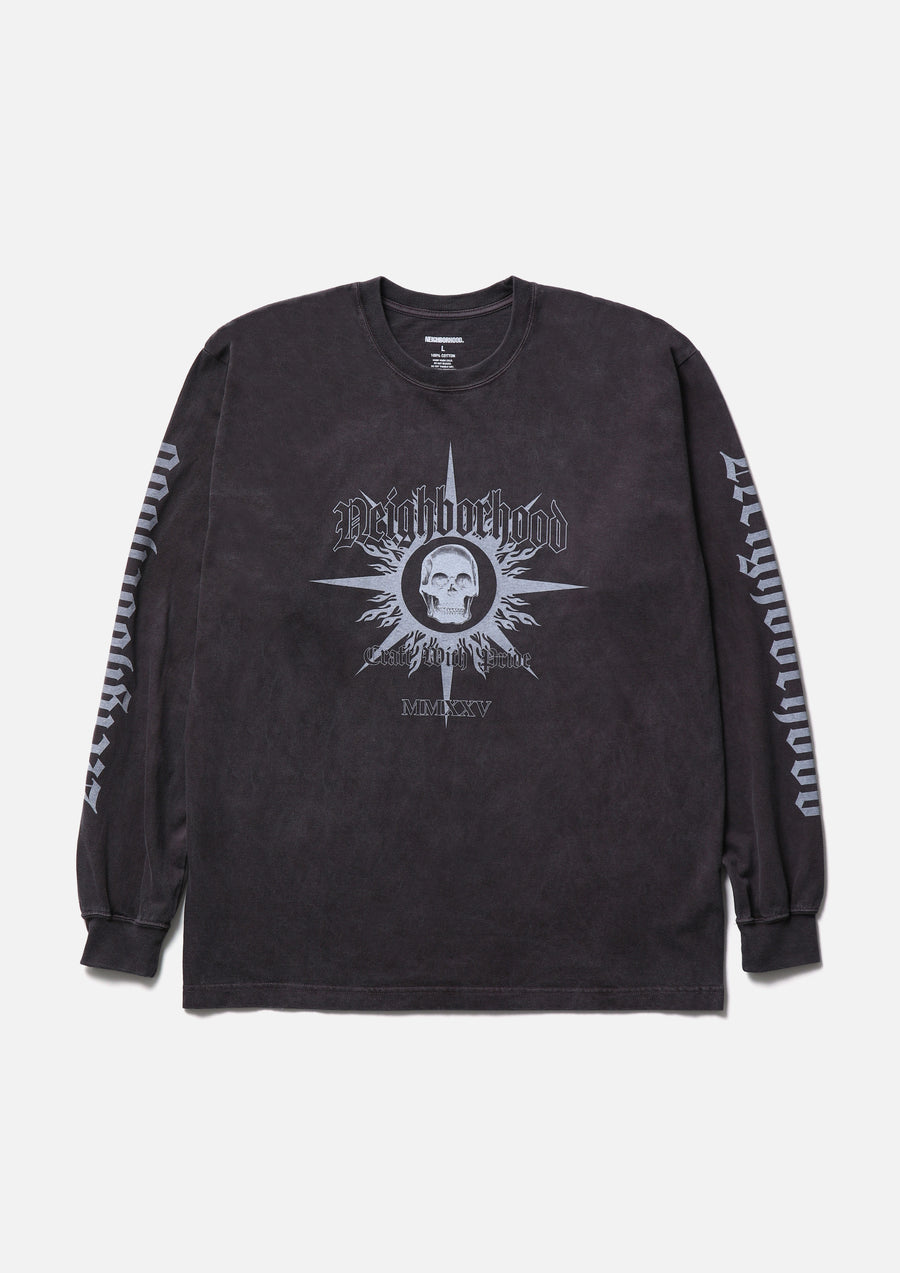 A long-sleeve T-shirt made of an original cotton jersey body, pigment-dyed for a unique finish. Printed graphics on the front and sleeves. One-wash finish.
