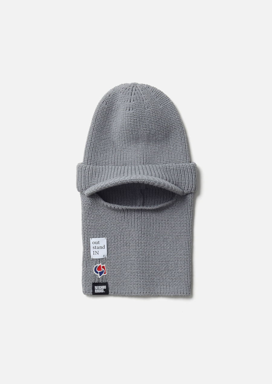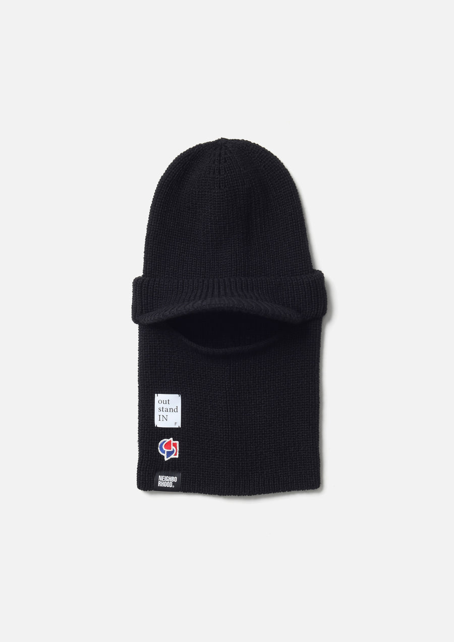 A collaborative item with out stand IN, a brand led by art director Tetsuya Nagato and designer/creative director Kazuki Kuraishi. A brimmed balaclava that can also be worn as a knit cap by storing the mask section. Made from acrylic yarn. Features a logo patch on the right hem.