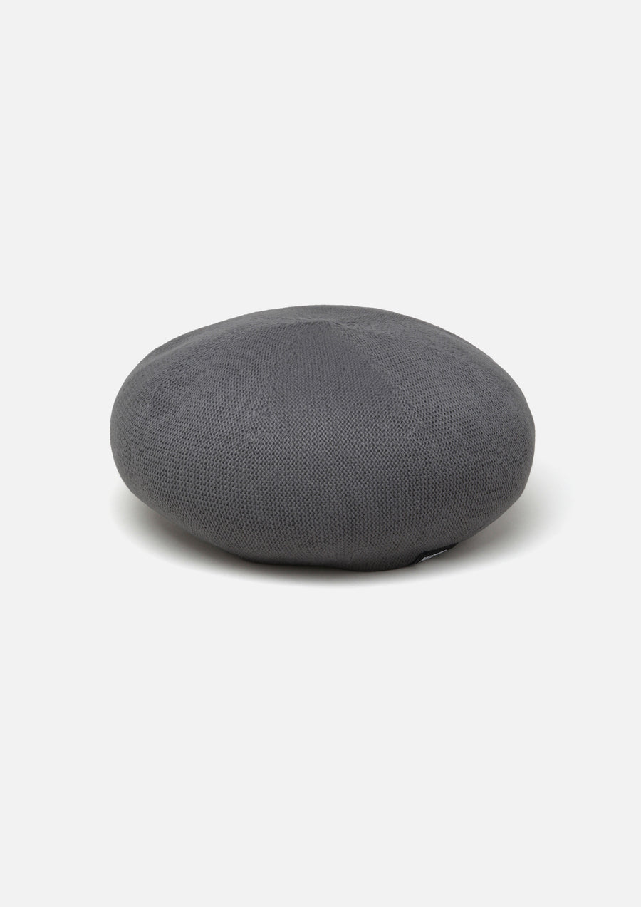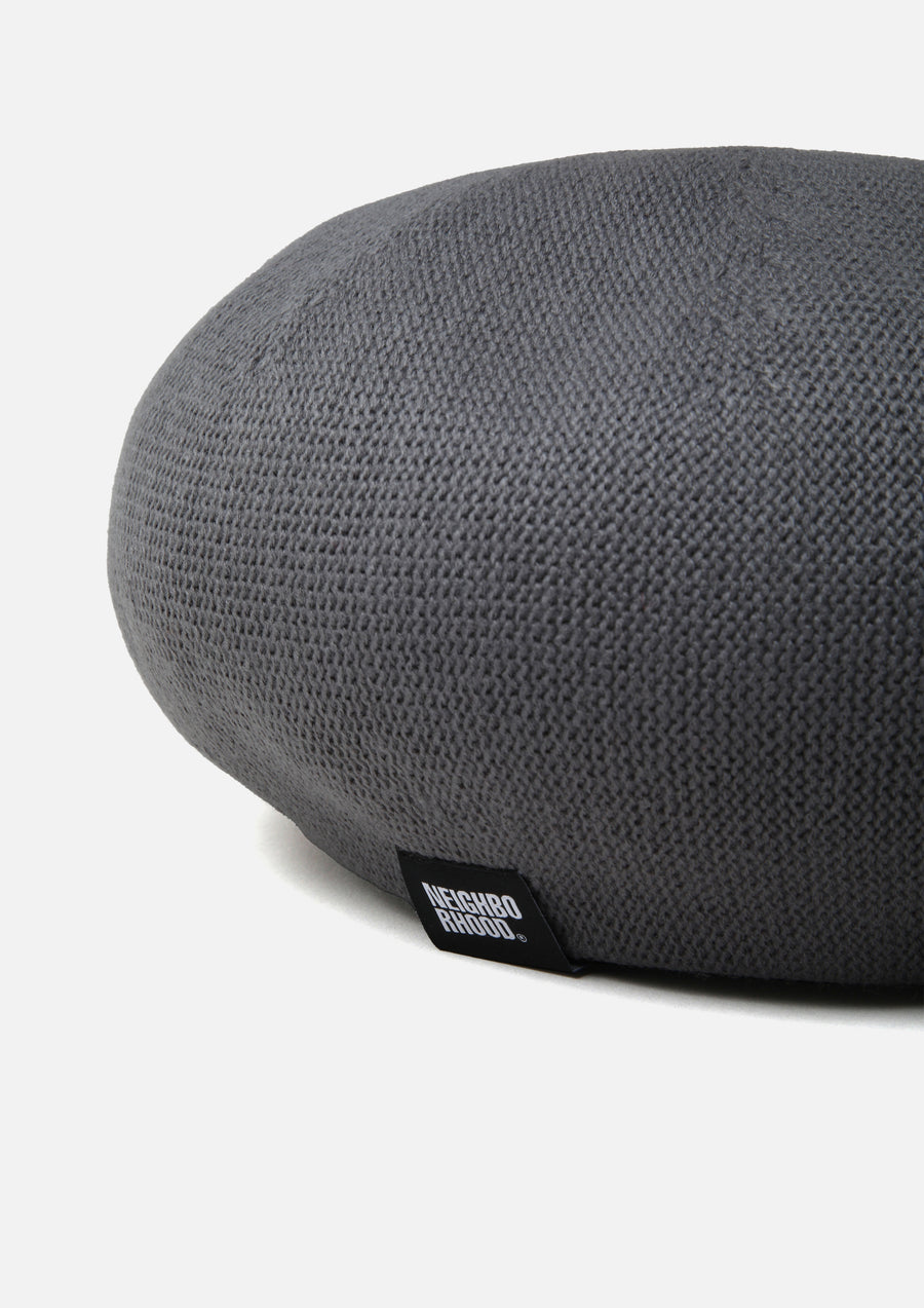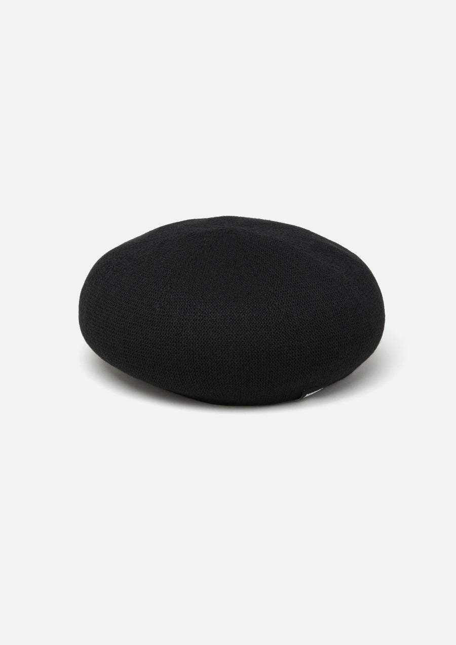 A knit beret made of acrylic knit material. A brand tag is placed on the left side.