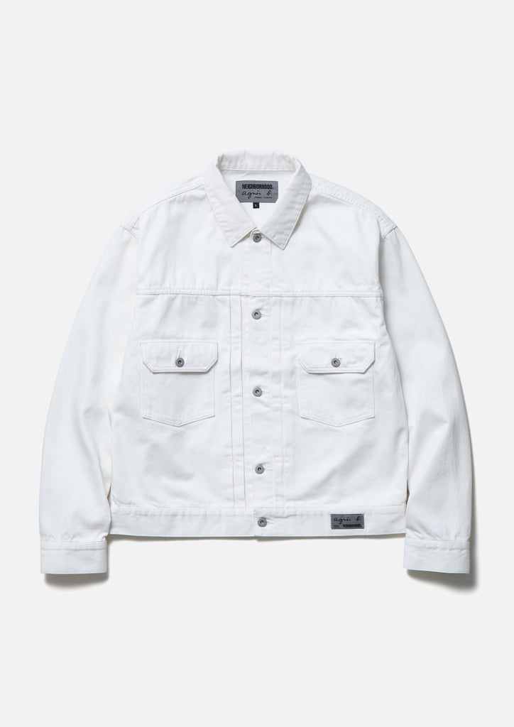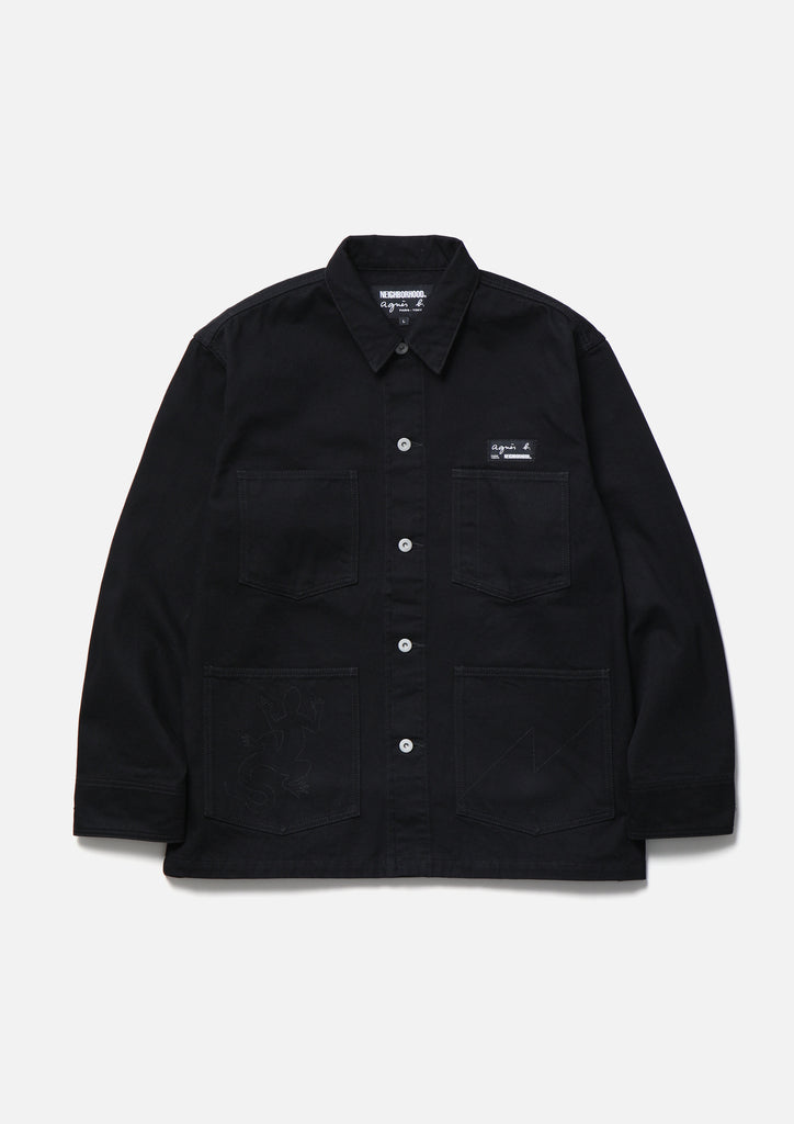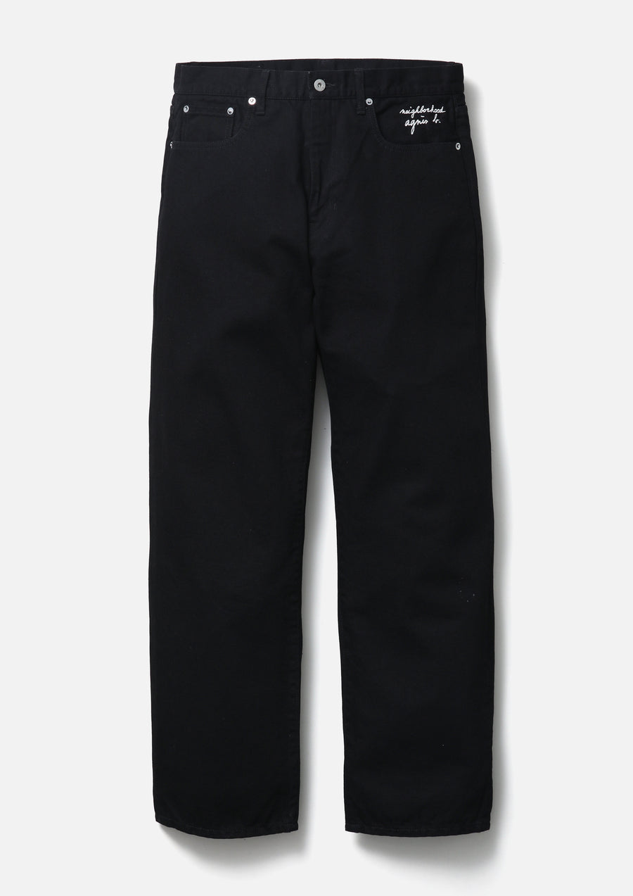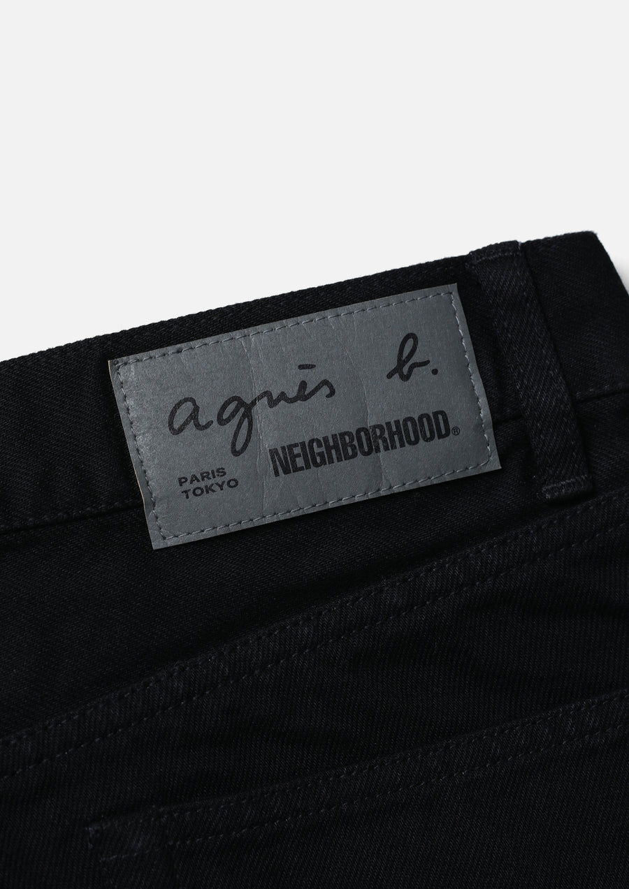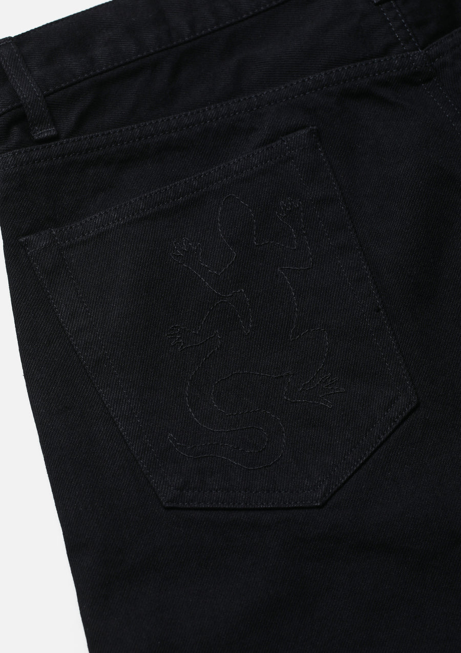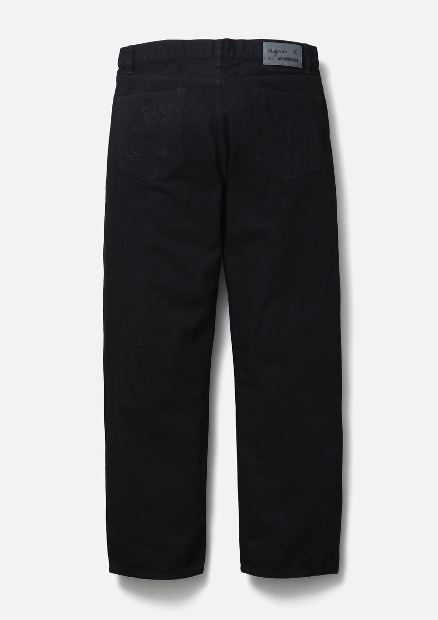 Straight-leg five-pocket pants in durable cotton with a tough finish. Embroidered with Agnès Troublé’s hand-written dual logos at the pocket opening. Back pocket features design-stitching of the iconic “N” and lézard (lizard) motif. Custom tack button and a paper waist patch. Collaboration with agnès b.