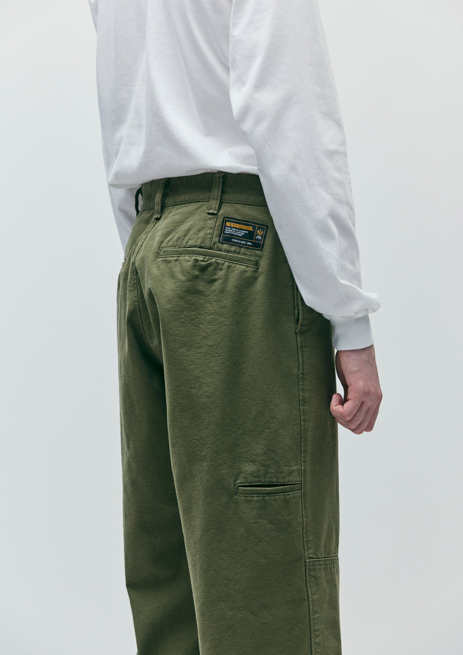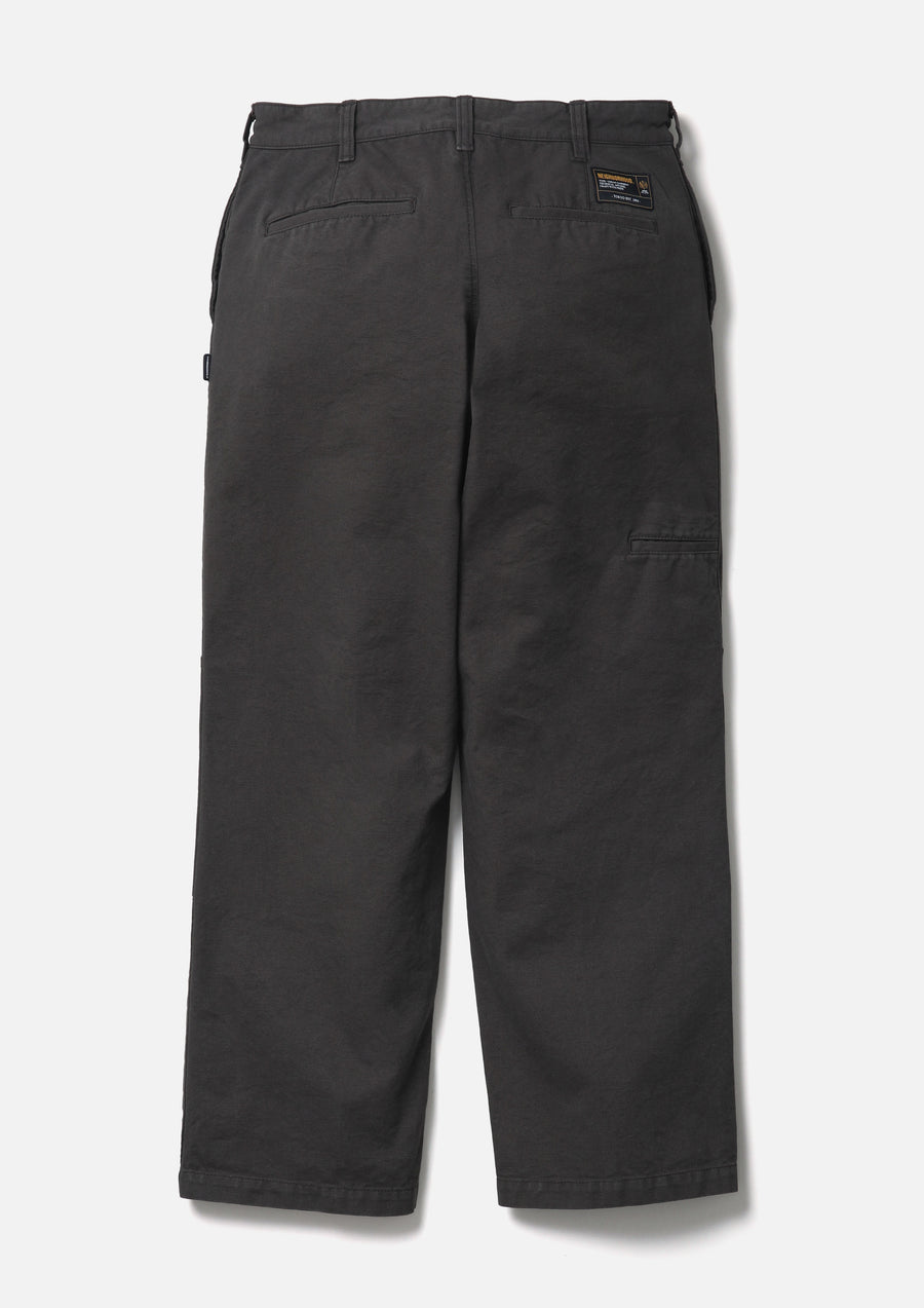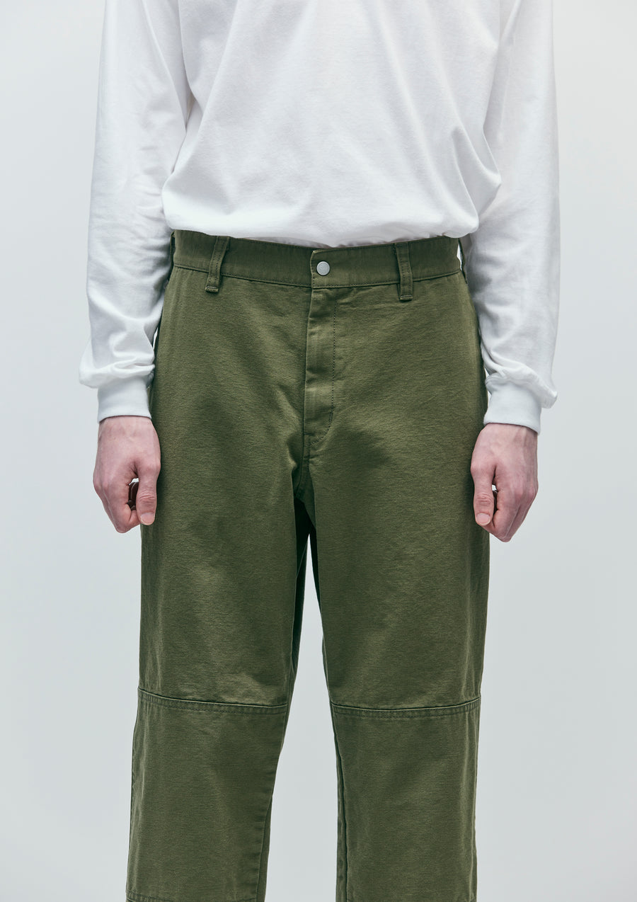 A pair of work pants made from highly durable duck fabric. Features a reinforced double-knee design for enhanced strength. Equipped with original snap buttons, a front zipper, and pocket lining fabric. Includes a brand tag above the hip pocket and side seam. Relaxed straight silhouette.