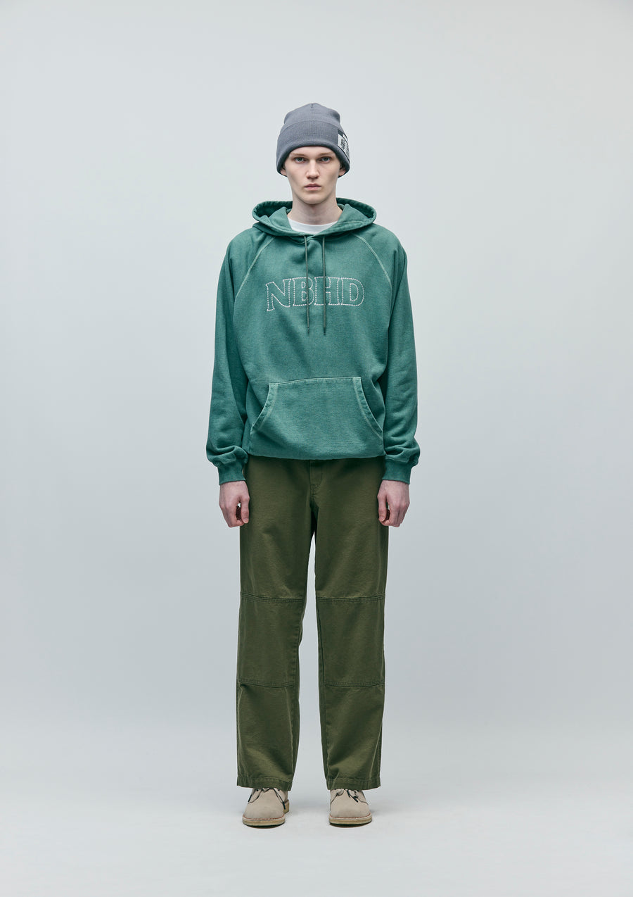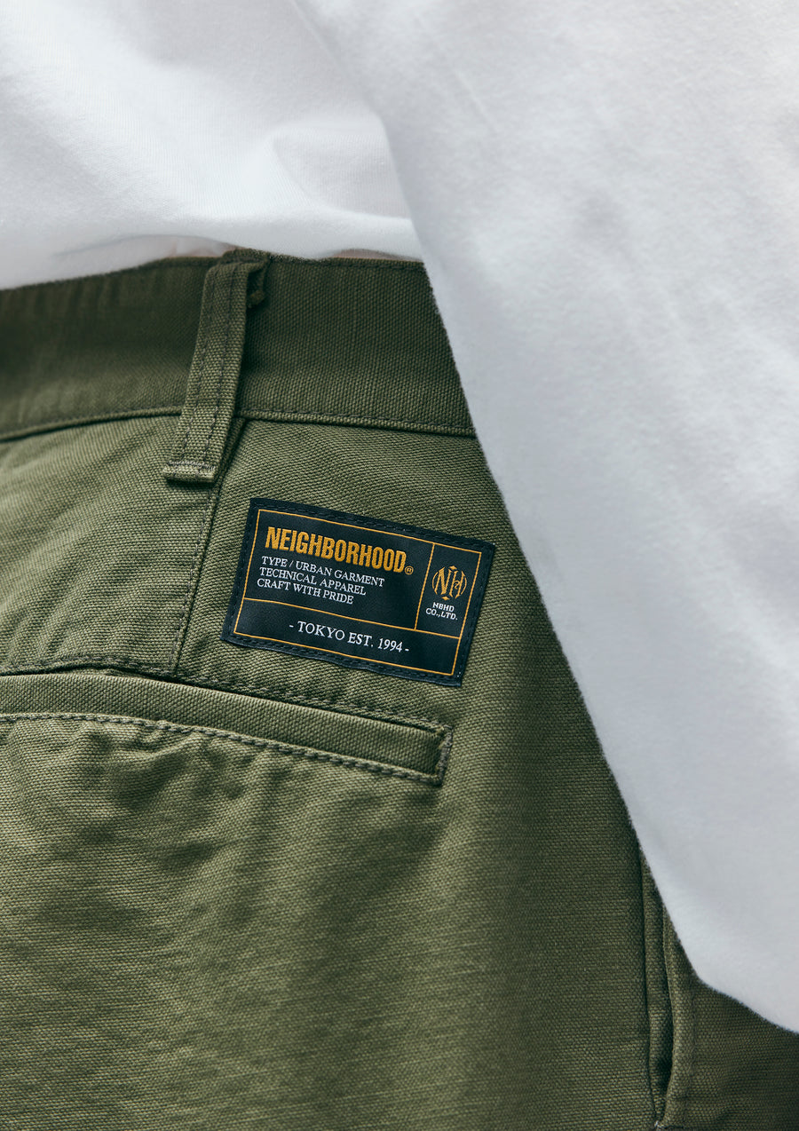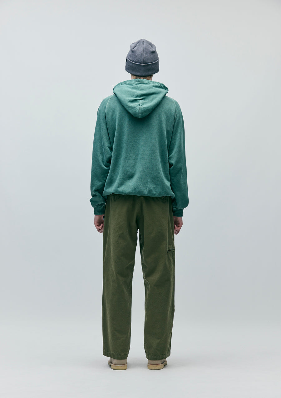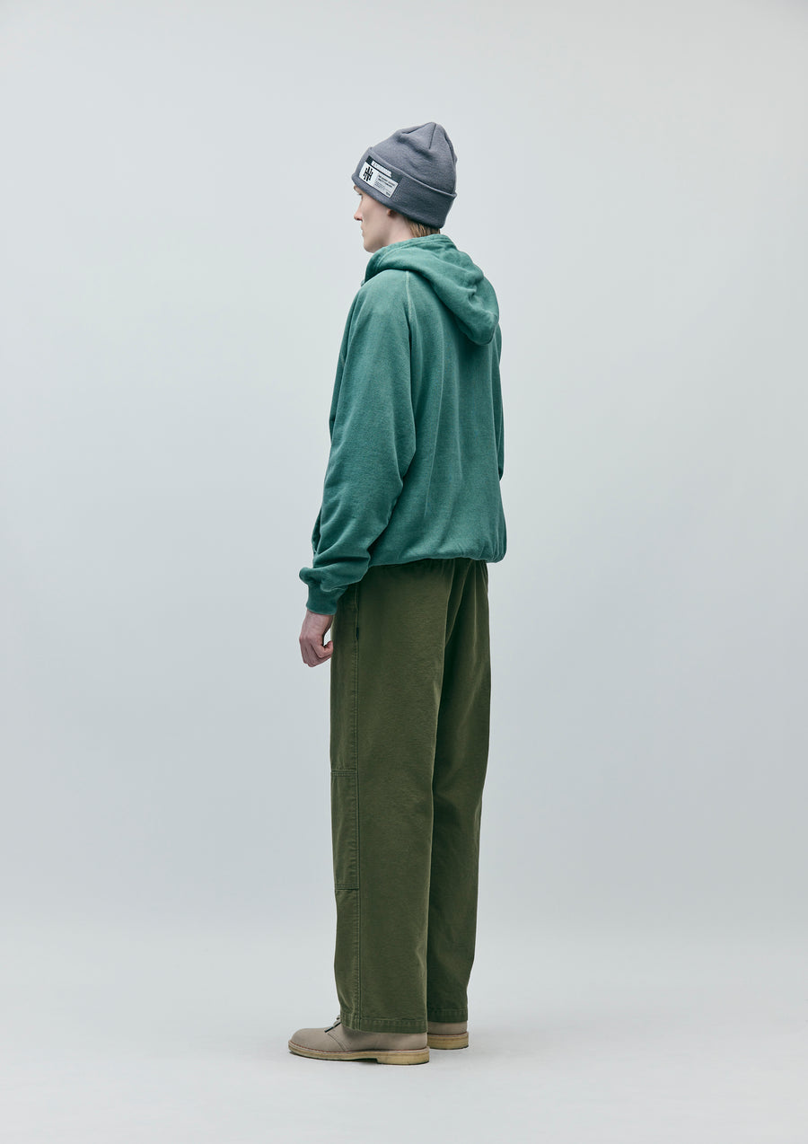 A pair of work pants made from highly durable duck fabric. Features a reinforced double-knee design for enhanced strength. Equipped with original snap buttons, a front zipper, and pocket lining fabric. Includes a brand tag above the hip pocket and side seam. Relaxed straight silhouette.