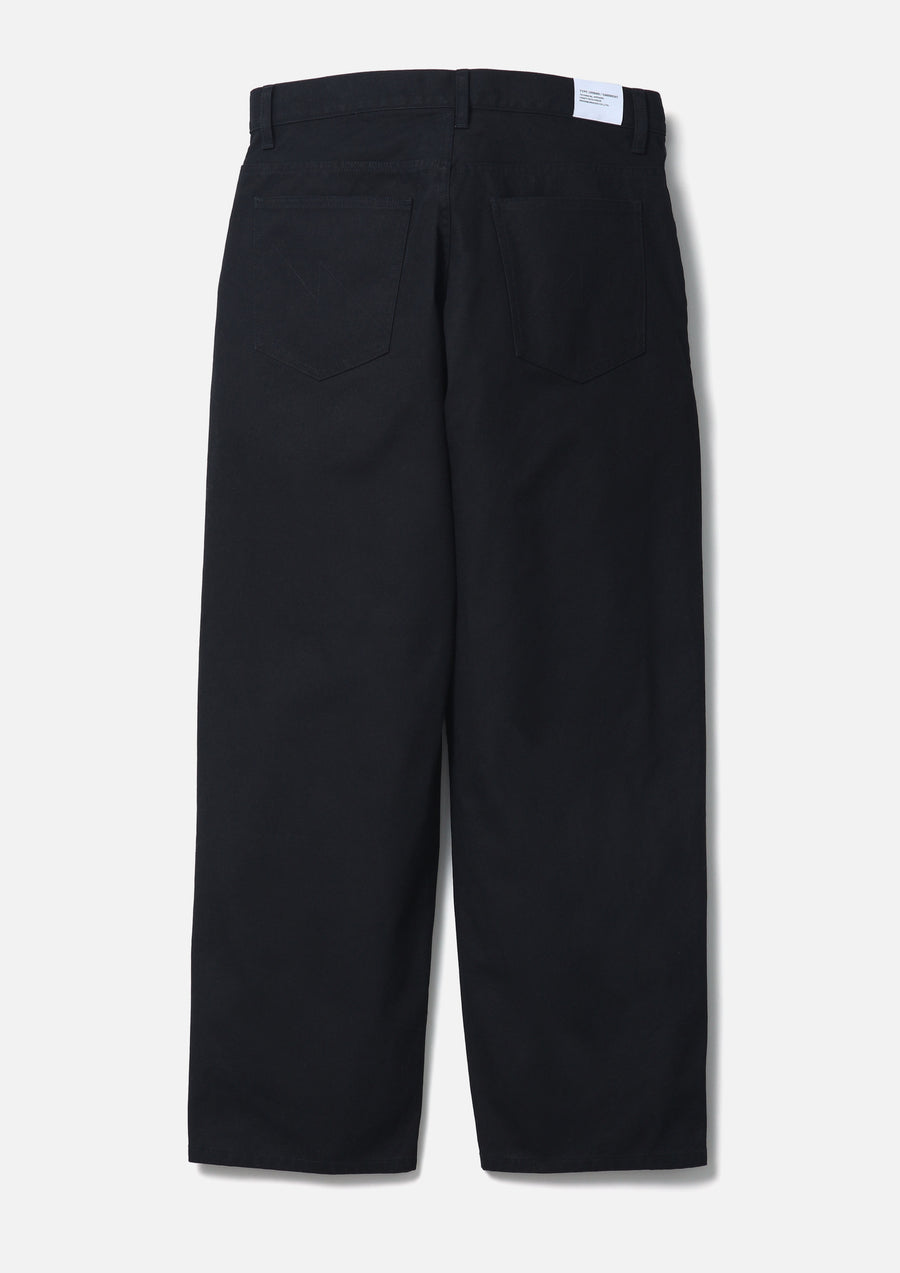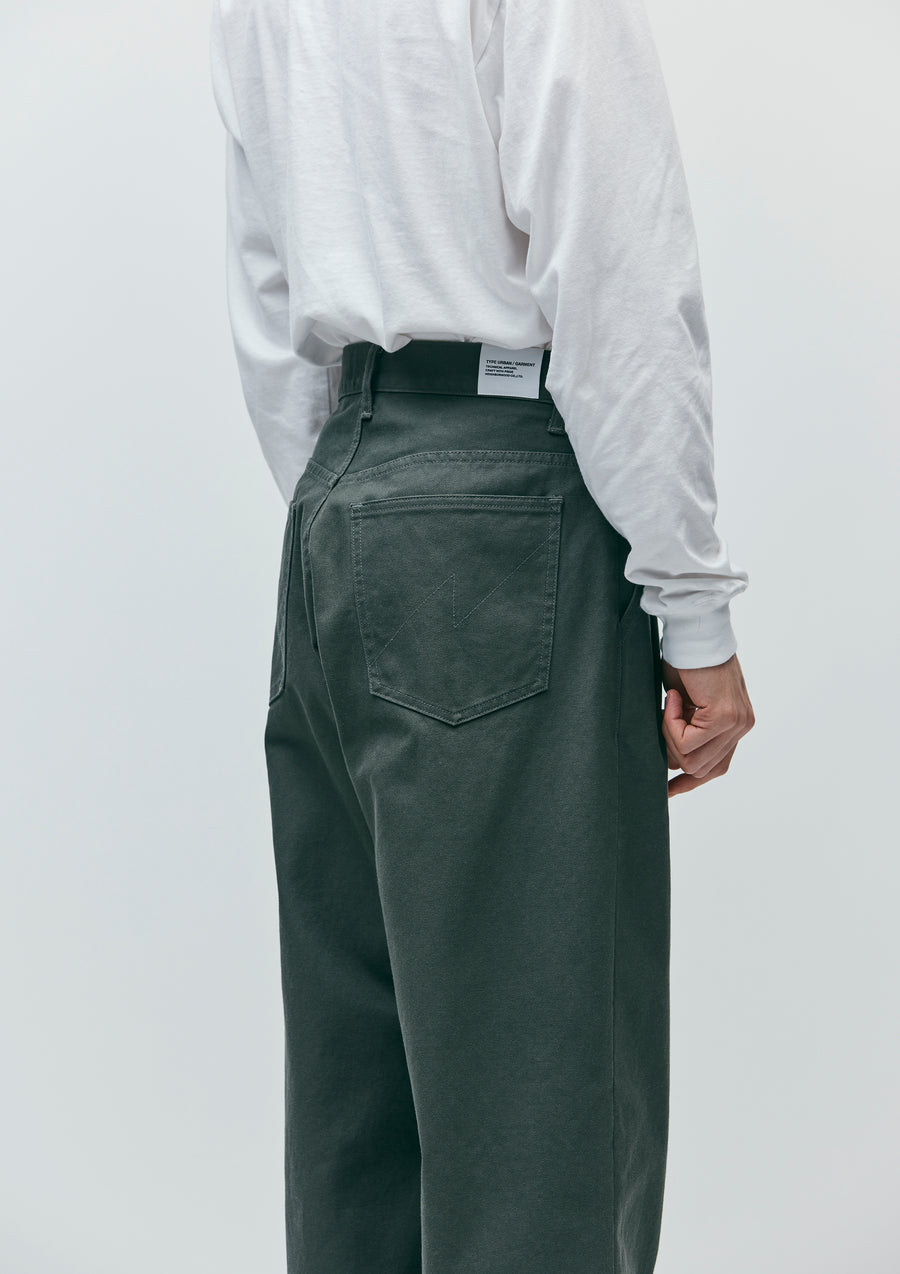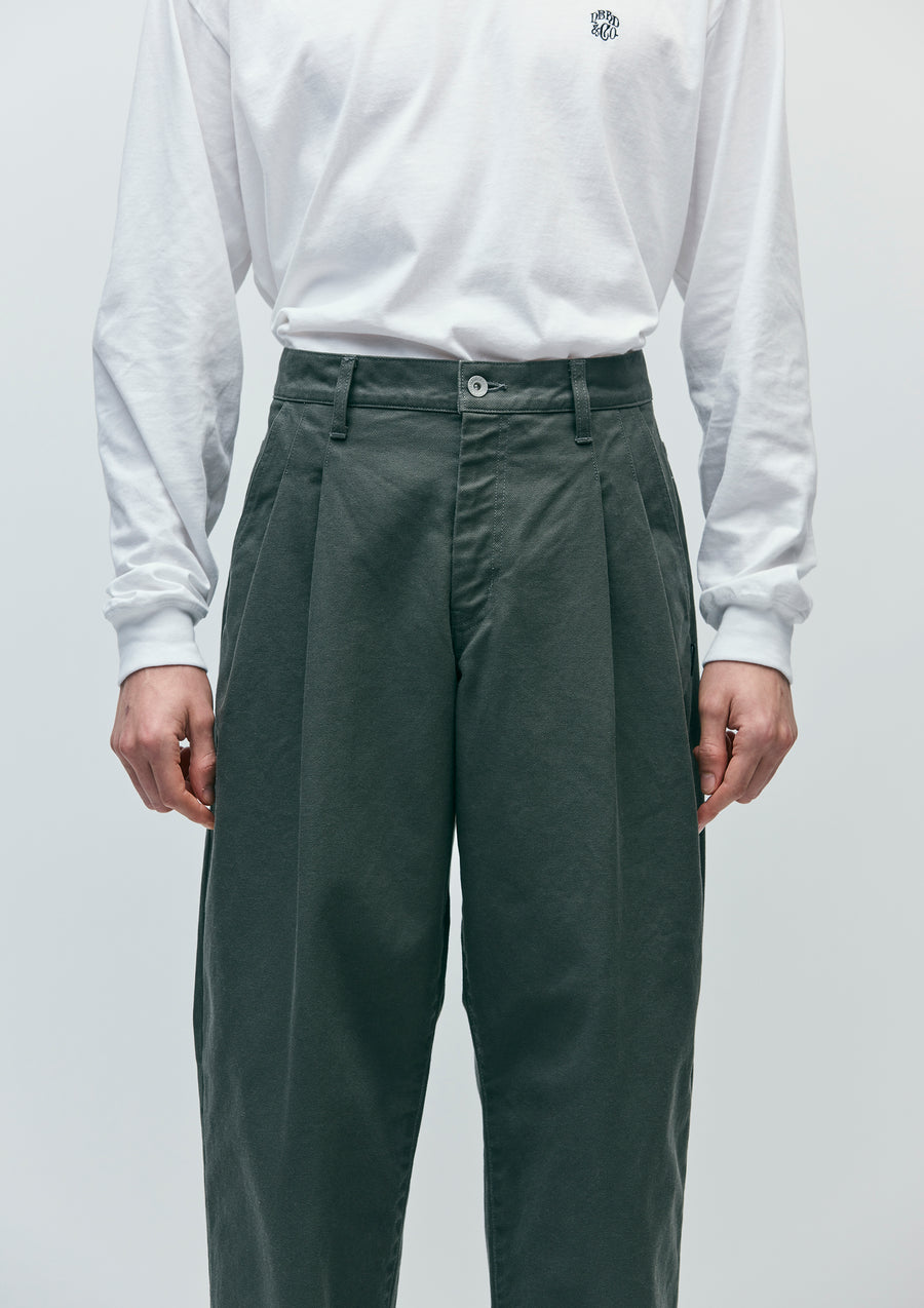 A pair of two-tuck pants made from thick serge fabric with a firm structure. Uses a non-stretch material that resists shape deformation. Features "N"-shaped design stitching on the hip pockets. Equipped with original tack buttons, a front zipper, and signature tape. Includes a brand tag on the back of the waistband and side seam. Relaxed silhouette.