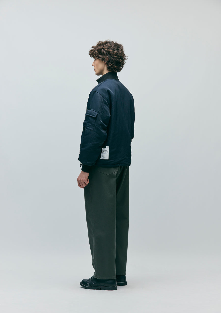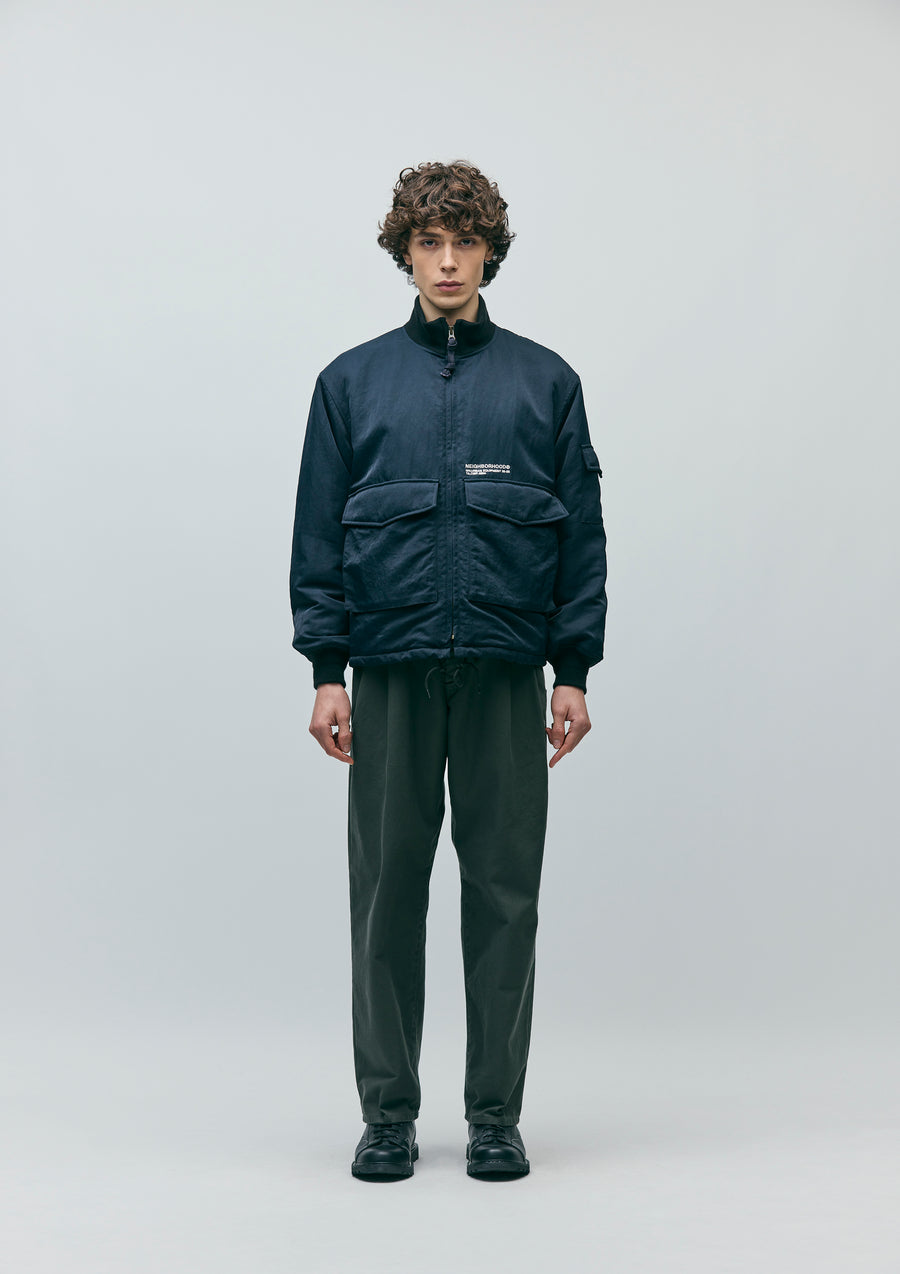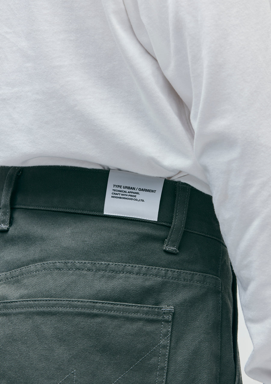 A pair of two-tuck pants made from thick serge fabric with a firm structure. Uses a non-stretch material that resists shape deformation. Features "N"-shaped design stitching on the hip pockets. Equipped with original tack buttons, a front zipper, and signature tape. Includes a brand tag on the back of the waistband and side seam. Relaxed silhouette.