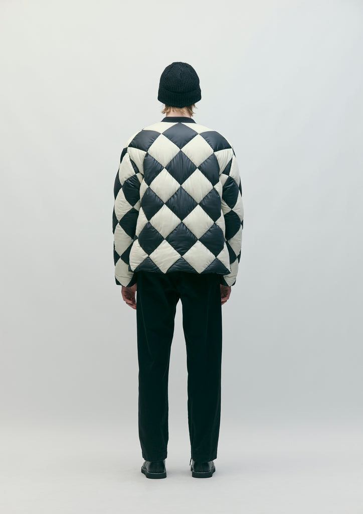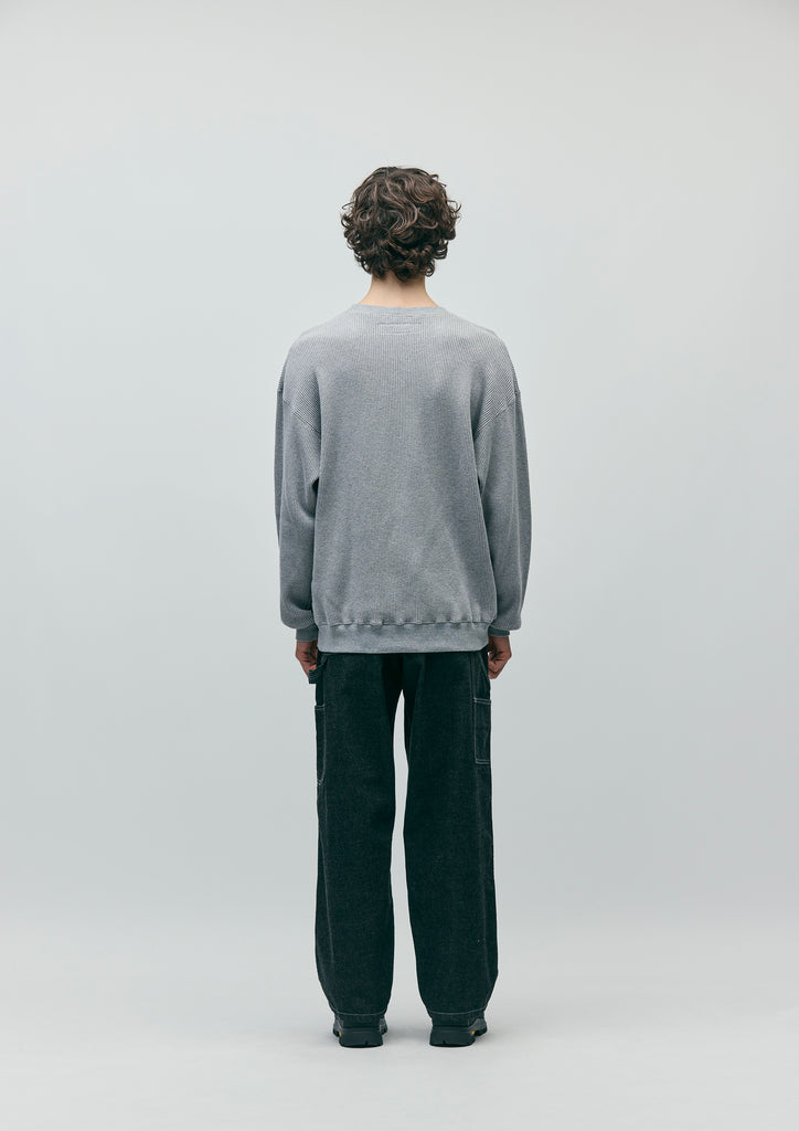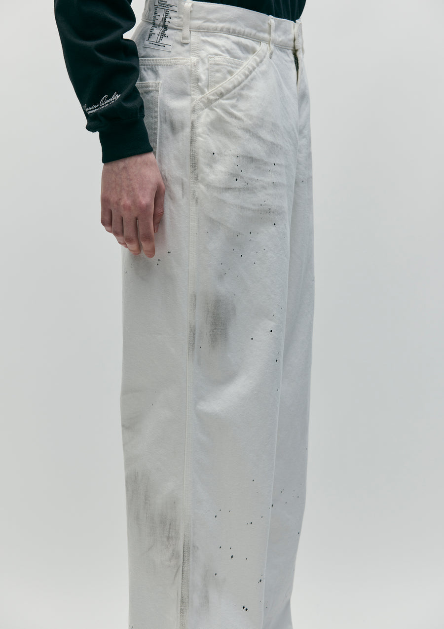 A pair of utility pants made from 12oz denim fabric. Features distress processing for a naturally aged look. The hip pockets feature "N"-shaped design stitching. Equipped with original tack buttons. Includes a special name tag exclusive to the "BLACK & WHITE" uniform-inspired series. Brand tags and size labels are color-matched to the main body. Relaxed silhouette.