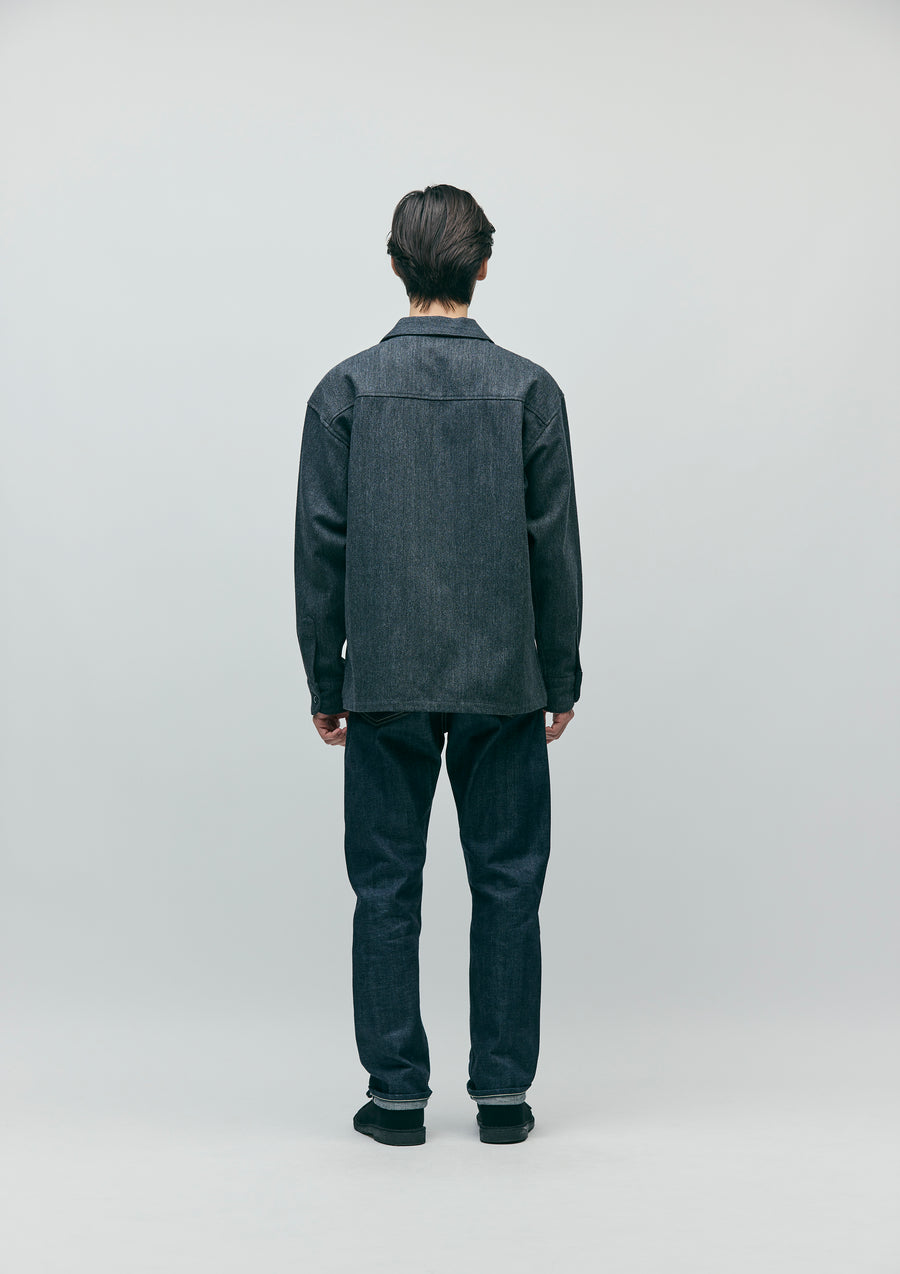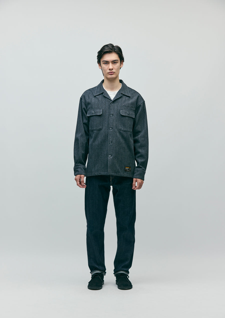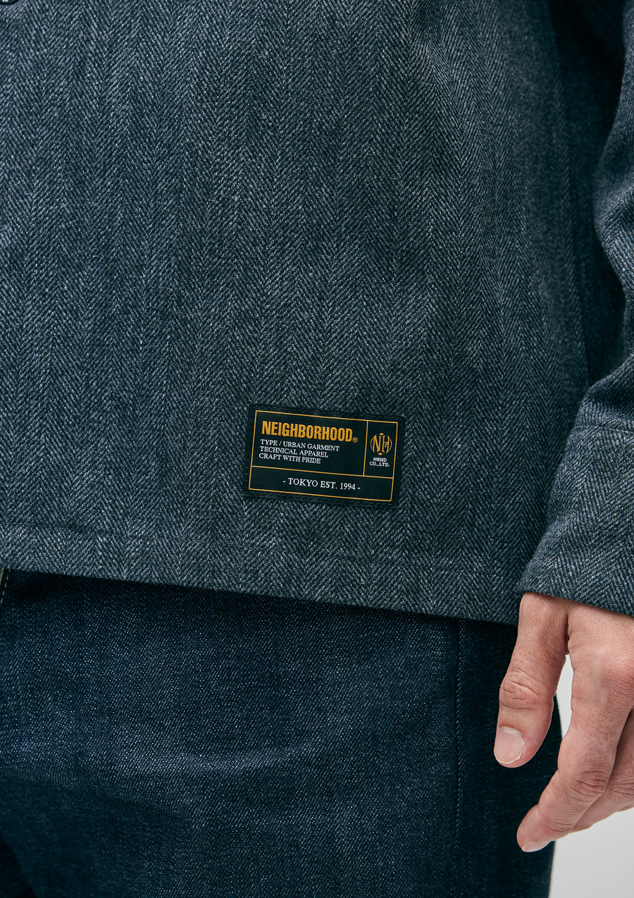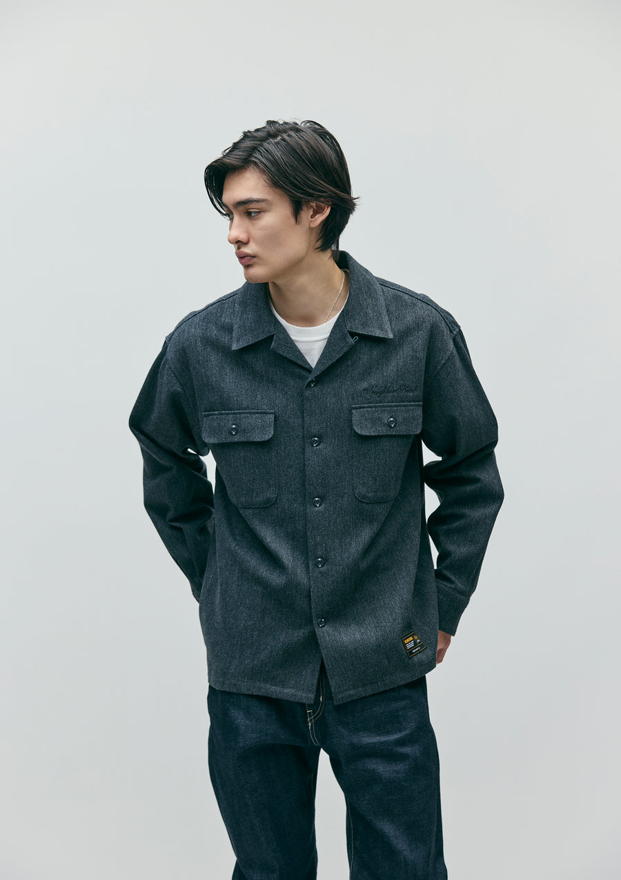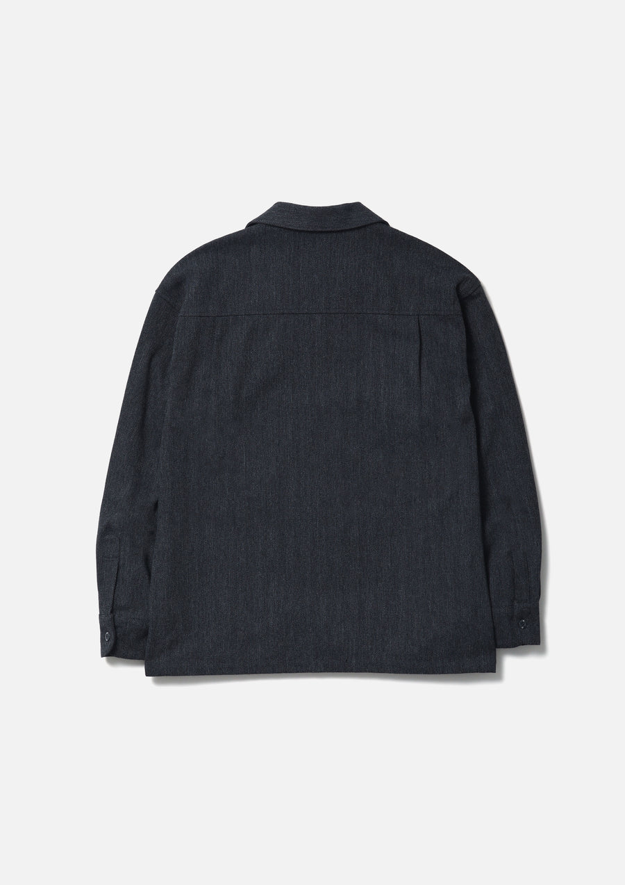 A cotton-wool shirt made from herringbone fabric using recycled wool for the warp, giving it a rough texture. Features an open-collar design with a loop for the first button. The yoke and flap have polyester lining. Embroidered logo on the chest. Equipped with original four-hole buttons, a brand tag on the left hem and side seam.